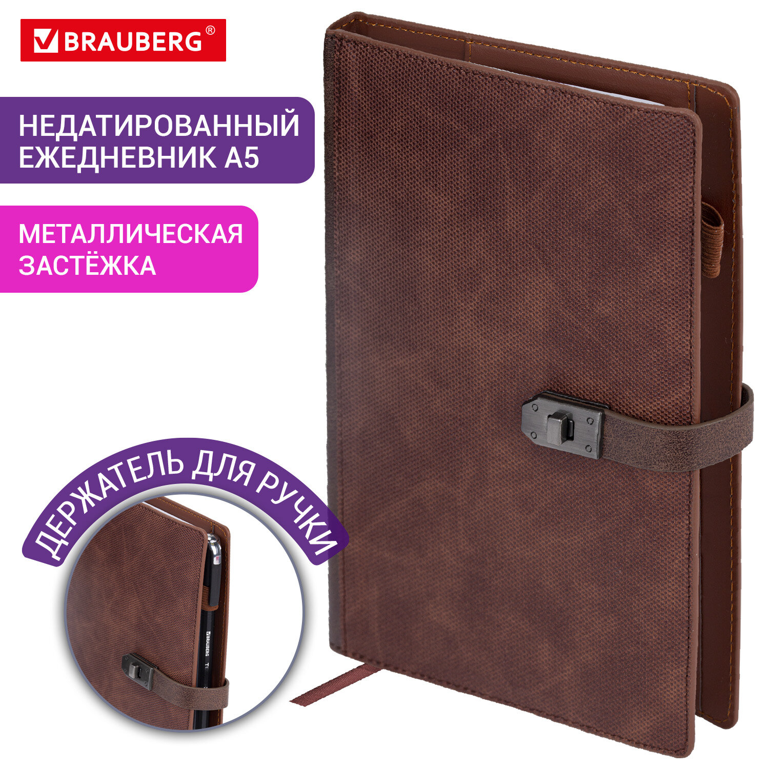 Ежедневник недатированный А5 152х220 мм BRAUBERG "Sirius", под кожу, застежка 160 л., коричневый Код товара: 116211 688 ₽ Купить Производитель:BRAUBERG Недатированный ежедневник BRAUBERG "Sirius" выполнен в оригинальном стиле. Подойдет каждому современному человеку для ведения различного рода записей. Внутренний блок включает 160 листов белой бумаги плотностью 70 г/м2. Каждая страничка имеет перфорированный угол. Благодаря классическому формату А5 (152х220 мм) ежедневник удобно использовать как в офисе, так и на выездных деловых встречах. Твердая обложка стилизована под текстурную кожу. Материал обложки подходит для горячего тиснения. Ежедневник фиксируется застежкой-ремешком, поэтому не откроется в сумке или портфеле и страницы не помнутся. Дополнениями являются закладка-ляссе, с помощью которой при необходимости можно быстро открыть ежедневник на нужной странице, и держатель для ручки. Имеется органайзер с несколькими отделениями для карт, визиток или купюр. Справочный материал дополнительно расширяет функциональность ежедневника. В конце внутреннего блока есть 7 страниц для записей и заметок.Производство: КитайТип ежедневника: недатированныйФормат: А5Обложка: под текстурную кожуВид обложки: твердая съемнаяКоличество листов: 160 шт.Особенности: закладка-ляссе, комбинированная обложка, перфорация уголков, прострочка по периметру, скругленные углы, справочная информация, фиксатор для ручкиСерия: SiriusТип застежки: ремешок и застёжкаОсновной цвет обложки: коричневыйДополнительный цвет обложки: нетЦвет среза: нетЦвет внутреннего блока: белыйПлотность внутреннего блока: 70 г/м2Высота строки для записи: 5 ммТип крепления: сшивкаПечать блока: 2 краскиПодходит для блинтового тиснения: даПодходит для тиснения фольгой: даДлина: 220 ммШирина: 152 ммТолщина: 21 ммВес: 495 грРазмер упаковки: 2.9 × 22.1 × 16.5 смОбъём: 0.0012 м3Промежуточная упаковка: 20 штТранспортная упаковка: 20 штШтрих-код: 4606224442709 Файлы Сертификат-1.jpg Сертификат-2.jpg Сертификат-3.jpg Сертификат-4.jpg Сертификат-5.jpg Сертификат-6.jpg Сертификат-7.jpg Сертификат-8.jpg Сертификат-9.jpg Сертификат-10.jpg Сертификат-11.jpg Сертификат-12.jpg Сертификат-13.jpg Сертификат-14.jpg Сертификат-15.jpg Сертификат-16.jpg Сертификат-17.jpg Сертификат-18.jpg Сертификат-19.jpg Сертификат-20.jpg Сертификат-21.jpg Сертификат-22.jpg Сертификат-23.jpg Сертификат-24.jpg Сертификат-25.jpg Сертификат-26.jpg