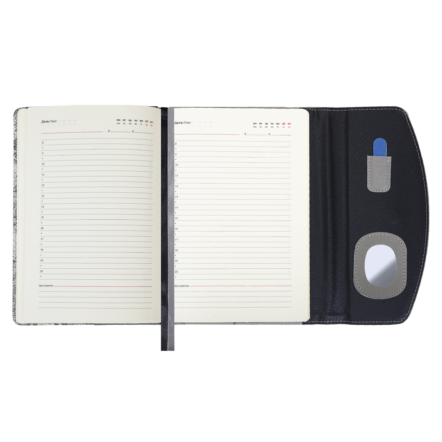 Ежедневник недатированный А5 155х213 мм BRAUBERG "Wild", под кожу, магнит, 160 л., SNAKE, серый, 116234 Код товара: 116234 763,22 ₽ Купить Производитель:BRAUBERG Недатированный ежедневник BRAUBERG в твёрдой обложке с анималистичным принтом и магнитным клапаном — стильное и компактное решение для эффективного планирования и создания имиджа пунктуального человека. Внутренний блок включает 160 листов кремовой бумаги плотностью 70 г/м2. Благодаря стандартному формату А5 ежедневник удобно использовать как в офисе, так и на выездных деловых встречах. Твердая обложка с блестками подходит для горячего тиснения. Также обложка фиксируется магнитным клапаном, поэтому ежедневник не откроется в сумке или портфеле и страницы не помнутся. Анималистичный принт придает изделию особый шарм. Дополнением служат 2 закладки-ляссе, с помощью которых можно быстро найти нужную страницу. Кроме того, ежедневник снабжен обширным справочным материалом. В конце имеются 7 страниц для записей и заметок. Этот ежедневник порадует наличием держателя для ручки, небольшого зеркальца и пилки для ногтей. Недатированный ежедневник BRAUBERG станет отличным подарком к любому празднику и событию.Производство: КитайТип ежедневника: недатированныйФормат: А5Обложка: под фактурную кожу с блескомВид обложки: твердаяКоличество листов: 160 шт.Особенности: закладка-ляссе, комбинированная обложка, поролоновая прослойка, прострочка по периметру, скругленные углы, справочная информация, фиксатор для ручкиСерия: WildДизайн: SnakeТип застежки: магнитный клапанОсновной цвет обложки: серыйДополнительный цвет обложки: темно-серыйЦвет среза: кремовыйЦвет внутреннего блока: кремовыйПлотность внутреннего блока: 70 г/м2Высота строки для записи: 5 ммТип крепления: сшивкаПечать блока: 2 краскиПодходит для блинтового тиснения: даПодходит для тиснения фольгой: даДлина: 213 ммШирина: 155 ммТолщина: 24 ммВес: 490 грРазмер упаковки: 3.1 × 21.3 × 15.9 смОбъём: 0.0012 м3Промежуточная упаковка: 20 штТранспортная упаковка: 20 штШтрих-код: 4606224442938 Файлы Сертификат-1.jpg Сертификат-2.jpg Сертификат-3.jpg Сертификат-4.jpg Сертификат-5.jpg Сертификат-6.jpg Сертификат-7.jpg Сертификат-8.jpg Сертификат-9.jpg Сертификат-10.jpg Сертификат-11.jpg Сертификат-12.jpg Сертификат-13.jpg Сертификат-14.jpg Сертификат-15.jpg Сертификат-16.jpg Сертификат-17.jpg Сертификат-18.jpg Сертификат-19.jpg Сертификат-20.jpg Сертификат-21.jpg Сертификат-22.jpg Сертификат-23.jpg Сертификат-24.jpg Сертификат-25.jpg Сертификат-26.jpg