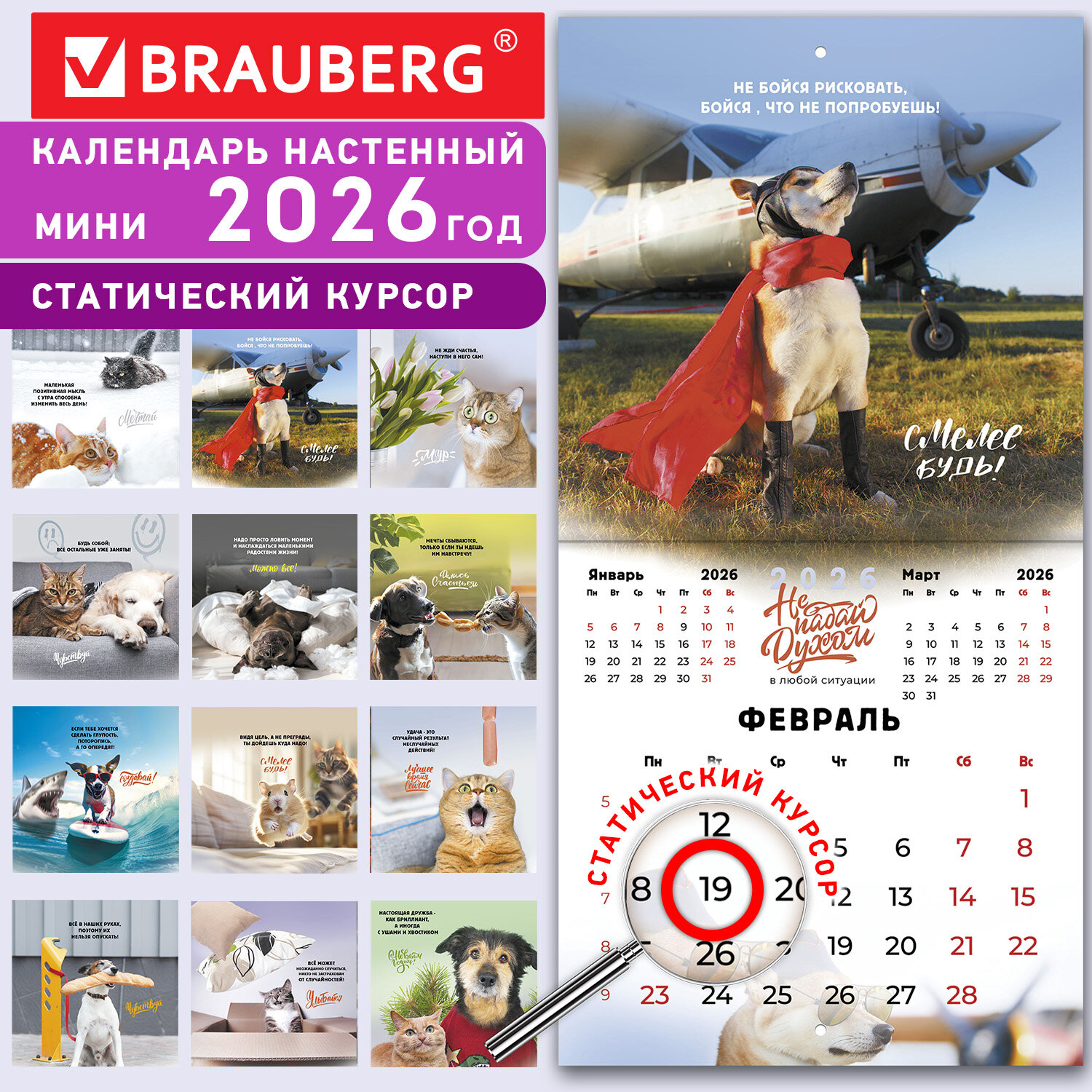 Календарь настенный перекидной 2026 г., BRAUBERG, 12 листов, 21,4х21,4 см, МИНИ, "Не падай духом" Код товара: 116942 183,35 ₽ Купить Производитель:BRAUBERG Настенный перекидной календарь BRAUBERG востребован в офисах, на предприятиях и дома. Сочетает функциональность и эстетическую привлекательность. Настенный календарь на скрепке, содержит 12 страниц. Яркая, красочная картинка дополнена календарной сеткой на месяц. Блок календаря напечатан на мелованной бумаге плотностью 130 г/м2. Оригинальная обложка изготовлена из мелованной бумаги плотностью 230 г/м2. Размер – 21,4х21,4 см, в развороте – 21,4х42,8 см. Дополнен отверстием для удобства крепления. Поставляется в индивидуальной упаковке (полибэг) с европодвесом и прокладкой из гофрокартона, что создает товару дополнительную защиту.Производство: КитайТип календаря: настенный перекиднойГод: 2026Тип скрепления: скрепкаРазмер: 21,4х21,4 смВнутренний блок: мелованная бумагаПлотность внутреннего блока: 130 г/м2Подложка: нетКурсор: даДизайн: Не падай духомКалендарная сетка: с разбивкой на месяцИндивидуальная упаковка: даВес: 112 грРазмер упаковки: 0.5 × 21.9 × 21.6 смОбъём: 0.0003 м3Промежуточная упаковка: 50 штТранспортная упаковка: 50 штШтрих-код: 4606224480169 Файлы Сертификат-1.jpg Сертификат-2.jpg Сертификат-3.jpg Сертификат-4.jpg Сертификат-5.jpg Сертификат-6.jpg Сертификат-7.jpg Сертификат-8.jpg Сертификат-9.jpg Сертификат-10.jpg Сертификат-11.jpg Сертификат-12.jpg Сертификат-13.jpg Сертификат-14.jpg Сертификат-15.jpg Сертификат-16.jpg Сертификат-17.jpg Сертификат-18.jpg Сертификат-19.jpg Сертификат-20.jpg Сертификат-21.jpg Сертификат-22.jpg Сертификат-23.jpg Сертификат-24.jpg Сертификат-25.jpg Сертификат-26.jpg
