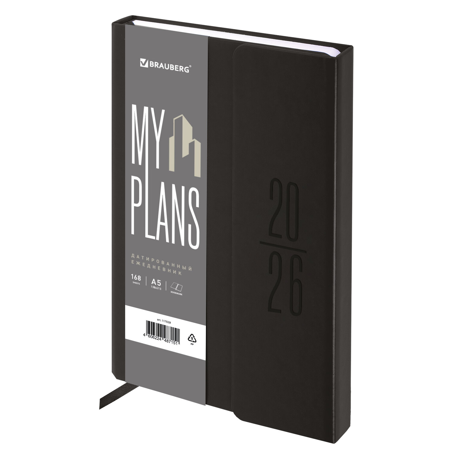 Ежедневник датированный 2026, А5, 138x213 мм, BRAUBERG "Towny", под кожу, клапан, черный Код товара: 117039 482,94 ₽ Купить Производитель:BRAUBERG Датированный ежедневник BRAUBERG "Towny" создан для тех, кто ценит порядок во всех сферах жизни и предпочитает деловой стиль без избыточных акцентов. Внутренний блок включает 168 листов белой бумаги плотностью 70 г/м2. Каждая страничка имеет перфорированный угол. Благодаря стандартному формату А5 (138х213 мм) ежедневник удобно использовать как в офисе, так и на выездных деловых встречах. Твердая обложка, стилизованная под гладкую кожу, фиксируется магнитным клапаном, поэтому ежедневник не откроется самопроизвольно в сумке или портфеле и страницы не помнутся. Подходит для горячего тиснения. Также предусмотрена закладка-ляссе для быстрого доступа к нужной странице. Справочный материал дополнительно расширяет функциональность ежедневника. В конце внутреннего блока есть 4 страницы для записей и заметок. Датированный ежедневник BRAUBERG "Towny" идеально подойдет для офисных работников и людей, занимающихся бизнесом.Производство: КитайТип ежедневника: датированныйФормат: А5Обложка: под гладкую кожуВид обложки: твердаяКоличество листов: 168 шт.Особенности: закладка-ляссе, перфорация уголков, скругленные углы, справочная информацияСерия: TownyГод: 2026Тип застежки: магнитный клапанОсновной цвет обложки: черныйДополнительный цвет обложки: нетЦвет среза: белыйЦвет внутреннего блока: белыйПлотность внутреннего блока: 70 г/м2Высота строки для записи: 4 ммТип крепления: сшивкаПечать блока: 2 краскиПодходит для блинтового тиснения: даПодходит для тиснения фольгой: даПодходит для заливки полимерной смолой: даПодходит для УФ-печати: даПодходит для тампопечати: даДлина: 213 ммШирина: 138 ммТолщина: 20 ммВес: 482 грРазмер упаковки: 2.4 × 21.3 × 14.8 смОбъём: 0.0009 м3Промежуточная упаковка: 20 штТранспортная упаковка: 20 штШтрих-код: 4606224487151 Файлы Сертификат-1.jpg Сертификат-2.jpg Сертификат-3.jpg Сертификат-4.jpg Сертификат-5.jpg Сертификат-6.jpg Сертификат-7.jpg Сертификат-8.jpg Сертификат-9.jpg Сертификат-10.jpg Сертификат-11.jpg Сертификат-12.jpg Сертификат-13.jpg Сертификат-14.jpg Сертификат-15.jpg Сертификат-16.jpg Сертификат-17.jpg Сертификат-18.jpg Сертификат-19.jpg Сертификат-20.jpg Сертификат-21.jpg Сертификат-22.jpg Сертификат-23.jpg Сертификат-24.jpg Сертификат-25.jpg Сертификат-26.jpg