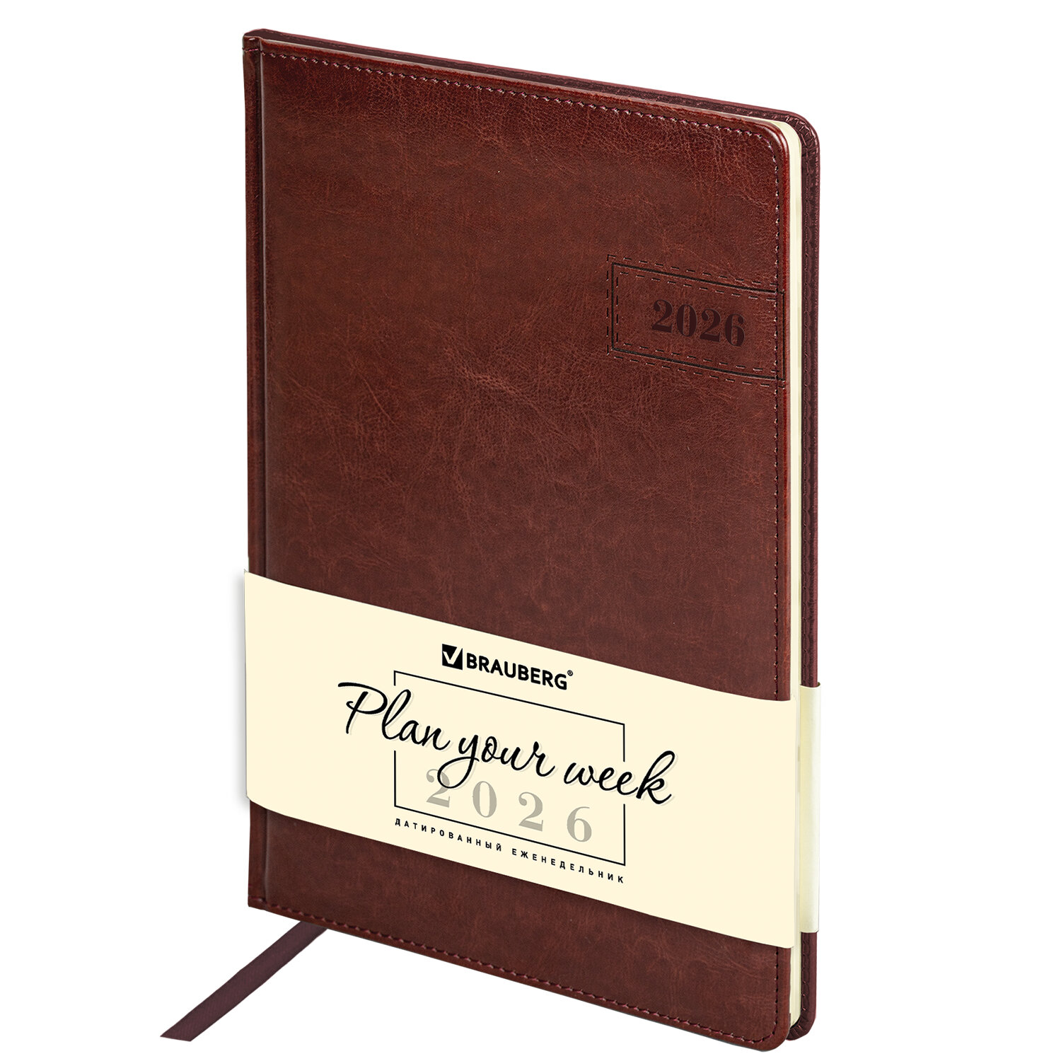 Еженедельник датированный 2026, БОЛЬШОЙ ФОРМАТ 210х297 мм, А4, BRAUBERG "Imperial", под кожу, коричневый Код товара: 117156 649,87 ₽ Купить Производитель:BRAUBERG Датированный еженедельник BRAUBERG "Imperial" выполнен в классическом дизайне. Мягкая обложка с легкой рельефной фактурой, прошитая по периметру, и непревзойденное качество исполнения воплощают поистине имперскую роскошь делового аксессуара. Внутренний блок включает 64 листа кремовой бумаги плотностью 70 г/м2. Благодаря большому формату А4 еженедельник удобно использовать как в офисе, так и на выездных деловых встречах. Твердая обложка, стилизованная под фактурную кожу коричневого цвета, подходит для горячего тиснения. Дополнением является закладка-ляссе, с помощью которой при необходимости можно быстро открыть еженедельник на нужной странице. В конце внутреннего блока есть 7 страниц для записей и заметок. Обширный справочный материал расширяет функциональность еженедельника. Датированный еженедельник BRAUBERG "Imperial" идеально подойдет для офисных работников и людей, занимающихся бизнесом.Производство: КитайТип еженедельника: датированныйСерия: ImperialГод: 2026Формат: А4Обложка: под гладкую кожуКоличество листов: 64 шт.Особенности: закладка-ляссе, поролоновая прослойка, прострочка по периметру, скругленные углы, справочная информацияТип застежки: нетОсновной цвет обложки: коричневыйДополнительный цвет обложки: нетЦвет внутреннего блока: кремовыйПлотность внутренного блока: 70 г/м2Тип крепления: сшивкаПечать блока: 2 краскиПодходит для блинтового тиснения: даПодходит для тиснения фольгой: даПодходит для заливки полимерной смолой: даПодходит для УФ-печати: даПодходит для тампопечати: даДлина: 297 ммШирина: 210 ммВес: 536 грРазмер упаковки: 1.5 × 29.7 × 21.3 смОбъём: 0.0013 м3Промежуточная упаковка: 24 штТранспортная упаковка: 24 штШтрих-код: 4606224490755 Файлы Сертификат-1.jpg Сертификат-2.jpg Сертификат-3.jpg Сертификат-4.jpg Сертификат-5.jpg Сертификат-6.jpg Сертификат-7.jpg Сертификат-8.jpg Сертификат-9.jpg Сертификат-10.jpg Сертификат-11.jpg Сертификат-12.jpg Сертификат-13.jpg Сертификат-14.jpg Сертификат-15.jpg Сертификат-16.jpg Сертификат-17.jpg Сертификат-18.jpg Сертификат-19.jpg Сертификат-20.jpg Сертификат-21.jpg Сертификат-22.jpg Сертификат-23.jpg Сертификат-24.jpg Сертификат-25.jpg Сертификат-26.jpg