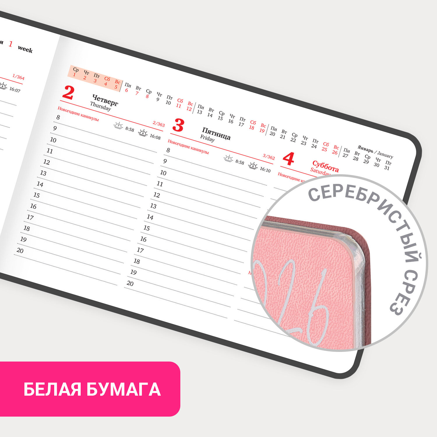 Еженедельник датированный 2026 МАЛЫЙ ФОРМАТ 105х160 мм, А6, BRAUBERG "Blaze", фольга, розовый Код товара: 117215 151,9 ₽ Купить Производитель:BRAUBERG Датированный еженедельник BRAUBERG "Blaze" выполнен в оригинальном дизайне. Гибкая обложка стилизована под фактурную кожу с блеском. Имеет книжную ориентацию. Внутренний блок включает 64 листа белой бумаги плотностью 70 г/м2. Благодаря малому формату А6 (105х160 мм) еженедельник удобно использовать как в офисе, так и на выездных деловых встречах. Гибкая обложка розового цвета, стилизованная под фактурную кожу с блеском, подходит для горячего тиснения. Дополнением является закладка-ляссе, с помощью которой при необходимости можно быстро открыть еженедельник на нужной странице. Для заметок в еженедельнике есть 7 страниц в конце внутреннего блока. Помимо прочего, еженедельник снабжен обширным справочным материалом. Датированный еженедельник BRAUBERG "Blaze" идеально подойдет для офисных работников и людей, занимающихся бизнесом, и ценящих свое драгоценное время.Производство: КитайТип еженедельника: датированныйСерия: BlazeГод: 2026Формат: А6Обложка: под фактурную кожуКоличество листов: 64 шт.Особенности: закладка-ляссе, скругленные углы, справочная информацияТип застежки: нетОсновной цвет обложки: розовыйДополнительный цвет обложки: нетЦветной срез: даЦвет внутреннего блока: белыйПлотность внутренного блока: 70 г/м2Тип крепления: сшивкаПечать блока: 2 краскиПодходит для блинтового тиснения: даПодходит для тиснения фольгой: даДлина: 160 ммШирина: 105 ммВес: 109 грРазмер упаковки: 1 × 16 × 10.8 смОбъём: 0.0002 м3Промежуточная упаковка: 36 штТранспортная упаковка: 36 штШтрих-код: 4606224491349 Файлы Сертификат-1.jpg Сертификат-2.jpg Сертификат-3.jpg Сертификат-4.jpg Сертификат-5.jpg Сертификат-6.jpg Сертификат-7.jpg Сертификат-8.jpg Сертификат-9.jpg Сертификат-10.jpg Сертификат-11.jpg Сертификат-12.jpg Сертификат-13.jpg Сертификат-14.jpg Сертификат-15.jpg Сертификат-16.jpg Сертификат-17.jpg Сертификат-18.jpg Сертификат-19.jpg Сертификат-20.jpg Сертификат-21.jpg Сертификат-22.jpg Сертификат-23.jpg Сертификат-24.jpg Сертификат-25.jpg Сертификат-26.jpg