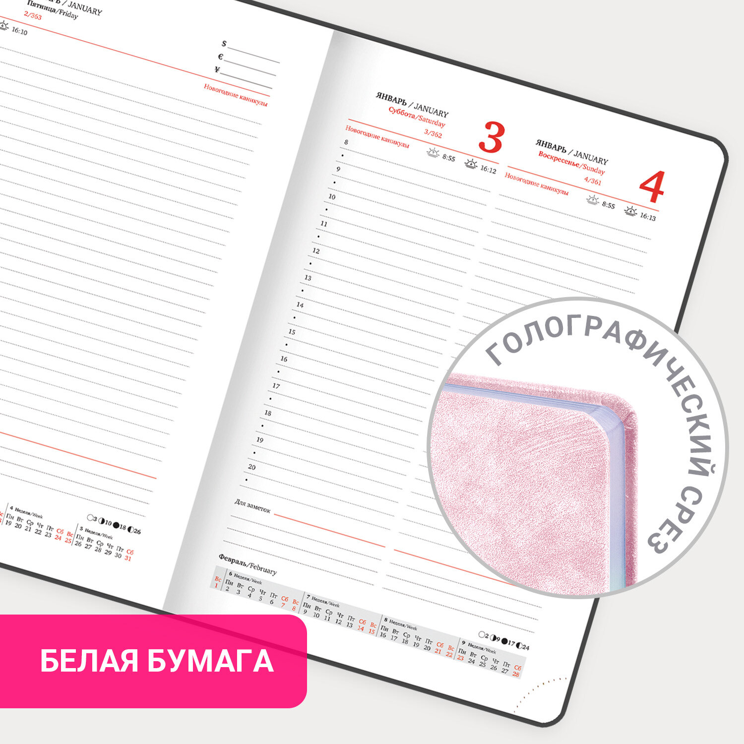 Ежедневник датированный 2026 А5 138х213 мм, BRAUBERG "Ice", под кожу, розовый Код товара: 117390 288,76 ₽ Купить Производитель:BRAUBERG Ежедневник датированный BRAUBERG "Ice" создан для тех, кому планирование дороже, чем импровизация. Внутренний блок включает 168 листов белой бумаги плотностью 70 г/м2. Каждая страничка имеет перфорированный угол. Благодаря стандартному формату А5 (138х213 мм) датированный ежедневник удобно использовать как в офисе, так и на выездных деловых встречах. Твердая обложка стилизована под текстурную кожу с шиммером. Подходит для горячего тиснения. Дополнением является закладка-ляссе, с помощью которой при необходимости можно быстро открыть ежедневник на нужной странице. Ежедневник снабжен справочным материалом. В конце есть 4 страницы для записей и заметок.Производство: КитайТип ежедневника: датированныйФормат: А5Обложка: под текстурную кожуВид обложки: твердаяКоличество листов: 168 шт.Особенности: закладка-ляссе, перфорация уголков, скругленные углы, справочная информацияСерия: IceГод: 2026Тип застежки: нетОсновной цвет обложки: розовыйДополнительный цвет обложки: нетЦвет среза: голографическийЦвет внутреннего блока: белыйПлотность внутреннего блока: 70 г/м2Высота строки для записи: 4 ммТип крепления: сшивкаПечать блока: 2 краскиПодходит для блинтового тиснения: даПодходит для тиснения фольгой: даДлина: 213 ммШирина: 138 ммТолщина: 20 ммВес: 451 грРазмер упаковки: 2.3 × 21.8 × 14 смОбъём: 0.0009 м3Промежуточная упаковка: 20 штТранспортная упаковка: 20 штШтрих-код: 4606224489735 Файлы Сертификат-1.jpg Сертификат-2.jpg Сертификат-3.jpg Сертификат-4.jpg Сертификат-5.jpg Сертификат-6.jpg Сертификат-7.jpg Сертификат-8.jpg Сертификат-9.jpg Сертификат-10.jpg Сертификат-11.jpg Сертификат-12.jpg Сертификат-13.jpg Сертификат-14.jpg Сертификат-15.jpg Сертификат-16.jpg Сертификат-17.jpg Сертификат-18.jpg Сертификат-19.jpg Сертификат-20.jpg Сертификат-21.jpg Сертификат-22.jpg Сертификат-23.jpg Сертификат-24.jpg Сертификат-25.jpg Сертификат-26.jpg