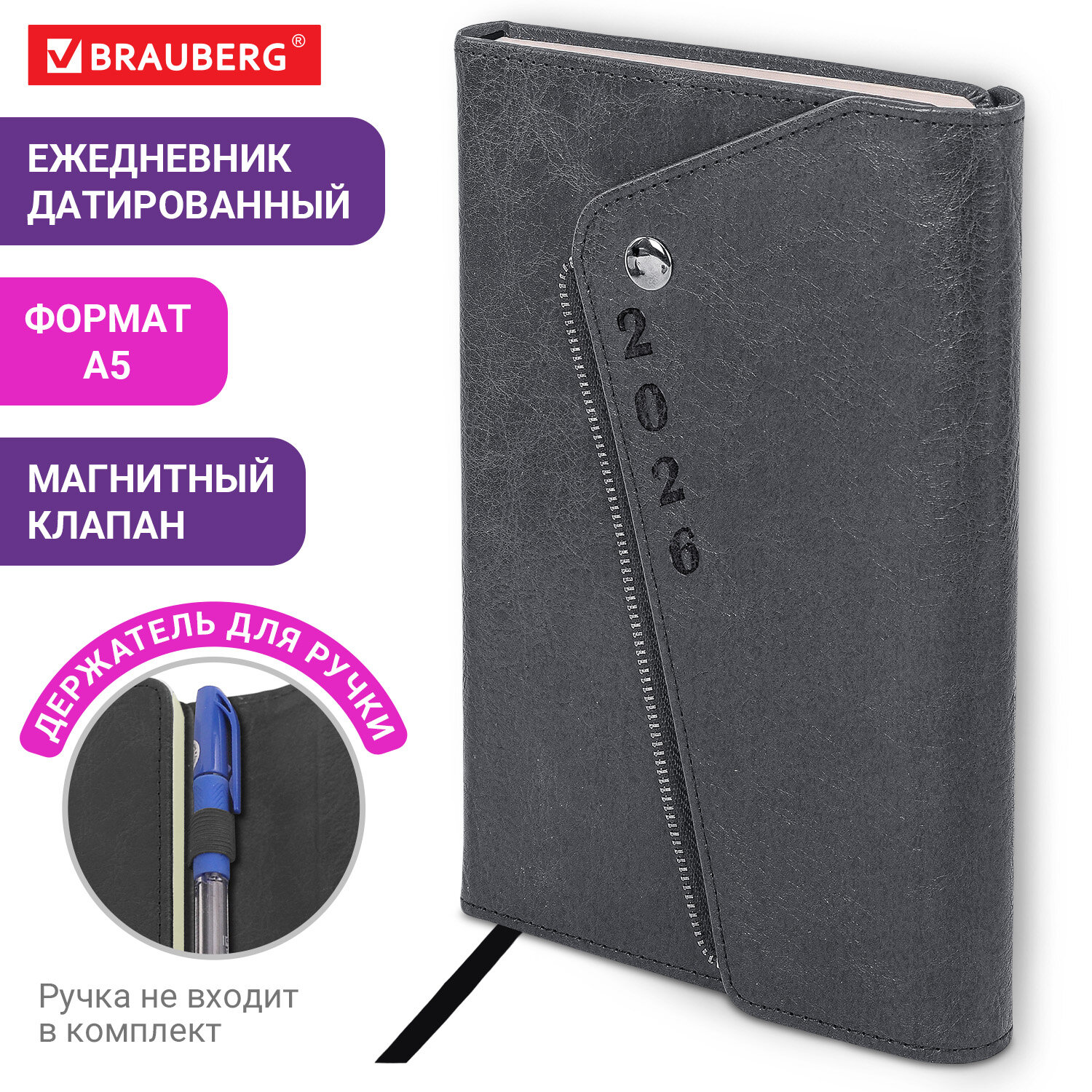 Ежедневник датированный 2026, А5, 145х213 мм, BRAUBERG "Jacket", под кожу, клапан, держатель, серый Код товара: 117403 489,72 ₽ Купить Производитель:BRAUBERG Датированный ежедневник BRAUBERG "Jacket" – это стильный и практичный аксессуар для планирования. Обложка из материала под кожу дополнена оригинальным асимметричным магнитным клапаном с кнопкой. Внутренний блок включает 168 листов кремовой бумаги плотностью 70 г/м2. Каждая страничка имеет перфорированный угол. Благодаря стандартному формату А5 (145х213 мм) датированный ежедневник удобно использовать как в офисе, так и на выездных деловых встречах. Твердая обложка стилизована под текстурную кожу и имеет интересную деталь в виде магнитного клапана декорированного молнией и кнопкой. Благодаря клапану ежедневник не откроется в сумке или портфеле. Подходит для горячего тиснения. Дополнениями являются закладка-ляссе, с помощью которой при необходимости можно быстро открыть ежедневник на нужной странице, и держатель для ручки. Справочный материал дополнительно расширяет функциональность ежедневника. В конце внутреннего блока есть 4 страницы для записей и заметок.Производство: КитайТип ежедневника: датированныйФормат: А5Обложка: под текстурную кожуВид обложки: твердаяКоличество листов: 168 шт.Особенности: закладка-ляссе, перфорация уголков, скругленные углы, справочная информация, фиксатор для ручкиСерия: JacketГод: 2026Тип застежки: магнитный клапанОсновной цвет обложки: серыйДополнительный цвет обложки: нетЦвет среза: нетЦвет внутреннего блока: кремовыйПлотность внутреннего блока: 70 г/м2Высота строки для записи: 4 ммТип крепления: сшивкаПечать блока: 2 краскиПодходит для блинтового тиснения: даПодходит для тиснения фольгой: даДлина: 213 ммШирина: 145 ммТолщина: 20 ммВес: 483 грРазмер упаковки: 2.8 × 21.6 × 15.1 смОбъём: 0.0011 м3Промежуточная упаковка: 20 штТранспортная упаковка: 20 штШтрих-код: 4606224489865 Файлы Сертификат-1.jpg Сертификат-2.jpg Сертификат-3.jpg Сертификат-4.jpg Сертификат-5.jpg Сертификат-6.jpg Сертификат-7.jpg Сертификат-8.jpg Сертификат-9.jpg Сертификат-10.jpg Сертификат-11.jpg Сертификат-12.jpg Сертификат-13.jpg Сертификат-14.jpg Сертификат-15.jpg Сертификат-16.jpg Сертификат-17.jpg Сертификат-18.jpg Сертификат-19.jpg Сертификат-20.jpg Сертификат-21.jpg Сертификат-22.jpg Сертификат-23.jpg Сертификат-24.jpg Сертификат-25.jpg Сертификат-26.jpg