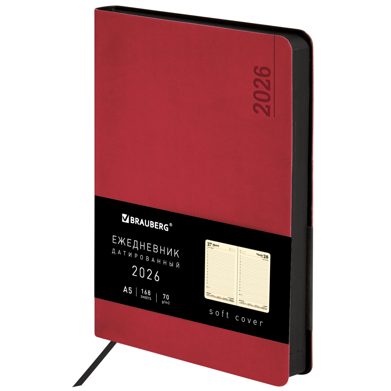Ежедневник датированный 2026 А5 138x213 мм, BRAUBERG "Metropolis Mix", под кожу, гибкий, красный Код товара: 117442 473,72 ₽ Купить Производитель:BRAUBERG Датированный ежедневник BRAUBERG "Metropolis Mix" выполнен в классическом стиле. Обложка из материала "под кожу" приятна на ощупь. Внутренний блок включает 168 листов кремовой бумаги плотностью 70 г/м2. Каждая страничка имеет перфорированный угол. Благодаря стандартному формату А5 (138х213 мм) ежедневник удобно использовать как в офисе, так и на выездных деловых встречах. Мягкая интегральная обложка стилизована под гладкую кожу благородного красного цвета. Материал обложки подходит для горячего тиснения. Срез и форзац ежедневника окрашены в контрастный с обложкой цвет, что придает изделию особый шарм. Дополнением является закладка-ляссе, с помощью которой при необходимости можно быстро открыть ежедневник на нужной странице. Ежедневник снабжен обширным справочным материалом. В конце есть 4 страницы для записей и заметок. Датированный ежедневник BRAUBERG "Metropolis Mix" идеально подойдет для офисных работников и людей, занимающихся бизнесом.Производство: КитайТип ежедневника: датированныйФормат: А5Обложка: под классическую кожуВид обложки: интегральнаяКоличество листов: 168 шт.Особенности: закладка-ляссе, перфорация уголков, скругленные углы, справочная информацияСерия: Metropolis MixГод: 2026Тип застежки: нетОсновной цвет обложки: красныйДополнительный цвет обложки: нетЦвет среза: черныйЦвет внутреннего блока: кремовыйПлотность внутреннего блока: 70 г/м2Высота строки для записи: 4 ммТип крепления: сшивкаПечать блока: 2 краскиПодходит для блинтового тиснения: даПодходит для тиснения фольгой: даПодходит для заливки полимерной смолой: даПодходит для УФ-печати: даПодходит для тампопечати: даДлина: 213 ммШирина: 138 ммТолщина: 18 ммВес: 397 грРазмер упаковки: 1.8 × 21.2 × 13.9 смОбъём: 0.0007 м3Промежуточная упаковка: 20 штТранспортная упаковка: 20 штШтрих-код: 4606224488691 Файлы Сертификат-1.jpg Сертификат-2.jpg Сертификат-3.jpg Сертификат-4.jpg Сертификат-5.jpg Сертификат-6.jpg Сертификат-7.jpg Сертификат-8.jpg Сертификат-9.jpg Сертификат-10.jpg Сертификат-11.jpg Сертификат-12.jpg Сертификат-13.jpg Сертификат-14.jpg Сертификат-15.jpg Сертификат-16.jpg Сертификат-17.jpg Сертификат-18.jpg Сертификат-19.jpg Сертификат-20.jpg Сертификат-21.jpg Сертификат-22.jpg Сертификат-23.jpg Сертификат-24.jpg Сертификат-25.jpg Сертификат-26.jpg