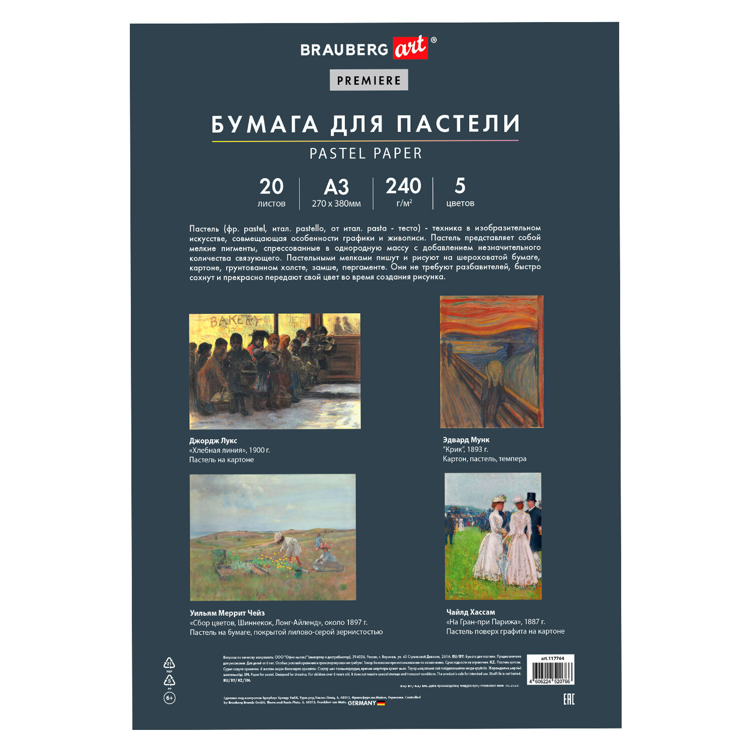 Бумага для пастели АБРАЗИВНАЯ А3 в папке, 20 листов 5 цветов, 240 г/м2, BRAUBERG ART Код товара: 117764 764,9 ₽ Купить Производитель:BRAUBERG Бумага для пастели BRAUBERG предназначена для различных техник рисования. Позволяет создавать мягкие и детализированные текстуры на картинах, а при более плотной зарисовке пастель выглядит ярко и сочно. Окрашенная в массе бумага в 5 популярных цветах высокой плотности 240 г/м2 гарантирует превосходное сохранение работ. Еще одним преимуществом является наличие ярко выраженной абразивной фактуры, что не маловажно для создания рисунка пастелью. Данная фактура бумаги гарантирует идеальное сцепление материала (удерживает больше пигмента, чем обычная пастельная бумага, что позволяет наносить больше слоёв без осыпания и добиваться насыщенных, глубоких цветов), дает возможность для тонкой детализации, лёгкого смешивания цветов и нанесения нескольких слоёв. Бумага упакована в картонную папку с ярким рисунком. Папка позволит сохранить Ваши рисунки во время транспортировки. В ней также удобно хранить готовые работы. Внутренний блок содержит 20 листов формата А3 (297х420 мм).Производство: КитайТип товара: бумага для пастелиКоличество листов: 20Формат: А3Тип скрепления: нетПлотность бумаги: 240 г/м2Серия: PREMIEREДлина: 420 ммШирина: 297 ммТонированная бумага: даБез кислот: даТиснение: АбразивнаяЦвет: ассортиИндивидуальная упаковка: даВес: 535 грРазмер упаковки: 0.9 × 29.7 × 42 смОбъём: 0.0012 м3Промежуточная упаковка: 15 штТранспортная упаковка: 15 штШтрих-код: 4606224520766 Файлы Сертификат-1.jpg