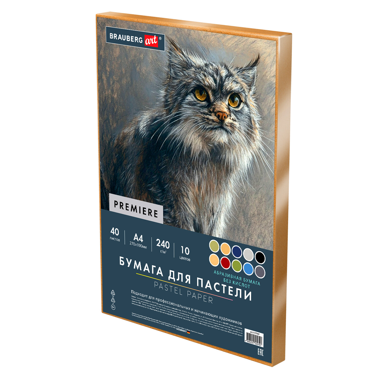 Бумага для пастели АБРАЗИВНАЯ А4 в коробке, 40 листов 8 цветов, 240 г/м2, BRAUBERG AR Код товара: 117767 732,17 ₽ Купить Производитель:BRAUBERG Бумага для пастели BRAUBERG предназначена для различных техник рисования. Позволяет создавать мягкие и детализированные текстуры на картинах, а при более плотной зарисовке пастель выглядит ярко и сочно. Окрашенная в массе бумага в 10 популярных цветах высокой плотности 240 г/м2 гарантирует превосходное сохранение работ. Еще одним преимуществом является наличие ярко выраженной абразивной фактуры, что не маловажно для создания рисунка пастелью. Данная фактура бумаги гарантирует идеальное сцепление материала (удерживает больше пигмента, чем обычная пастельная бумага, что позволяет наносить больше слоёв без осыпания и добиваться насыщенных, глубоких цветов), дает возможность для тонкой детализации, лёгкого смешивания цветов и нанесения нескольких слоёв. Бумага упакована в коробку из микрогофрокартона. Коробка позволит сохранить Ваши рисунки во время транспортировки. В ней также удобно хранить готовые работы. Внутренний блок содержит 40 листов формата А4 (210х297 мм).Производство: КитайТип товара: бумага для пастелиКоличество листов: 40Формат: А4Тип скрепления: нетПлотность бумаги: 240 г/м2Серия: PREMIEREДлина: 297 ммШирина: 210 ммТонированная бумага: даБез кислот: даТиснение: АбразивнаяЦвет: ассортиИндивидуальная упаковка: даВес: 638 грРазмер упаковки: 1.7 × 21 × 29.7 смОбъём: 0.0011 м3Промежуточная упаковка: 15 штТранспортная упаковка: 15 штШтрих-код: 4606224520797 Файлы Сертификат-1.jpg