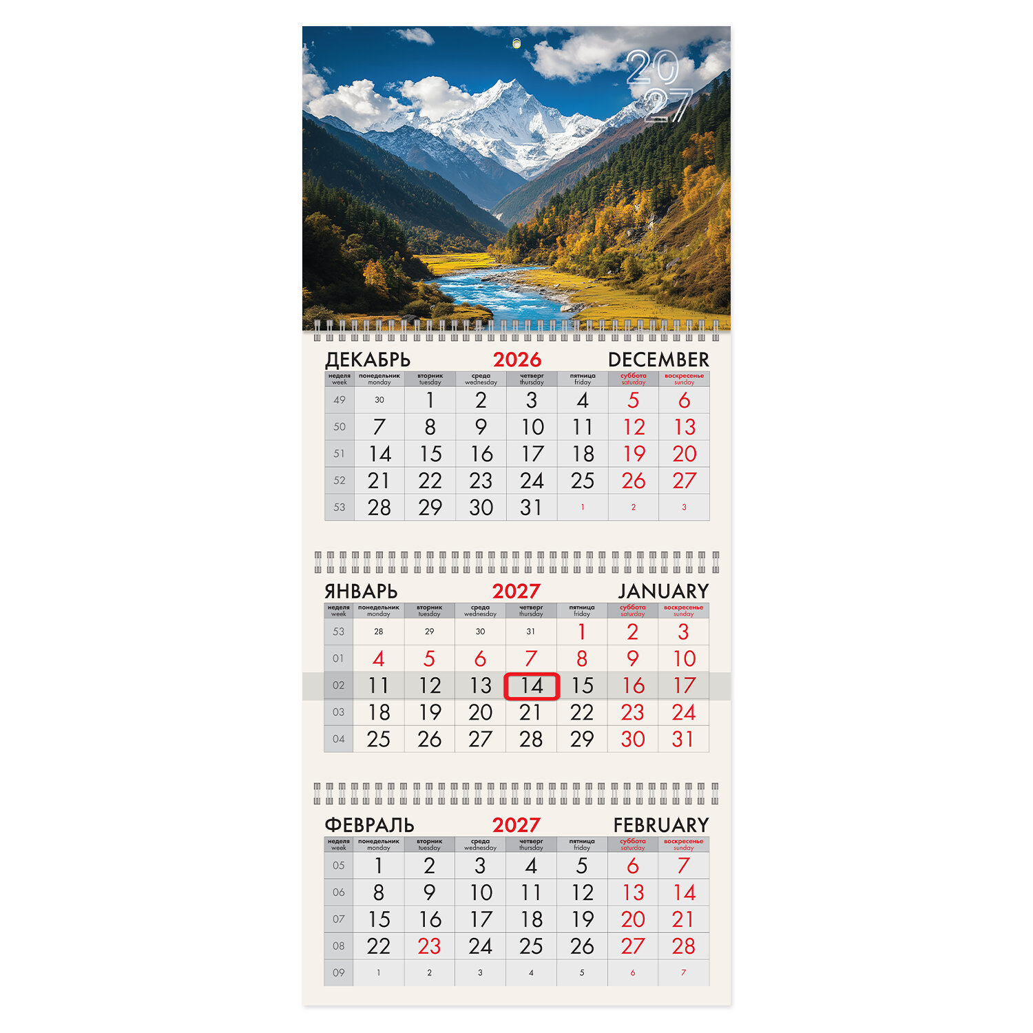 Календарь квартальный 2027г, 3 блока 3 гребня, бегунок, офсет, BRAUBERG, "Горы" Код товара: 118263 298,35 ₽ Купить Производитель:BRAUBERG Квартальный календарь BRAUBERG "Горы" предназначен для делового планирования. Офисный календарь на 2027 год на 3 гребнях. Состоит из 3 блоков с календарными сетками на три месяца – предыдущий, текущий и последующий. Блок календаря напечатан на офсетной бумаге плотностью 65 г/м2. Подложка изготовлена из мелованного картона плотностью 250 г/м2. Курсор-бегунок выделяет текущую дату. Вертикальный формат. Размер – 29,5х68,2 см. Поставляется в индивидуальной упаковке (полибег) с европодвесом и прокладкой из гофрокартона, что обеспечивает дополнительную защиту товара.Производство: РоссияТип календаря: квартальный на 3 гребняхГод: 2027Тип скрепления: гребеньРазмер: 29,5х68,2 смВнутренний блок: офсетная бумагаПлотность внутреннего блока: 65 г/м2Подложка: мелованный картонПлотность подложки: 250 г/м2Курсор: даПикколо: даДизайн: ГорыКалендарная сетка: с разбивкой на 3 месяцаИндивидуальная упаковка: даВес: 250 грРазмер упаковки: 2 × 29.7 × 22.5 смОбъём: 0.0016 м3Промежуточная упаковка: 40 штТранспортная упаковка: 40 штШтрих-код: 4606224527475 Файлы