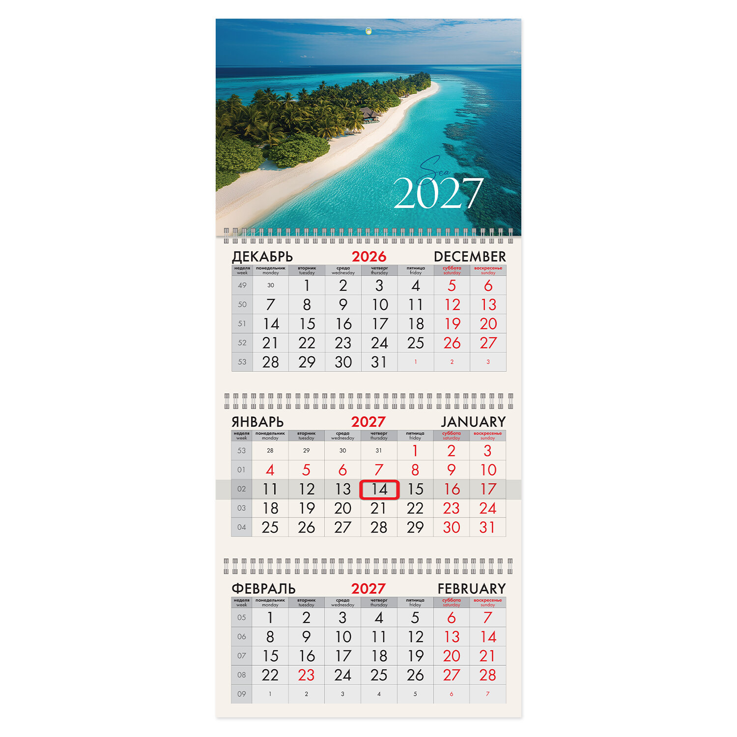 Календарь квартальный 2027г, 3 блока 3 гребня, бегунок, офсет, BRAUBERG, "Лазурный пляж" Код товара: 118265 298,35 ₽ Купить Производитель:BRAUBERG Квартальный календарь BRAUBERG "Лазурный пляж" предназначен для делового планирования. Офисный календарь на 2027 год на 3 гребнях. Состоит из 3 блоков с календарными сетками на три месяца – предыдущий, текущий и последующий. Блок календаря напечатан на офсетной бумаге плотностью 65 г/м2. Подложка изготовлена из мелованного картона плотностью 250 г/м2. Курсор-бегунок выделяет текущую дату. Вертикальный формат. Размер – 29,5х68,2 см. Поставляется в индивидуальной упаковке (полибег) с европодвесом и прокладкой из гофрокартона, что обеспечивает дополнительную защиту товара.Производство: РоссияТип календаря: квартальный на 3 гребняхГод: 2027Тип скрепления: гребеньРазмер: 29,5х68,2 смВнутренний блок: офсетная бумагаПлотность внутреннего блока: 65 г/м2Подложка: мелованный картонПлотность подложки: 250 г/м2Курсор: даПикколо: даДизайн: Лазурный пляжКалендарная сетка: с разбивкой на 3 месяцаИндивидуальная упаковка: даВес: 250 грРазмер упаковки: 2 × 29.7 × 22.5 смОбъём: 0.0016 м3Промежуточная упаковка: 40 штТранспортная упаковка: 40 штШтрих-код: 4606224527499 Файлы