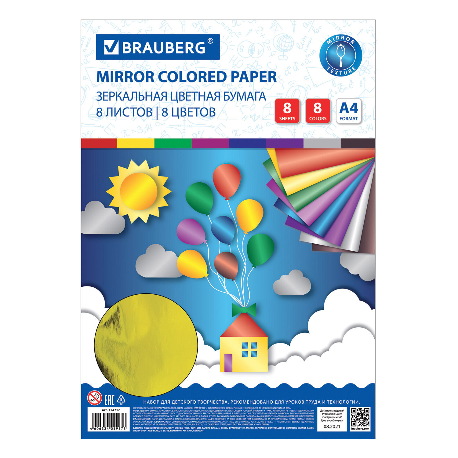 Цветная бумага А4 ЗЕРКАЛЬНАЯ, 8 листов 8 цветов, BRAUBERG Ликвидация Код товара: 124717 66,94 ₽ Купить Производитель:BRAUBERG Набор цветной бумаги со спецэффектами BRAUBERG предназначен для творчества, хобби, моделирования, оформления презентаций как любителями, так и профессионально занимающимися людьми. Набор зеркальной (металлизированной пленка) односторонней цветной бумаги плотностью 80 г/м2 включает 8 листов формата А4 (210х297 мм) в 8-ми разнообразных и насыщенных однородных цветах. Листы упакованы в полиэтиленовый пакет с липким краем, легко режутся и сгибаются.Производство: КитайТип бумаги: зеркальная, односторонняяФормат: А4Количество листов: 8Количество цветов: 8Тип товара: бумага цветная зеркальнаяПлотность бумаги: 80 г/м2Прокрас бумаги: с 1 стороныДизайн: Воздушный домикШирина: 210 ммДлина: 297 ммОбложка: мелованная бумагаИндивидуальная упаковка: даУпаковка: пакетВес: 67 грРазмер упаковки: 0.2 × 30.1 × 22.4 смОбъём: 0.0001 м3Промежуточная упаковка: 25 штТранспортная упаковка: 200 штШтрих-код: 4606224059273 Сертификат-1.jpg Сертификат-2.jpg Сертификат-3.jpg