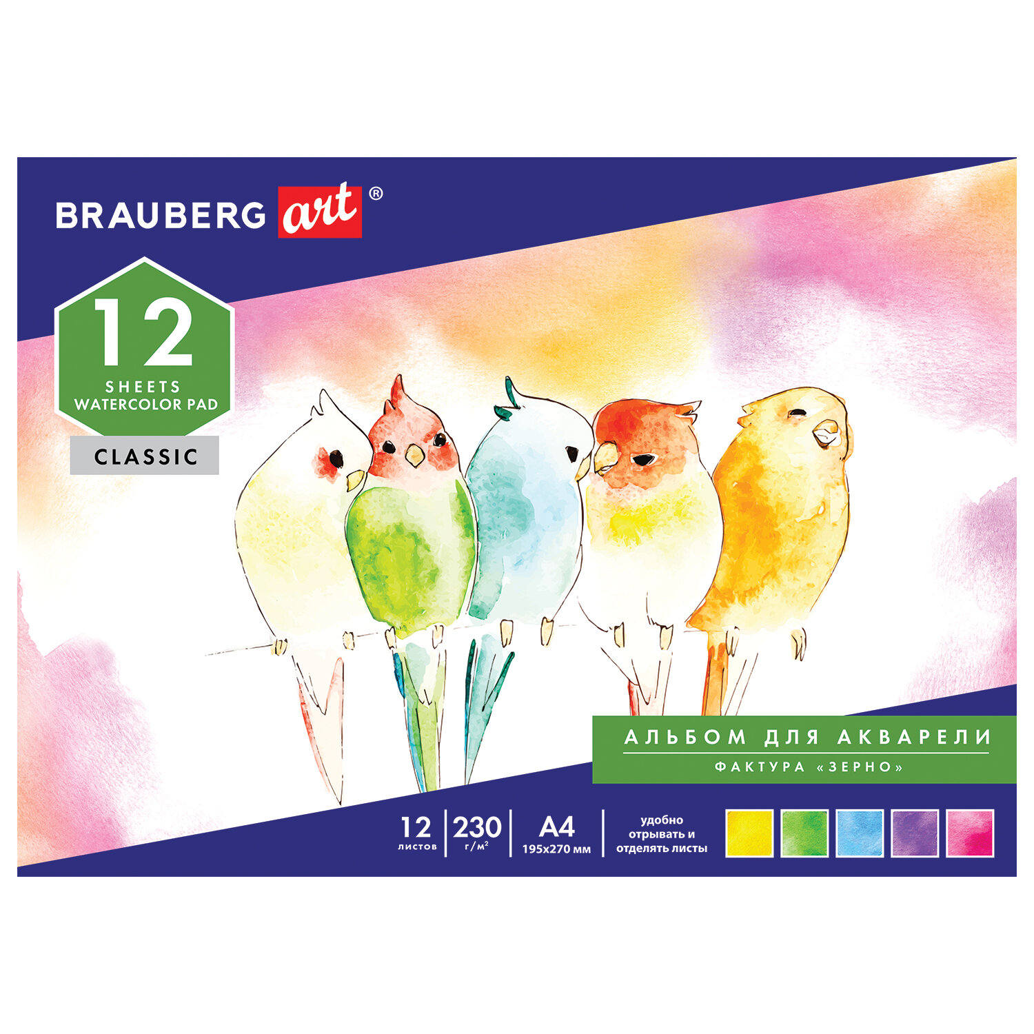 Альбом для акварели А4 (195х270 мм), ЗЕРНО, белая, 12л, 230 г/м2, склейка, BRAUBERG ART CLASSIC Ликвидация Код товара: 128963 222,33 ₽ Купить Производитель:BRAUBERG ART Альбом для акварели из плотной, устойчивой к старению акварельной бумаги. Светостойкие крупнозернистые листы прекрасно подходят для акварельных карандашей, гуаши, темперы, акрила, масляной и сухой пастели, угля, соусов, сепии, сангины и смешанных техник. Альбом для акварели BRAUBERG содержит 12 листов формата А4 (195х270 мм), специально предназначенных для рисования всеми видами водорастворимых красок. Качественные листы высокой плотности 180 г/м2 устойчивы к истиранию, воздействию влаги, обеспечивают чистую реалистичную передачу цвета. Акварельная бумага изготовлена по ГОСТ 7277-77. Белизна 100%. Текстура бумаги "зерно" подходит для разных техник рисования: как для детализированной живописи, так и для создания красивых зернистых эффектов. Обложка выполнена из мелованного картона.Производство: КитайФормат: А4Серия: ClassicПлотность внутреннего блока: 230 г/м2Тип товара: планшеты для акварелиКоличество листов: 12Внутренний блок: художественная бумага для акварелиШирина: 195 ммДлина: 270 ммТекстура: крупное зерноЦвет внутреннего блока: белыйБелизна 100%: даОбложка: мелованный картонТип скрепления: склейкаЖесткая подложка: даДизайн обложки: ПопугайчикиКоличество дизайнов в упаковке: 1 шт.Индивидуальная упаковка: даВес: 252 грРазмер упаковки: 0.7 × 27 × 19.5 смОбъём: 0.0005 м3Промежуточная упаковка: 20 штТранспортная упаковка: 80 штШтрих-код: 4606224179971 Файлы Сертификат-1.jpg Сертификат-2.jpg Сертификат-3.jpg Сертификат-4.jpg