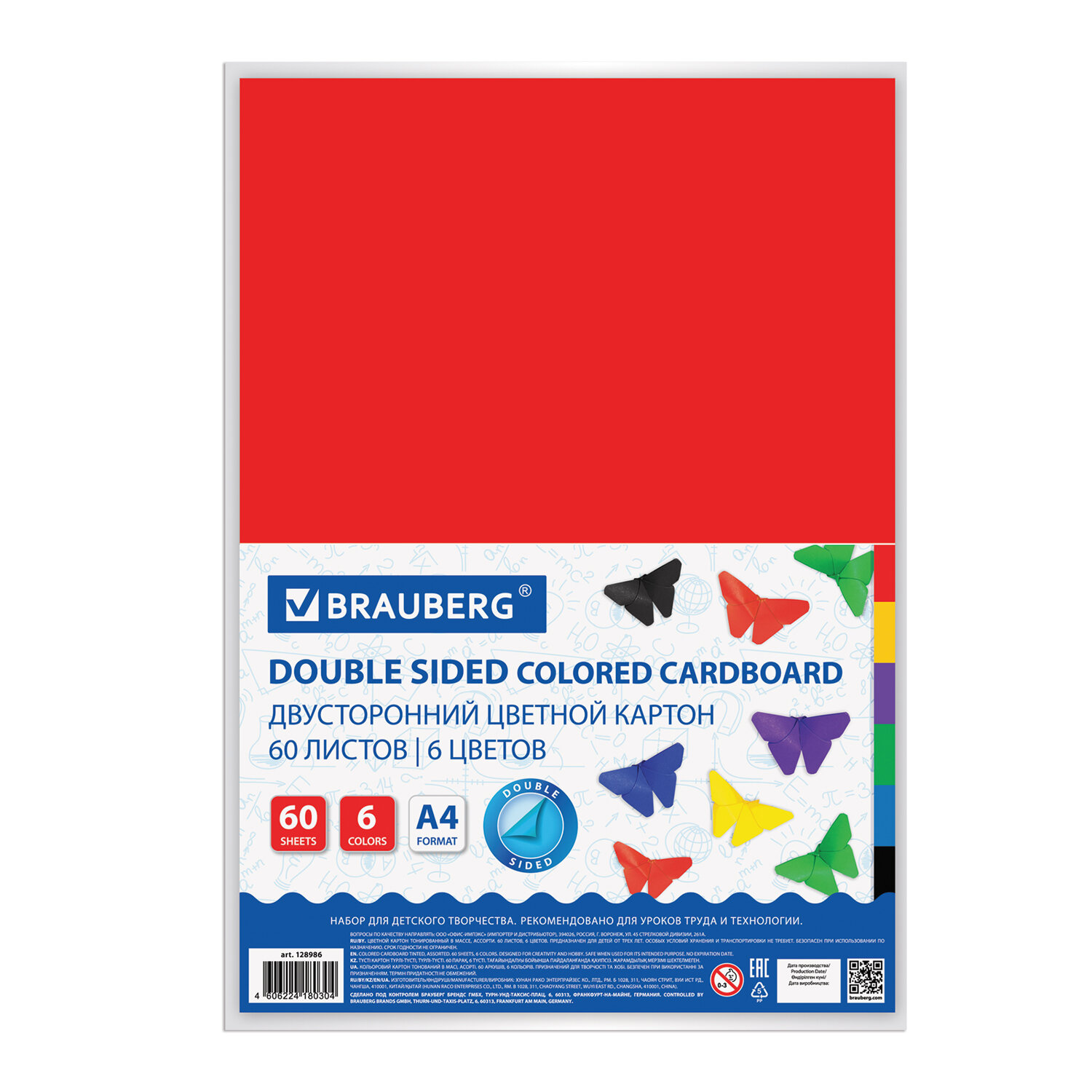Картон цветной А4 ТОНИРОВАННЫЙ В МАССЕ, 60 листов, 6 цветов, 220 г/м2, BRAUBERG, 210х297 мм Код товара: 128986 538,81 ₽ Купить Производитель:BRAUBERG Набор цветного двустороннего тонированного картона BRAUBERG предназначен для творчества, хобби, моделирования, оформления презентаций. Позволит создавать всевозможные аппликации и поделки. Немелованный двусторонний картон окрашивается непосредственно в процессе изготовления и обладает плотностью 220 г/м2. Может использоваться, начиная с трехлетнего возраста. Картон легко режется ножницами, сгибается и клеится. Внутренний блок состоит из 60 листов формата А4 (210х297 мм) и 6 цветов.Производство: КитайФормат: А4Количество листов: 60Количество цветов: 6Тип картона: тонированныйДвусторонний: даПлотность картона: 220 г/м2Тип товара: картон цветной тонированныйДизайн: БабочкиДлина: 297 ммШирина: 210 ммИндивидуальная упаковка: даУпаковка: пакетВес: 853 грРазмер упаковки: 1.8 × 29.9 × 21.5 смОбъём: 0.0014 м3Промежуточная упаковка: 10 штТранспортная упаковка: 10 штШтрих-код: 4606224180304 Сертификат-1.jpg Сертификат-2.jpg Сертификат-3.jpg