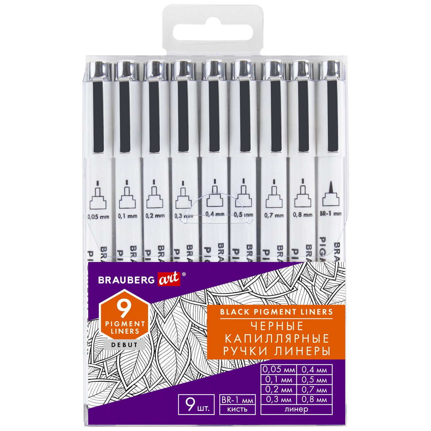В наборе 9 черных капиллярных ручек с типами наконечников "Линер": № 0.05, 0.1, 0.2, 0.3, 0.4, 0.5, 0.7, 0.8 - номер ручки на колпачке соответствует толщине линии письма в миллиметрах; "Кисть": № BR - 1 мм - за счет длины и упругости наконечника "кисть" толщина линии письма может варьироваться от 0.1 до 2 мм.