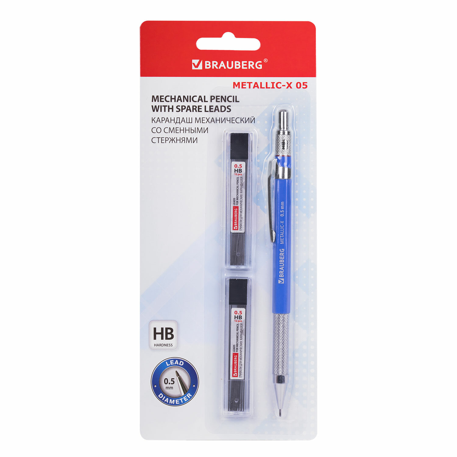 Карандаш механический 0,5 мм + грифели HB 24 штуки на блистере, BRAUBERG "METALLIC-X 05", металлические детали Код товара: 181965 278,19 ₽ Купить Производитель:BRAUBERG Механический карандаш BRAUBERG "METALLIC-X 05" с металлическими деталями и сменными стержнями. Механический карандаш снабжен грифелем HB 0,5 мм, всегда заточен, готов к использованию и позволяет делать аккуратные тонкие линии. Корпус выполнен из высококачественного пластика глубокого синего цвета. Металлические детали приятно утяжеляют карандаш и делают письмо еще более комфортным. В комплекте с карандашом идут сменные грифели HB 24 штуки.Производство: КитайТип карандаша: механическийДиаметр грифеля: 0,5 ммТвердость грифеля: НВФорма корпуса: шестиграннаяКоличество в комплекте: 1 шт.Серия: METALLIC-XЗапасные грифели в комплекте: 24 штМатериал корпуса: пластикМатериал клипа: металлЦвет корпуса: синийУпаковка: блистер с европодвесомВес: 43 грРазмер упаковки: 1.2 × 20.9 × 8.8 смОбъём: 0.0002 м3Промежуточная упаковка: 24 штТранспортная упаковка: 72 штШтрих-код: 4606224394367 Сертификат-1.jpg Сертификат-2.jpg Сертификат-3.jpg