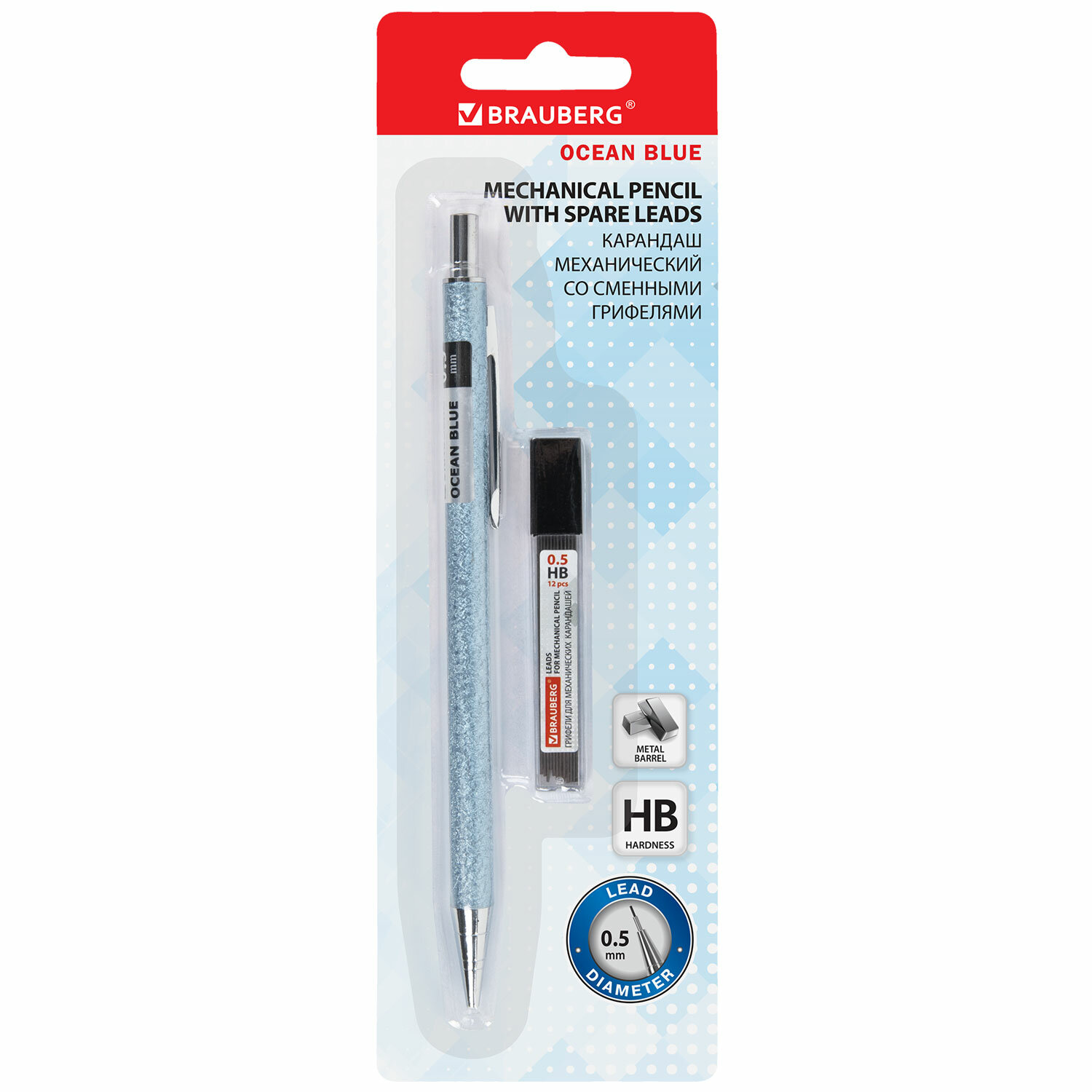 Карандаш механический 0,5 мм + грифели HB 12 штук на блистере, BRAUBERG "OCEAN BLUE" Код товара: 181970 227,31 ₽ Купить Производитель:BRAUBERG Механический карандаш BRAUBERG "OCEAN BLUE" с металлическим корпусом и сменными грифелями. Механический карандаш с нажимным механизмом заправлен грифелем HB, всегда заточен, готов к работе и дает тонкую ровную линию 0,5 мм. Встроенный ластик поможет быстро и легко исправить ошибку. Круглый фактурный корпус стильного дизайна способствует легкому и точному письму. В комплекте с карандашом идут сменные грифели HB 12 штук.Производство: КитайТип карандаша: механическийДиаметр грифеля: 0,5 ммНаличие ластика: даТвердость грифеля: НВФорма корпуса: круглаяКоличество в комплекте: 1 шт.Серия: FactureЗапасные грифели в комплекте: 12 штМатериал корпуса: металлМатериал клипа: металлЦвет корпуса: голубойУпаковка: блистер с европодвесомВес: 30 грРазмер упаковки: 0.9 × 20.4 × 6.5 смОбъём: 0.0001 м3Промежуточная упаковка: 24 штТранспортная упаковка: 96 штШтрих-код: 4606224394411 Сертификат-1.jpg Сертификат-2.jpg Сертификат-3.jpg