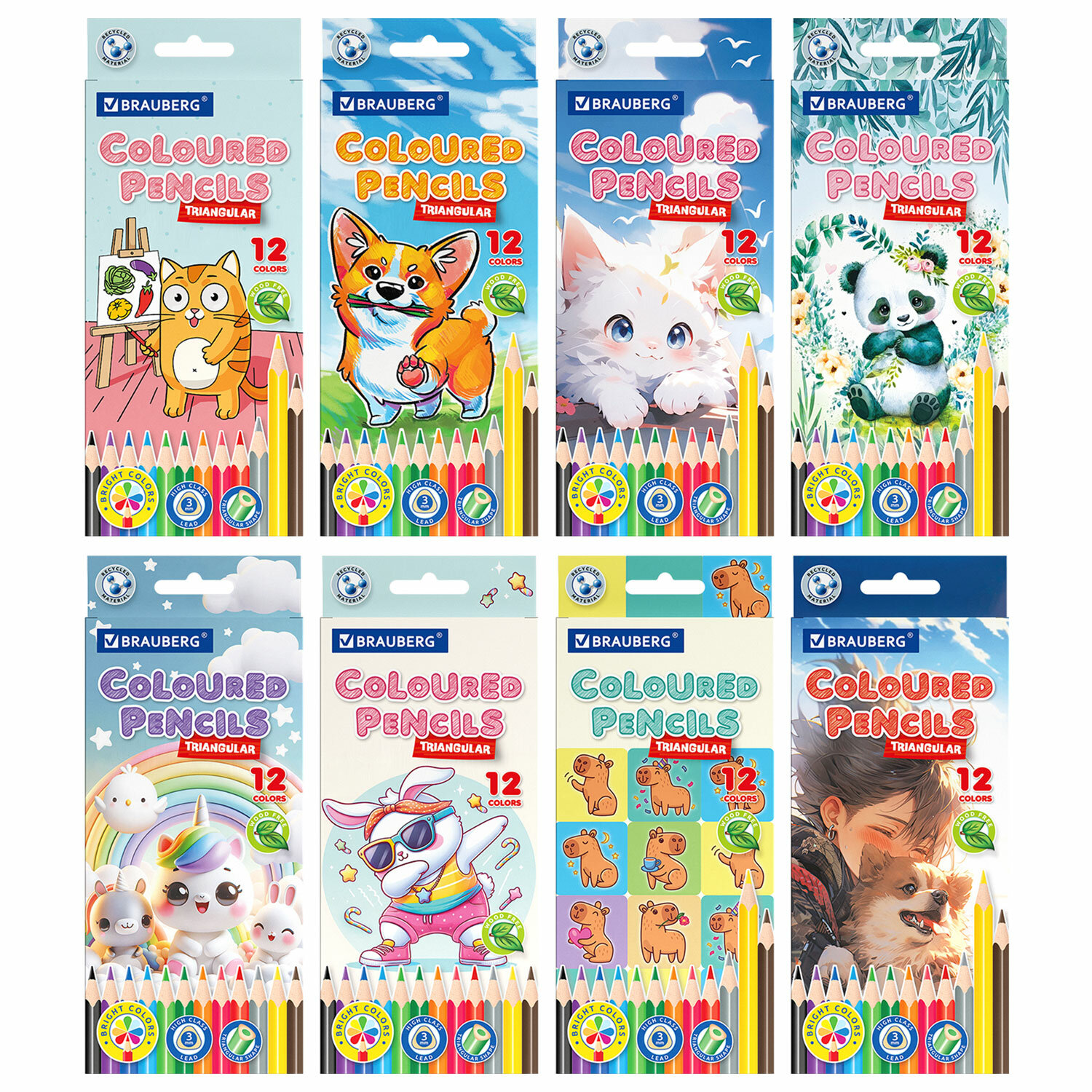 Карандаши цветные "АССОРТИ 8 ДИЗАЙНОВ 3-10 лет", 12 цветов, трехгранные, BRAUBERG Код товара: 182055 107,83 ₽ Купить Производитель:BRAUBERG Цветные карандаши высокого качества BRAUBERG обеспечивают гладкое письмо благодаря мягкому грифелю. Особое качество красящего пигмента дарит насыщенные яркие цвета. Набор состоит из 12 цветов: черного, синего, голубого, салатового, зеленого, желтого, оранжевого, розового, красного, серого, фиолетового и коричневого. Трехгранная форма корпуса обеспечивает эргономичность и удобство использования. Карандаши изготовлены из качественного материала и имеют лакированный корпус. Качество исполнения гарантирует легкую заточку. Грифель обладает повышенной прочностью. Все карандаши заточены и поставляются в картонной упаковке с европодвесом.Производство: КитайКоличество цветов: 12 шт.Количество карандашей: 12 шт.Серия: АССОРТИДизайн: 3+ летФорма сечения корпуса: трехграннаяМатериал корпуса: пластикЛакированный корпус: даГрифель повышенной прочности: даЗаточка грифеля: даЛегко затачиваются: даДиаметр грифеля: 3 ммДлина карандаша: 175 ммУпаковка: картонная коробка c европодвесомВес: 98 грРазмер упаковки: 1 × 20.2 × 8.7 смОбъём: 0.0002 м3Промежуточная упаковка: 24 штТранспортная упаковка: 240 штШтрих-код: 4606224459448 Сертификат-1.jpg Сертификат-2.jpg Сертификат-3.jpg