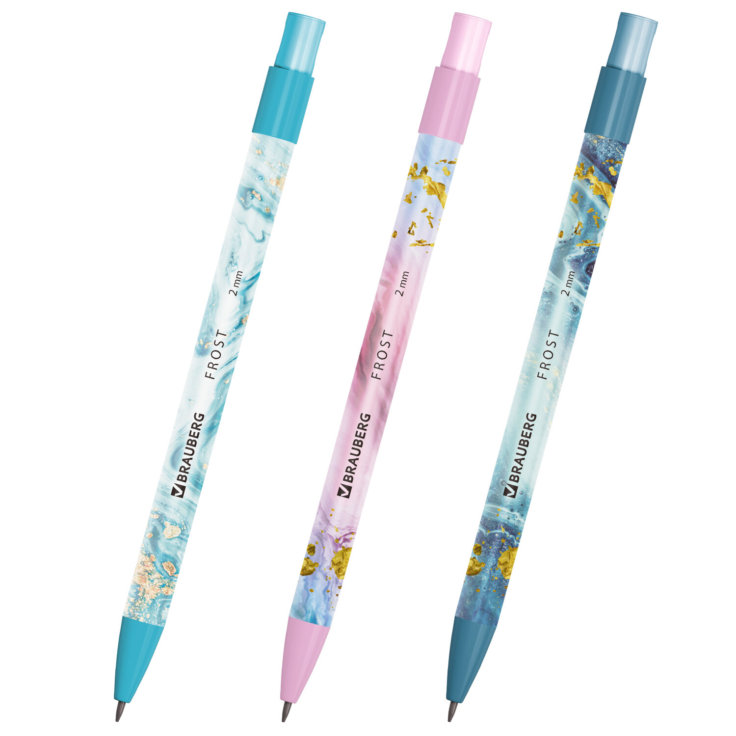 Карандаш механический цанговый 2 мм, BRAUBERG "FROST", HB, встроенная точилка, корпус ассорти Код товара: 182062 37,38 ₽ Купить Производитель:BRAUBERG Механический карандаш BRAUBERG "FROST" в необычном мраморном стиле идеально подойдет для ведения заметок во время работы и учебы Механический карандаш снабжен грифелем HB 2 мм, всегда заточен, готов к использованию. Карандаш подходит для рисования, черчения, а также ведения аккуратных записей. Встроенная точилка обеспечит всегда острую заточку. Круглый корпус в мраморных оттенках с покрытием soft-touch добавляет комфорта при письме.Производство: КитайТип карандаша: механическийДиаметр грифеля: 2 ммТвердость грифеля: НВФорма корпуса: круглаяКоличество в комплекте: 1 шт.Серия: ColletВстроенная точилка: даЗапасные грифели в комплекте: 0 штМатериал корпуса: пластикМатериал клипа: нетЦвет корпуса: с дизайномУпаковка: пластиковая тубаВес: 8 грРазмер упаковки: 0.9 × 14.4 × 0.9 смПромежуточная упаковка: 24 штТранспортная упаковка: 288 штШтрих-код: 4606224470542 Сертификат-1.jpg Сертификат-2.jpg Сертификат-3.jpg