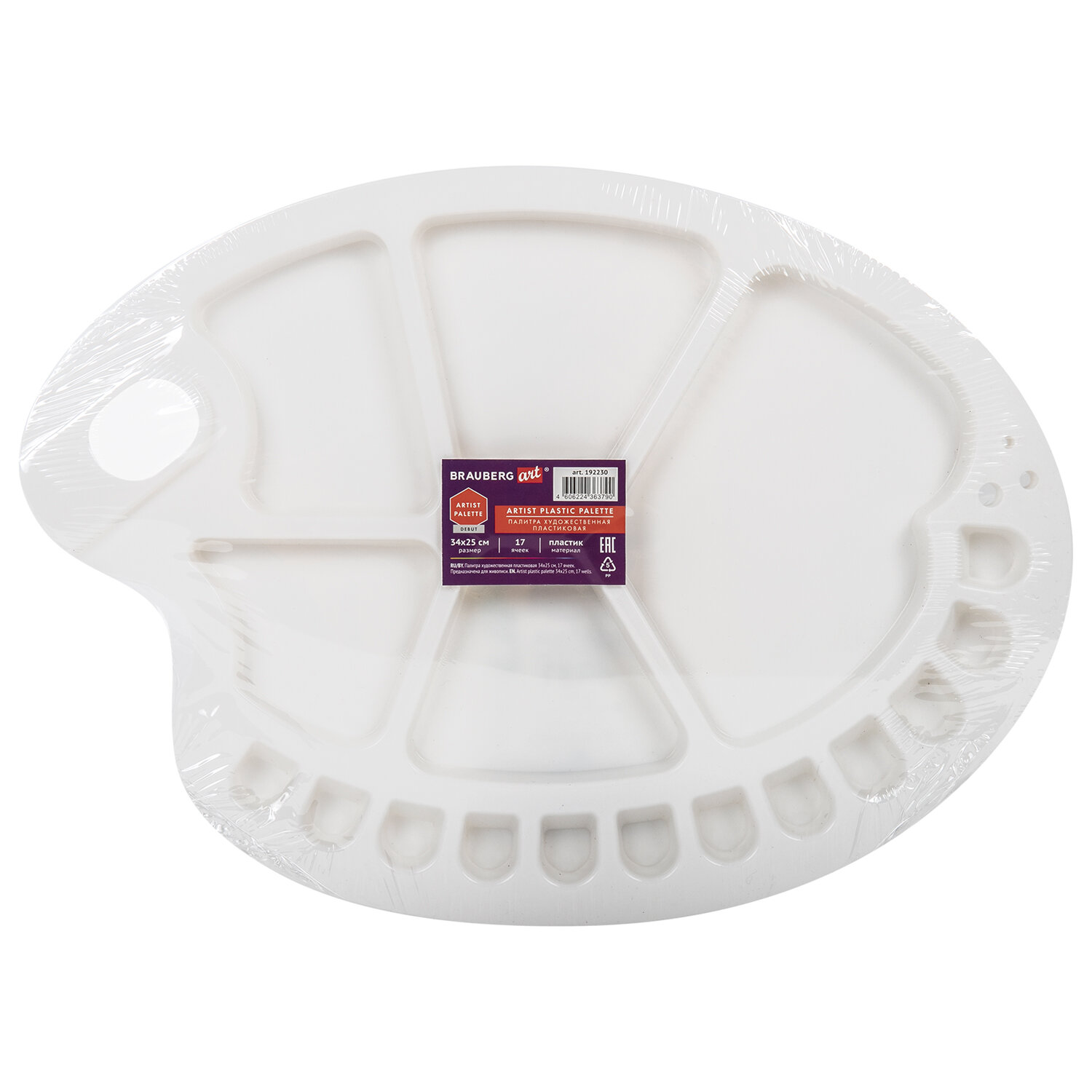 Палитра художественная пластиковая овальная 34х25 см, 17 ячеек, BRAUBERG ART DEBUT Код товара: 192230 219 ₽ Купить Производитель:BRAUBERG ART Палитра художественная BRAUBERG ART DEBUT предназначена для живописи. Большая и легкая пластиковая палитра подходит для работы со всеми типами художественных красок: масляными, акриловыми, темперными, гуашевыми, акварельными. Имеет 12 ячеек и 5 больших отсеков для смешивания красок. Палитру овальной формы удобно держать в руке. Размеры - 34х25 см. Художественные палитры пригодятся школьникам, студентам, участникам мастер-классов, ученикам художественных школ, студий и училищ, живописных мастерских, так как у них может быть широкая гамма размеров и видов. С их помощью можно создать даже иллюстрации к сонетам Шекспира. Эти палитры используют любители для хобби и профессионалы, которые стремятся достичь такой же славы, как Пикассо (Picasso), Малевич, Шагал, Моне (Claude Monet), Рембрандт (Rembrandt), Дали (Salvador Dali), Уорхол (Andy Warhol), Рублёв, Фрида Кало (Frida Kahlo), Ван Гог (Vincent van Gogh), Тициан (Tician), Анри Матисс (Henri Matisse) Леонардо да Винчи (Leonardo da Vinci) и другие популярные художники и артисты. Творчество - луч света в серых буднях!Производство: КитайШирина: 25 смДлина: 34 смТолщина: 15 ммКоличество в комплекте: 1 шт.Материал: пластикФорма: овальнаяСерия: DEBUTВес: 193 грРазмер упаковки: 1.5 × 34.3 × 24.8 смОбъём: 0.0017 м3Промежуточная упаковка: 25 штТранспортная упаковка: 50 штШтрих-код: 4606224363790 Сертификат-1.jpg Сертификат-2.jpg Сертификат-3.jpg