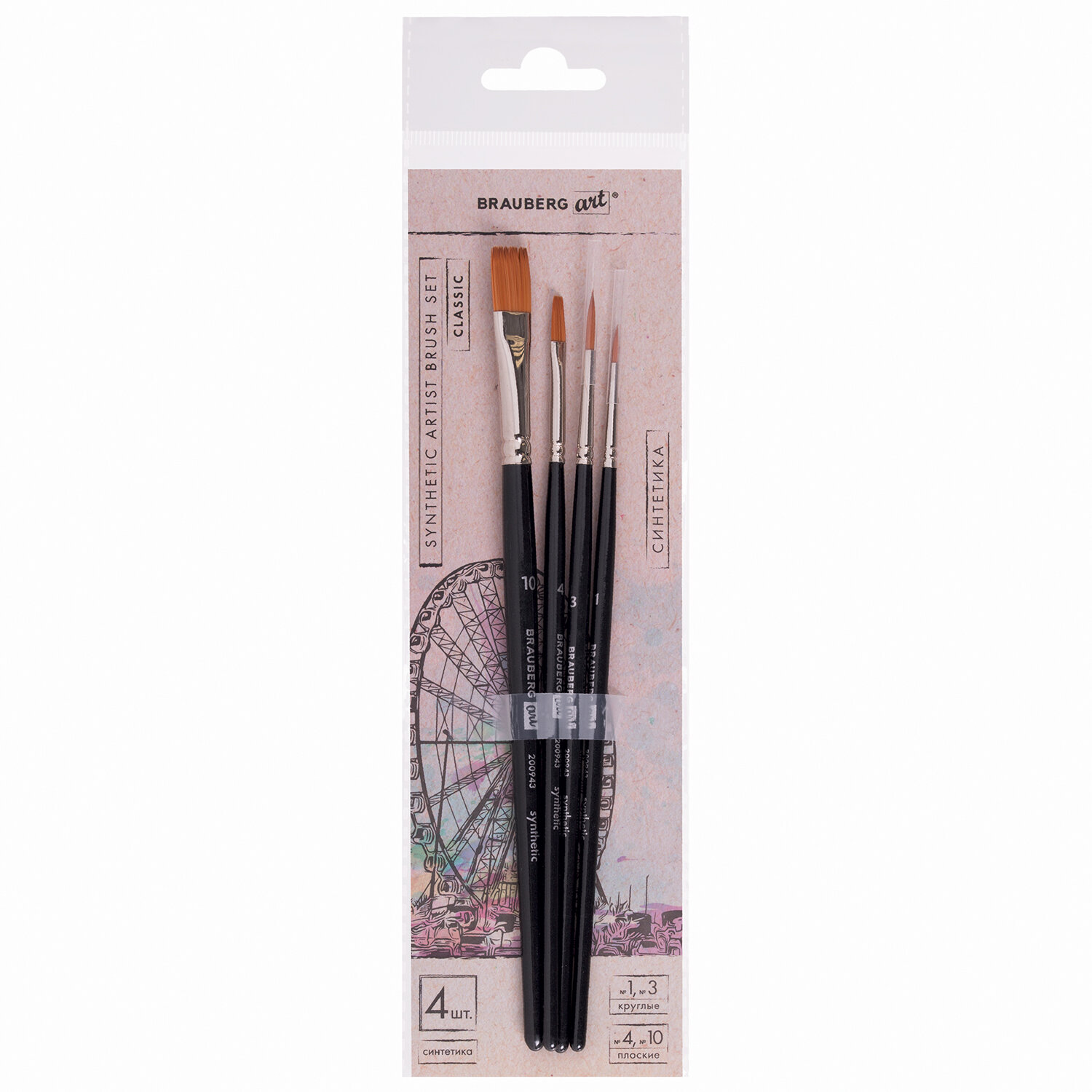 Кисти изготовлены с применением высококачественной синтетики, имитирующей свойства натурального волоса колонка. Отличаются универсальностью в использовании, обусловленной упругостью ворса и прекрасными впитывающими свойствами пучка. Короткая ручка из древесины покрыта лаком, что защищает ее от воздействия красок и влаги. Форма пучка - круглая № 1, 3 и плоская № 4, 10. Номер кисти соответствует реальной ширине пучка в миллиметрах. Упаковка - пакет с европодвесом и картонной подложкой.