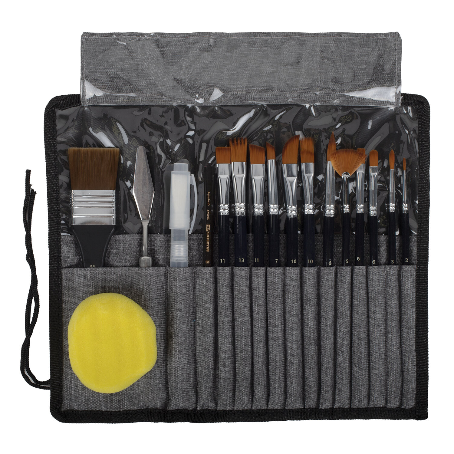 Кисти BRAUBERG ART DEBUT изготовлены с применением синтетики. Отличаются универсальностью в использовании, обусловленной упругостью ворса и прекрасными впитывающими свойствами пучка. Короткая ручка из древесины покрыта лаком, что защищает ее от воздействия красок и влаги. В набор входят 14 кистей различной формы, текстильный пенал скрутка, мастихин, художественная губка и чернографитный карандаш 2В.