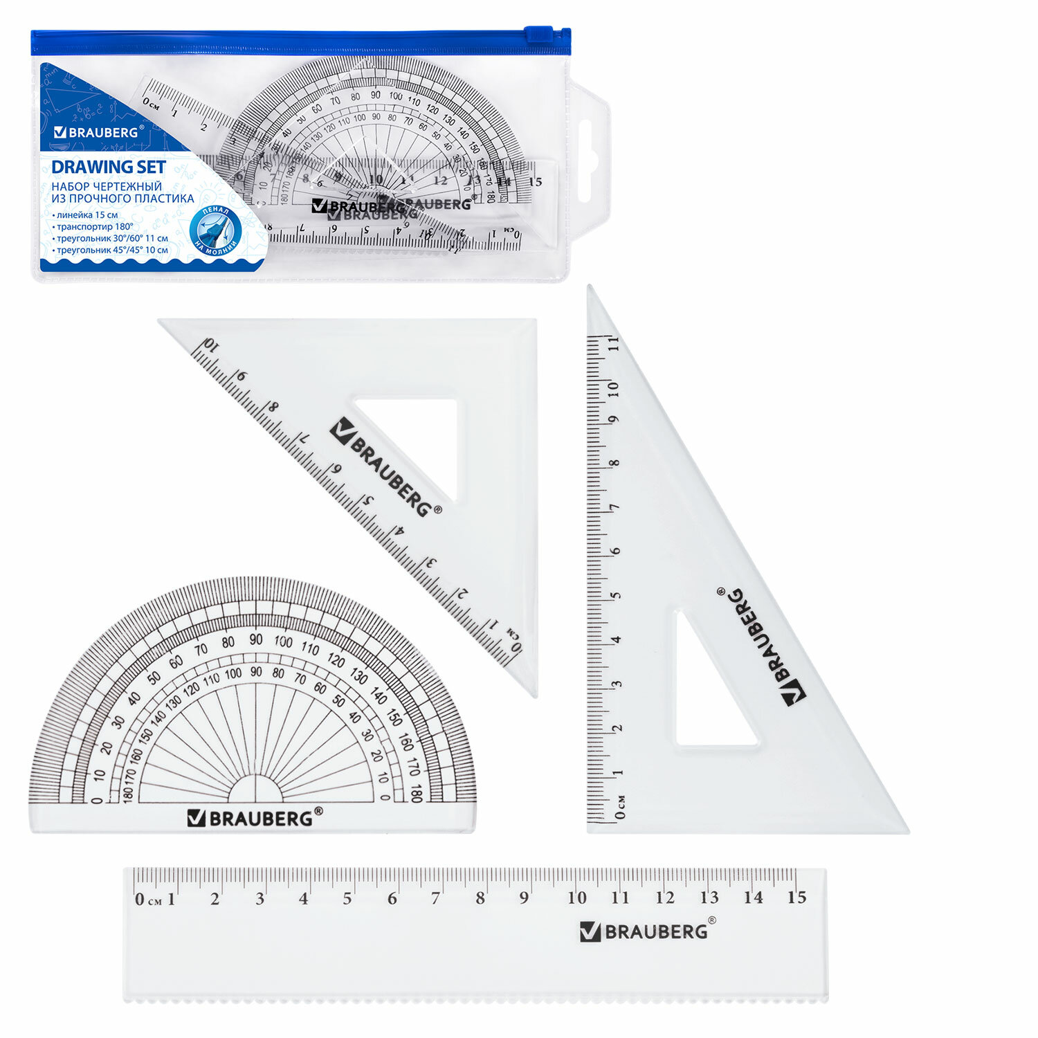 Набор чертежный малый BRAUBERG (линейка 15 см, 2 угольника, транспортир), конверт на молнии Код товара: 210306 174,59 ₽ Купить Производитель:BRAUBERG Набор чертежный геометрический BRAUBERG предназначен для выполнения чертежных работ. В набор входит: - линейка со шкалой 15 см и волнистым краем; - угольник с углами 30°/60° и шкалой 11 см; - угольник с углами 45°/45° и шкалой 10 см; - транспортир 180°. Изготовлен из прочного прозрачного пластика толщиной 1,4-2 мм. Поставляется в пенале на молнии с европодвесом.Производство: КитайКоличество предметов в наборе: 4 шт.Максимальная длина разметки: 15 смКомплектация: линейка, малый треугольник, транспортирМатериал: пластикПрозрачный: даЦвет: прозрачныйСерия: POCKETУпаковка: пенал на молнии с европодвесомВес: 35 грРазмер упаковки: 0.5 × 17.4 × 8.5 смОбъём: 0.0001 м3Промежуточная упаковка: 24 штТранспортная упаковка: 288 штШтрих-код: 4606224046785 Файлы Сертификат-1.jpg Сертификат-2.jpg Сертификат-3.jpg Сертификат-4.jpg