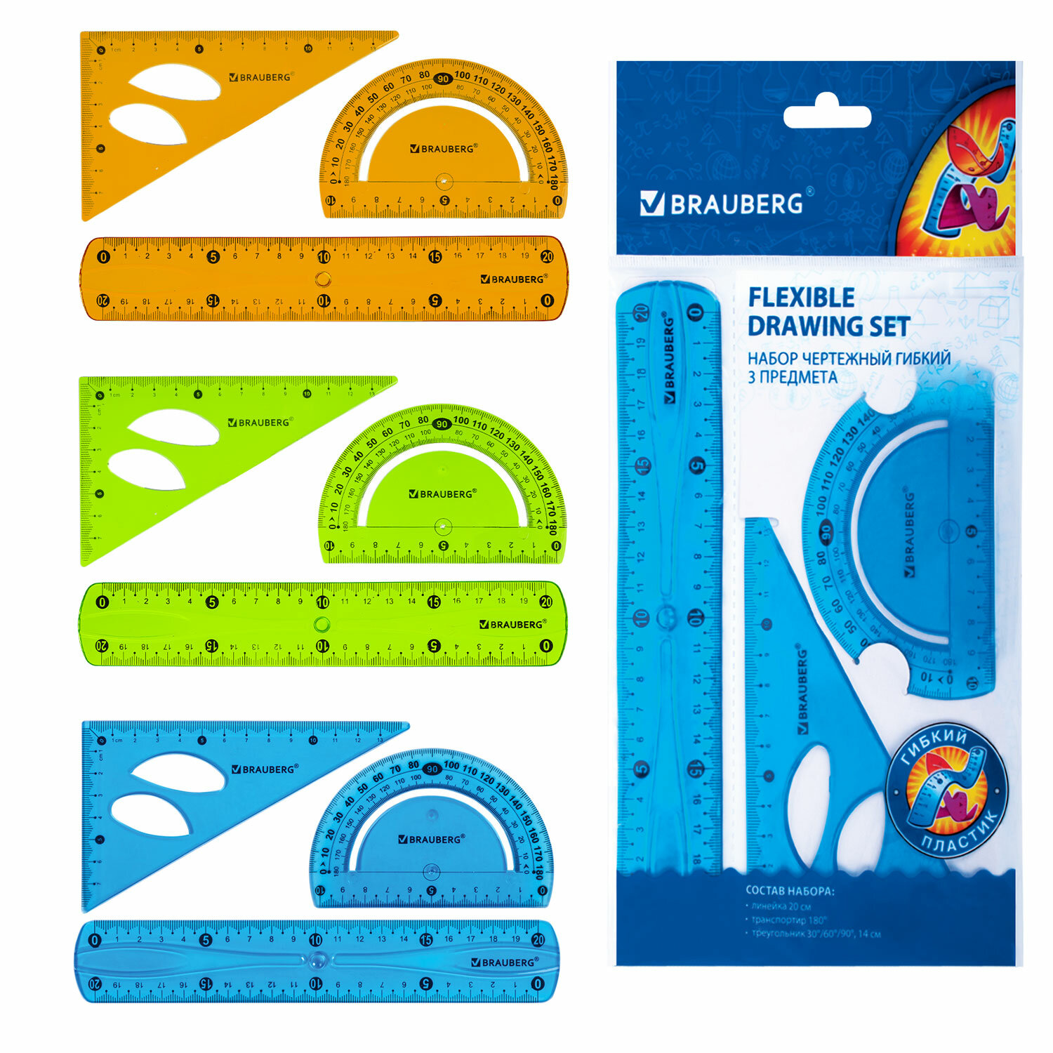 Набор чертежный средний гибкий BRAUBERG "FLEX" (линейка 20 см, треугольник, транспортир), ассорти Код товара: 210679 244,77 ₽ Купить Производитель:BRAUBERG Гибкий ударопрочный набор чертежных инструментов BRAUBERG предназначен для чертёжных и измерительных работ. Изготовлен из высококачественного ПВХ. Линейки обладают четкой разметкой, что делает их удобными в использовании. Сантиметровая шкала с двух сторон и безопасные закруглённые углы. Устойчивы к деформации. В комплект входит: линейка 20 см, транспортир 180°, треугольник - 30/60/90°, 14 см. Поставляется в нескольких вариантах цвета (без возможности выбора).Производство: КитайКоличество предметов в наборе: 3 шт.Максимальная длина разметки: 20 смКомплектация: линейка, малый треугольник, транспортирМатериал: пластикПрозрачный: даЦвет: ассортиСерия: FlexУпаковка: пакет с европодвесомВес: 73 грРазмер упаковки: 0.3 × 23.5 × 15.3 смОбъём: 0.0002 м3Промежуточная упаковка: 24 штТранспортная упаковка: 192 штШтрих-код: 4606224235646 Файлы Сертификат-1.jpg Сертификат-2.jpg Сертификат-3.jpg Сертификат-4.jpg