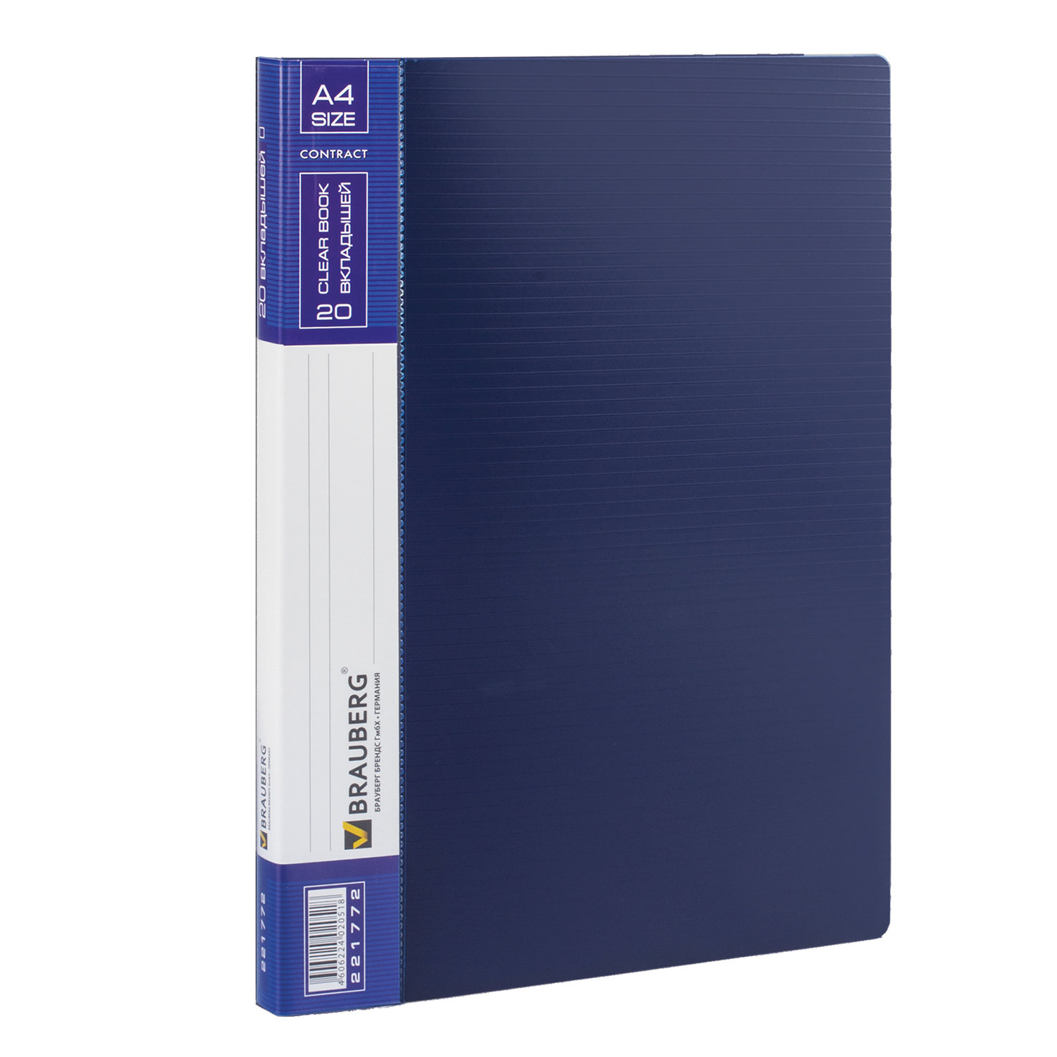 Папка 20 вкладышей BRAUBERG "Contract", синяя, вкладыши-антиблик, 0,7 мм, бизнес-класс Код товара: 221772 357,33 ₽ Купить Производитель:BRAUBERG Папка BRAUBERG "Contract" бизнес-класса солидного синего цвета отлично подходит для хранения документов, составления каталогов, меню и т.п. На корешке имеется карман для маркировки содержимого. Папка изготовлена из качественного пластика толщиной 0,7 мм с антибликовой линейной фактурой, а ширина корешка составляет 16 мм. Содержит 20 антибликовых вкладышей, позволяющих хранить документы формата А4 и обеспечивающих их надежную защиту от попадания влаги, пыли и прочих повреждений. Поставляется в индивидуальной упаковке.Производство: РоссияКоличество карманов: 20 шт.Формат: А4Ширина корешка: 16 ммАнтибликовая фактура: даЦвет: синийНа корешке папки: карманСерия: ContractФактура: "горизонтальная линия"Толщина пластика: 0.7 ммМатериал: пластикИндивидуальная упаковка: даВес: 164 грРазмер упаковки: 1.9 × 31 × 25 смОбъём: 0.001 м3Промежуточная упаковка: 30 штТранспортная упаковка: 30 штШтрих-код: 4606224020518 Файлы Сертификат-1.jpg Сертификат-2.jpg Сертификат-3.jpg Сертификат-4.jpg