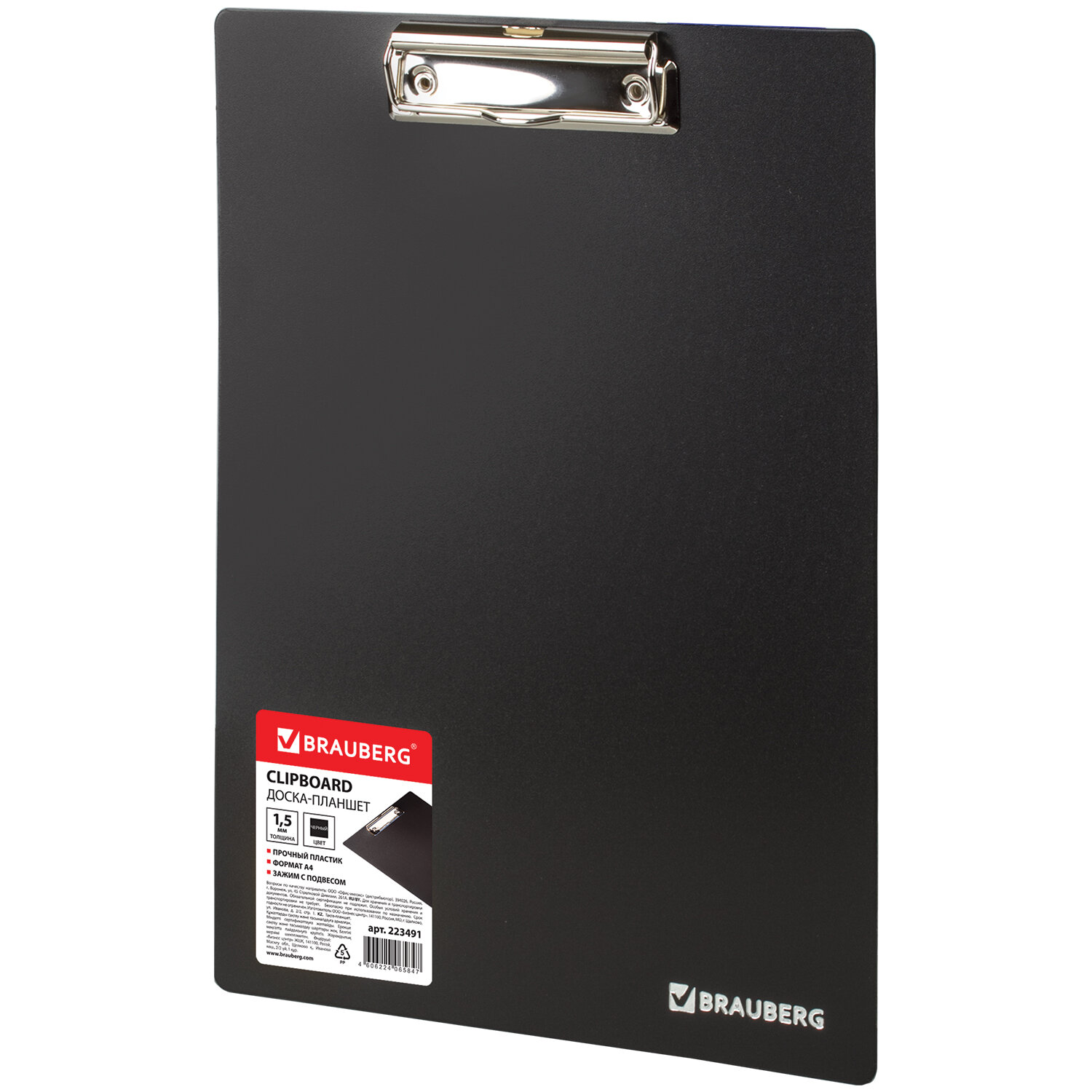 Доска-планшет BRAUBERG "Contract" с прижимом А4 (313х225 мм), пластик, 1,5 мм, ЧЕРНАЯ Код товара: 223491 345,22 ₽ Купить Производитель:BRAUBERG Доска-планшет BRAUBERG "Contract" используется для работы со счетами, накладными и другими документами. Незаменима при работе на складе, в магазине, при участии в конференциях, выставках и других публичных выступлениях. Доска-планшет формата А4 с верхним прижимом без крышки фиксирует до 90 листов. Изготовлена из жесткого пластика толщиной 1,5 мм, что позволяет комфортно делать записи на весу. Металлический прижим обеспечивает плотное прилегание документов, а выдвижной подвес позволяет разместить планшет на вертикальной поверхности.Производство: РоссияТип папки: без крышкиФормат: А4Расположение прижима: верхнийФиксирует до: 90 листовОсобенности: прижим с выдвижным подвесомСерия: ContractМатериал: пластикПокрытие: нетВысота: 313 ммШирина: 225 ммТолщина: 1.5 ммЦвет: черныйВес: 129 грРазмер упаковки: 1.2 × 31.5 × 22.7 смОбъём: 0.0005 м3Промежуточная упаковка: 45 штТранспортная упаковка: 45 штШтрих-код: 4606224065847 Файлы Сертификат-1.jpg Сертификат-2.jpg Сертификат-3.jpg Сертификат-4.jpg Сертификат-5.jpg Сертификат-6.jpg Сертификат-7.jpg Сертификат-8.jpg Сертификат-9.jpg Сертификат-10.jpg Сертификат-11.jpg Сертификат-12.jpg Сертификат-13.jpg Сертификат-14.jpg Сертификат-15.jpg Сертификат-16.jpg Сертификат-17.jpg Сертификат-18.jpg Сертификат-19.jpg Сертификат-20.jpg Сертификат-21.jpg Сертификат-22.jpg Сертификат-23.jpg Сертификат-24.jpg Сертификат-25.jpg Сертификат-26.jpg