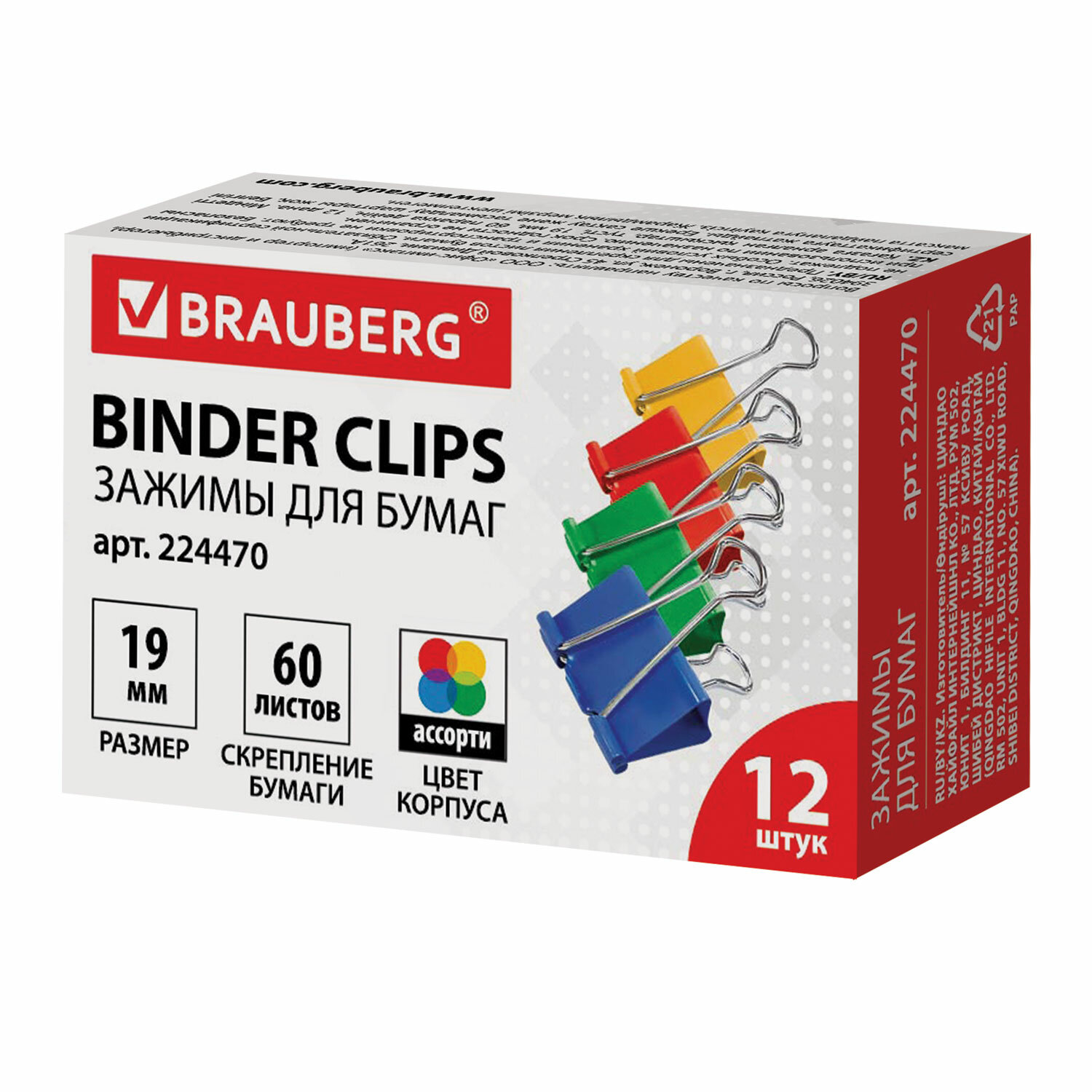 Зажимы для бумаг BRAUBERG, КОМПЛЕКТ 12 шт., 19 мм, на 60 листов, цветные, картонная коробка Код товара: 224470 115,71 ₽ Купить Производитель:BRAUBERG Зажимы для бумаг BRAUBERG предназначены для скрепления документов без использования степлера. Изготовлены из стали с цветным покрытием. Позволяют скреплять до 60 листов. Не деформируют бумагу. Ширина зажима - 19 мм. Поставляются по 12 штук в картонной коробке.Производство: КитайМаксимальное кол-во скрепляемых листов: 60Тип зажима: классическийШирина: 19 ммЦвет: ассортиКоличество в упаковке: 12 шт.Тип упаковки: картонная коробкаСерия: StandardВес: 35 грРазмер упаковки: 2.2 × 6.1 × 4.2 смОбъём: 0.0001 м3Промежуточная упаковка: 12 штТранспортная упаковка: 300 штШтрих-код: 4606224102948 Файлы Сертификат-1.jpg Сертификат-2.jpg Сертификат-3.jpg Сертификат-4.jpg Сертификат-5.jpg Сертификат-6.jpg Сертификат-7.jpg Сертификат-8.jpg Сертификат-9.jpg Сертификат-10.jpg Сертификат-11.jpg Сертификат-12.jpg Сертификат-13.jpg Сертификат-14.jpg Сертификат-15.jpg Сертификат-16.jpg Сертификат-17.jpg Сертификат-18.jpg Сертификат-19.jpg Сертификат-20.jpg Сертификат-21.jpg Сертификат-22.jpg Сертификат-23.jpg Сертификат-24.jpg Сертификат-25.jpg Сертификат-26.jpg