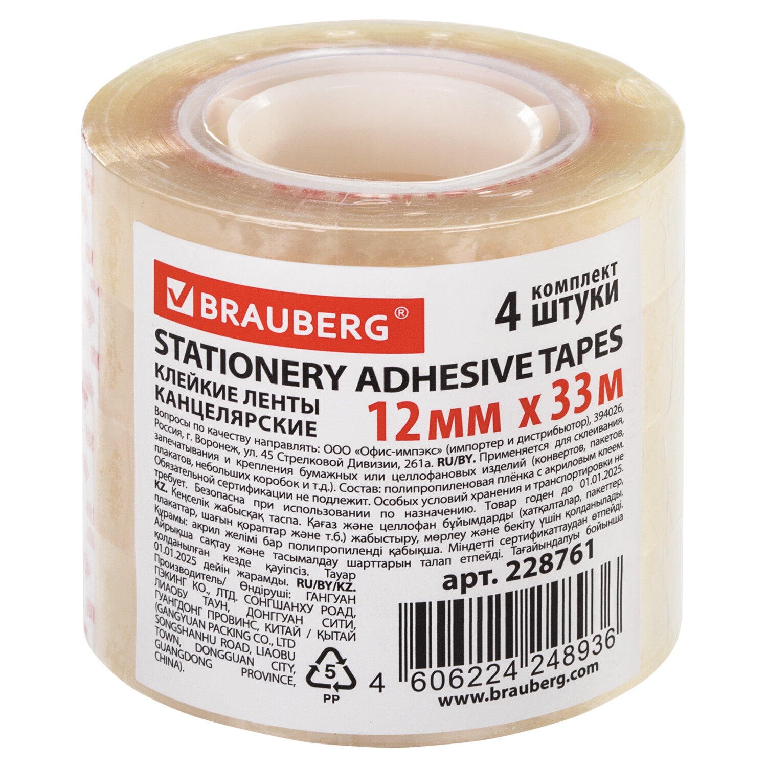 Клейкие ленты 12 мм х 33 м канцелярские BRAUBERG, КОМПЛЕКТ 4 шт., прозрачные, гарантированная длина Код товара: 228761 62,2 ₽ Купить Производитель:BRAUBERG Канцелярская клейкая лента BRAUBERG разработана специально для канцелярских нужд. Широко используется в бытовой, банковской и офисной сфере. Имеет гарантированную длину 33 м и ширину 12 мм и обладает высокой клеящей способностью. Отличается прозрачностью и прочностью 35 мкм. Упаковка – термоусадочная пленка. 4 ролика в комплекте.Производство: КитайШирина ленты: 12 ммДлина намотки: 33 мПрозрачная: даКоличество в упаковке: 4 шт.Плотность: 35 мкмОсобенности: полуматоваяТип клейкой ленты: канцелярскаяУпаковка: термоусадочная пленкаСрок годности: 60 месВес: 65 грРазмер упаковки: 5 × 5.4 × 5.4 смОбъём: 0.0002 м3Промежуточная упаковка: 75 штТранспортная упаковка: 75 штШтрих-код: 4606224248936 Файлы Сертификат-1.jpg Сертификат-2.jpg Сертификат-3.jpg Сертификат-4.jpg Сертификат-5.jpg Сертификат-6.jpg Сертификат-7.jpg Сертификат-8.jpg Сертификат-9.jpg Сертификат-10.jpg Сертификат-11.jpg Сертификат-12.jpg Сертификат-13.jpg Сертификат-14.jpg Сертификат-15.jpg Сертификат-16.jpg Сертификат-17.jpg Сертификат-18.jpg Сертификат-19.jpg Сертификат-20.jpg Сертификат-21.jpg Сертификат-22.jpg Сертификат-23.jpg Сертификат-24.jpg Сертификат-25.jpg Сертификат-26.jpg