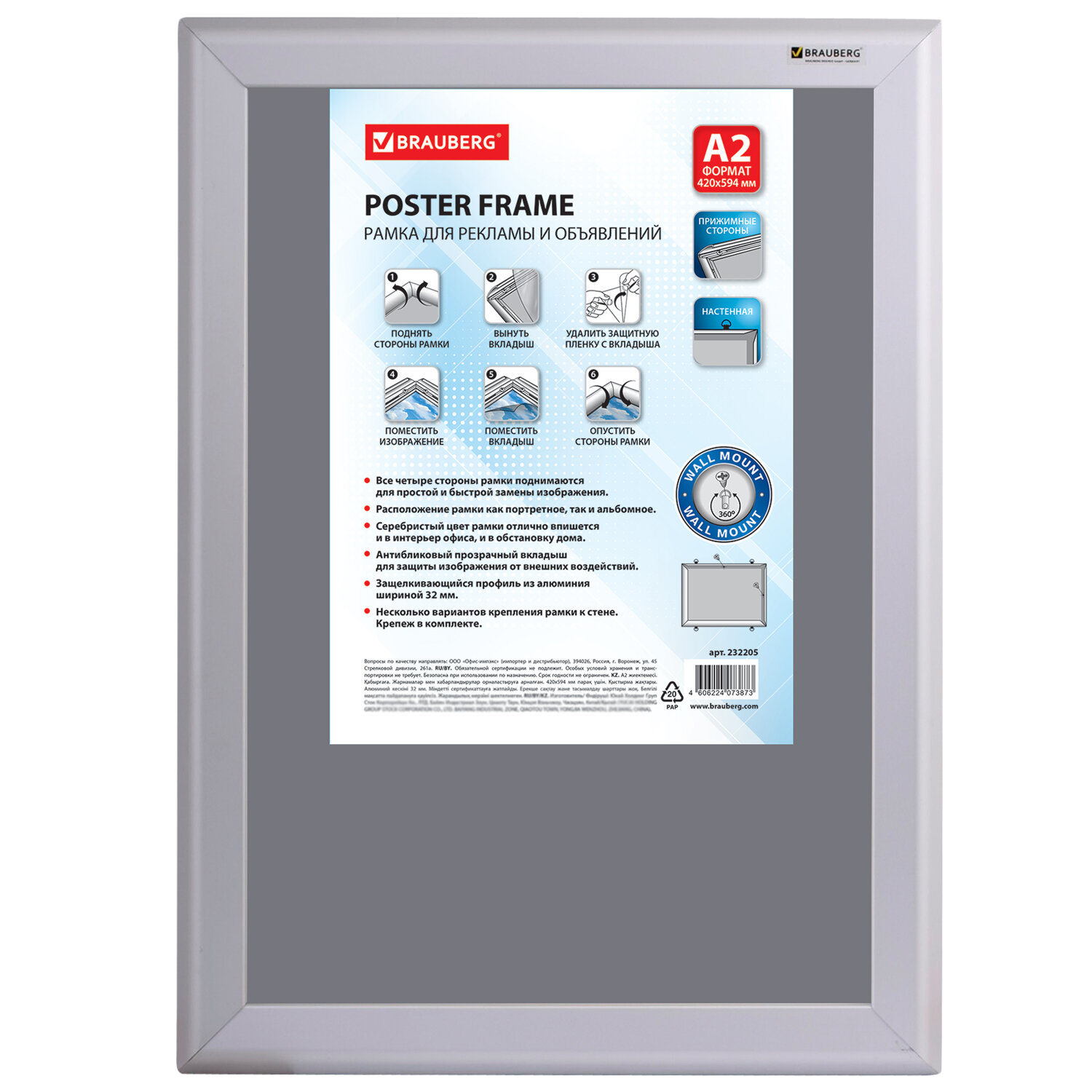 Рамка настенная для рекламы БОЛЬШОГО ФОРМАТА (420х594 мм), алюминиевая, прижимные стороны, BRAUBERG Код товара: 232205 4 236,51 ₽ Купить Производитель:BRAUBERG Настенная рамка BRAUBERG актуальна для рекламных носителей, объявлений и документов, требующих частой замены. Нет необходимости снимать рамку со стены - достаточно поднять прижимные стороны рамки, вынуть антибликовый прозрачный вкладыш и вставить новое изображение. Расположение рамки как портретное, так и альбомное. Элементы крепления прилагаются. Максимальная высота вставляемого листа - 594 мм, максимальная ширина вставляемого листа - 420 мм.Производство: КитайТип товара: рамкаФормат листовки: А2Расположение: универсальноеКрепление к стене/двери: даКоличество отделений: 1Серия: WallВысота вставляемого листа: 594 ммШирина вставляемого листа: 420 ммКоличество в комплекте: 1 шт.Элементы крепления в комплекте: даМатериал: алюминийЦвет: серебристыйВысота: 620 ммШирина: 445 ммГлубина: 15 ммУпаковка: гофрокоробВес: 2,24 кгРазмер упаковки: 4 × 69.2 × 51.4 смОбъём: 0.0142 м3Промежуточная упаковка: 1 штТранспортная упаковка: 1 штШтрих-код: 4606224073873 Файлы Сертификат-1.jpg Сертификат-2.jpg Сертификат-3.jpg Сертификат-4.jpg Сертификат-5.jpg Сертификат-6.jpg Сертификат-7.jpg Сертификат-8.jpg Сертификат-9.jpg Сертификат-10.jpg Сертификат-11.jpg Сертификат-12.jpg Сертификат-13.jpg Сертификат-14.jpg Сертификат-15.jpg Сертификат-16.jpg Сертификат-17.jpg Сертификат-18.jpg Сертификат-19.jpg Сертификат-20.jpg Сертификат-21.jpg Сертификат-22.jpg Сертификат-23.jpg Сертификат-24.jpg Сертификат-25.jpg Сертификат-26.jpg