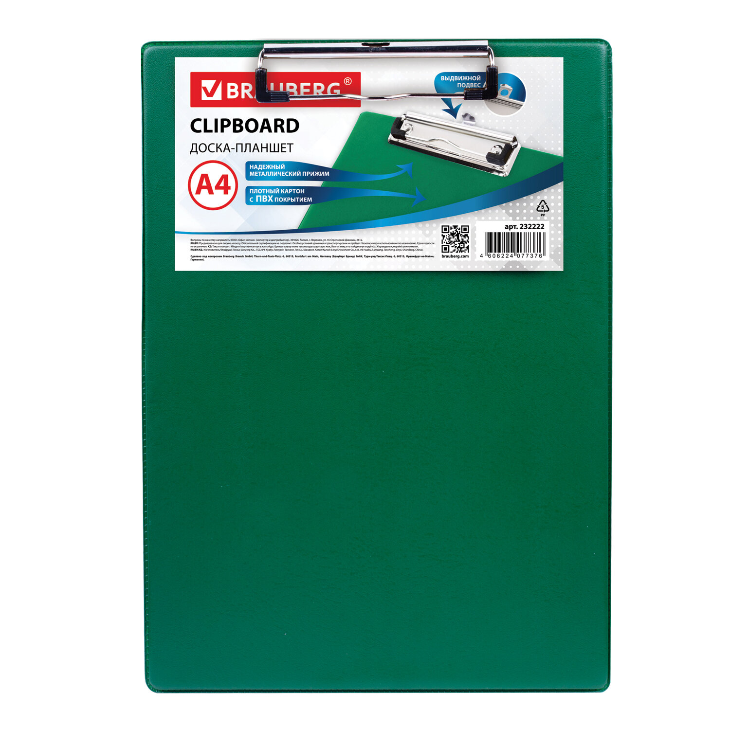 Доска-планшет BRAUBERG "NUMBER ONE" с прижимом А4 (228х318 мм), картон/ПВХ, ЗЕЛЕНАЯ Код товара: 232222 189,12 ₽ Купить Производитель:BRAUBERG Доска-планшет BRAUBERG "NUMBER ONE" используется для работы со счетами, накладными и другими документами. Незаменима при работе на складе, в магазине, при участии в конференциях, выставках и других публичных выступлениях. Доска-планшет формата А4 с верхним прижимом без крышки фиксирует до 90 листов. Изготовлена из плотного картона с покрытием из износоустойчивого ПВХ толщиной 2,8 мм, что позволяет комфортно делать записи на весу. Металлический прижим обеспечивает плотное прилегание документов, а выдвижной подвес позволяет разместить планшет на вертикальной поверхности.Производство: КитайТип папки: без крышкиФормат: А4Расположение прижима: верхнийФиксирует до: 90 листовОсобенности: прижим с выдвижным подвесомСерия: NUMBER ONEМатериал: картон с ПВХ-покрытиемПокрытие: ПВХВысота: 318 ммШирина: 228 ммТолщина: 2.8 ммЦвет: зеленыйВес: 161 грРазмер упаковки: 1.3 × 31.3 × 22.5 смОбъём: 0.0005 м3Промежуточная упаковка: 48 штТранспортная упаковка: 48 штШтрих-код: 4606224077376 Файлы Сертификат-1.jpg Сертификат-2.jpg Сертификат-3.jpg Сертификат-4.jpg Сертификат-5.jpg Сертификат-6.jpg Сертификат-7.jpg Сертификат-8.jpg Сертификат-9.jpg Сертификат-10.jpg Сертификат-11.jpg Сертификат-12.jpg Сертификат-13.jpg Сертификат-14.jpg Сертификат-15.jpg Сертификат-16.jpg Сертификат-17.jpg Сертификат-18.jpg Сертификат-19.jpg Сертификат-20.jpg Сертификат-21.jpg Сертификат-22.jpg Сертификат-23.jpg Сертификат-24.jpg Сертификат-25.jpg Сертификат-26.jpg