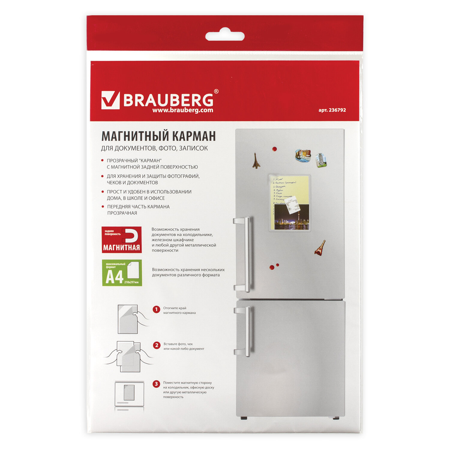 Магнитный карман для документов, фото, записок, формат А4, прозрачный, BRAUBERG Код товара: 236792 488,08 ₽ Купить Производитель:BRAUBERG Магнитный карман BRAUBERG формата А4 предназначен для хранения и защиты документов на любых металлических поверхностях. Ваш маленький помощник для наглядного хранения информации в легкой доступности. Магнитный карман выполнен из пленки для ламинировния (полиэстер >50%) и магнитного материала. Размер 297х210 мм. Прозрачная передняя часть кармана позволяет размещать в него один или несколько документов, фотографий, записок. Например, вы можете повесить самые сложные рецепты или калькулятор калорий на ваш холодильник. Компактный размер позволит с легкостью найти для него место на вашем холодильнике среди любимых магнитов и сувениров из поездок. Магнитный винил на задней поверхности позволяет разместить карман на любых металлических поверхностях. Карман также можно разместить на любой вертикальной поверхности при помощи двусторонней клейкой ленты. Клейкая лента в комплект не входит. Поставляется в индивидуальном пакете с европодвесом.Производство: КитайВид держателя: магнитный винилМагнитное крепление: даДлина: 297 ммШирина: 210 ммМатериал: пленка для ламинирования (содержание полиэстера > 50%), магнитная задняя поверхностьЦвет: прозрачныйВес: 116 грРазмер упаковки: 0.1 × 30.7 × 22.9 смОбъём: 0.0001 м3Промежуточная упаковка: 10 штТранспортная упаковка: 160 штШтрих-код: 4606224172699 Файлы Сертификат-1.jpg Сертификат-2.jpg Сертификат-3.jpg Сертификат-4.jpg Сертификат-5.jpg Сертификат-6.jpg Сертификат-7.jpg Сертификат-8.jpg Сертификат-9.jpg Сертификат-10.jpg Сертификат-11.jpg Сертификат-12.jpg Сертификат-13.jpg Сертификат-14.jpg Сертификат-15.jpg Сертификат-16.jpg Сертификат-17.jpg Сертификат-18.jpg Сертификат-19.jpg Сертификат-20.jpg Сертификат-21.jpg Сертификат-22.jpg Сертификат-23.jpg Сертификат-24.jpg Сертификат-25.jpg Сертификат-26.jpg