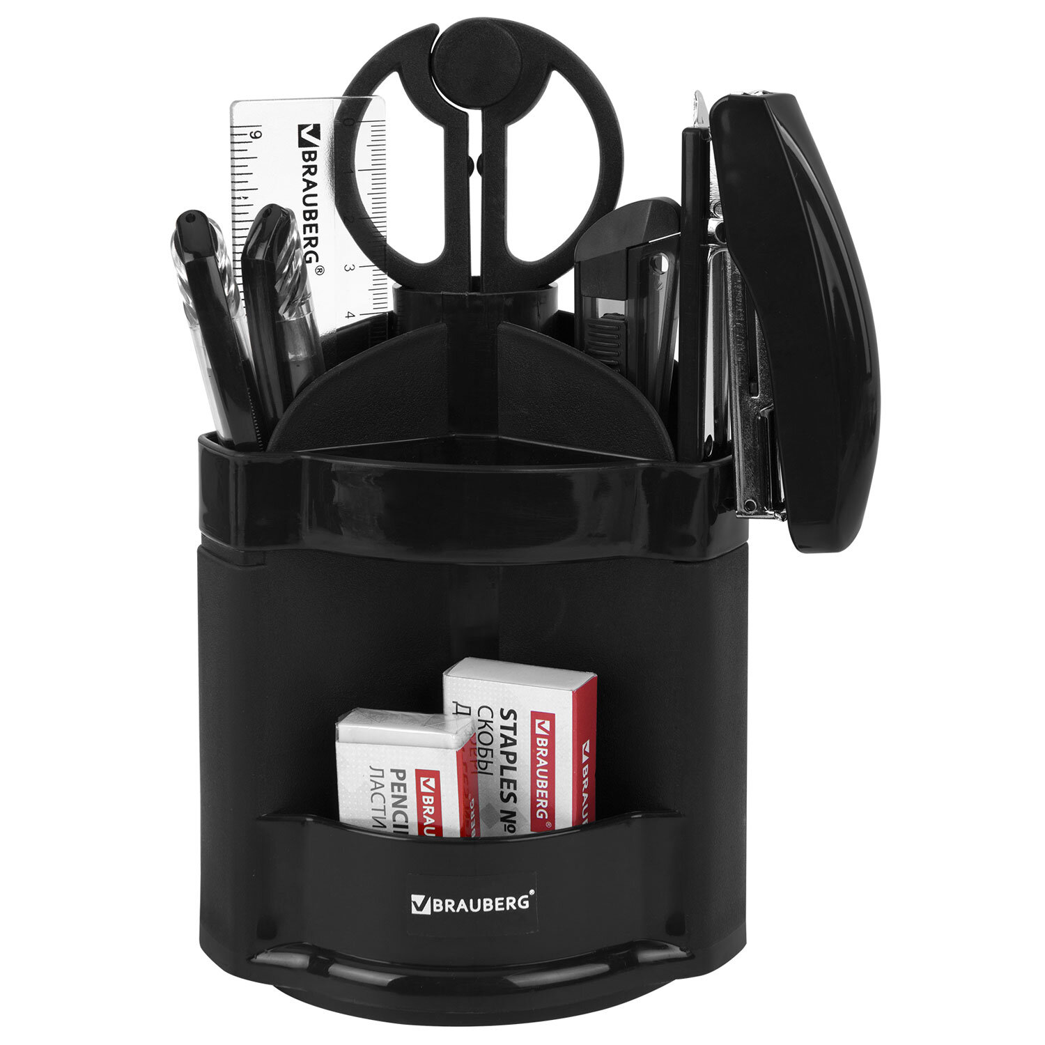 Канцелярский набор BRAUBERG "Офисный 100", 10 предметов, вращающаяся конструкция, черный, блистер Код товара: 236949 1 694,99 ₽ Купить Производитель:BRAUBERG Настольный набор BRAUBERG "Офисный-100" позволяет эффективно и эргономично организовать рабочее место. Вращающаяся на 360 градусов подставка изготовлена из высококачественного пластика и имеет 10 отделений. В наборе 10 предметов: - вращающаяся на 360 градусов подставка; - ножницы, - канцелярский нож, - 2 шариковые ручки, - степлер №10, - скобы для степлера №10, - стирательная резинка, - линейка, - скрепки канцелярские.Производство: Тайвань (Китай)Количество предметов в наборе: 10 шт.Серия: Desk setКоличество отделений: 10Вращающийся: даЦвет: черныйМатериал подставки: пластикВысота: 150 ммШирина: 120 ммГлубина: 120 ммУпаковка: блистер с европодвесомСрок годности: 36 месВес: 501 грРазмер упаковки: 11.6 × 18.2 × 11.7 смОбъём: 0.003 м3Промежуточная упаковка: 36 штТранспортная упаковка: 36 штШтрих-код: 4606224208985 Файлы Сертификат-1.jpg Сертификат-2.jpg Сертификат-3.jpg Сертификат-4.jpg Сертификат-5.jpg Сертификат-6.jpg Сертификат-7.jpg Сертификат-8.jpg Сертификат-9.jpg Сертификат-10.jpg Сертификат-11.jpg Сертификат-12.jpg Сертификат-13.jpg Сертификат-14.jpg Сертификат-15.jpg Сертификат-16.jpg Сертификат-17.jpg Сертификат-18.jpg Сертификат-19.jpg Сертификат-20.jpg Сертификат-21.jpg Сертификат-22.jpg Сертификат-23.jpg Сертификат-24.jpg Сертификат-25.jpg Сертификат-26.jpg
