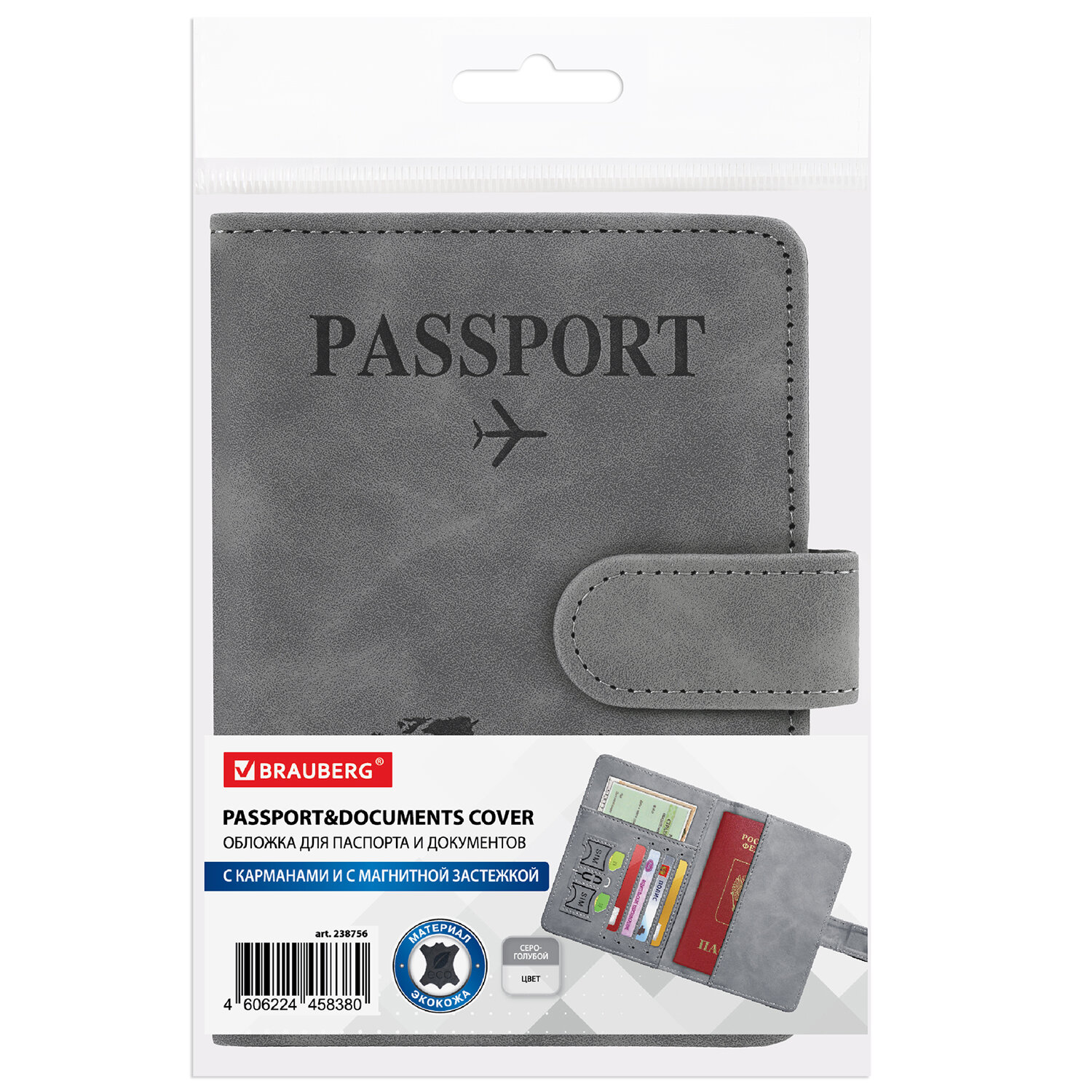 Обложка для паспорта и документов с защитой от считывания, 9 карманов, магнит, экокожа, серо-голубая, BRAUBERG, 238756 Код товара: 238756 339,54 ₽ Купить Производитель:BRAUBERG Обложка для паспорта BRAUBERG защитит документ от износа и загрязнений, сохраняя его аккуратный внешний вид. Модель выполнена из экокожи серо-голубого цвета c приятной на ощупь soft touch-поверхностью и украшена тиснением в виде надписи "Passport", силуэта самолета и карты мира. На внутреннем развороте расположены 9 карманов: 1) Основной карман для паспорта - подходит как для российского, так и для заграничного; 2) Карман для купюр или посадочных билетов; 3) Карманы для карт - 4 шт.; 4) Отделения для сим-карт - 2 шт. + 1 слот для иглы сим-карты. Обложка оснащена RFID защитой - специальной подкладкой, которая блокирует внешний сигнал и препятствует считыванию данных с карт. Важным преимуществом является то, что обложка плотно закрывается благодаря магнитной застежке. Этот многофункциональный аксессуар удобен в путешествиях и повседневной жизни, позволяя хранить все важные документы в одном месте.Производство: КитайМатериал: экокожаСерия: soft-touchТиснение: "Passport", самолет, карта мираРасположение: вертикальноеДизайн: на магнитной застежкеКоличество карманов из прозрачного пластика: 0 шт.Количество карманов из технологичного материала: 0 шт.Количество карманов из кожи: 9 шт.Длина: 149 ммШирина: 106 ммЦвет: серо-голубойВес: 80 грРазмер упаковки: 1.5 × 15.1 × 11.7 смОбъём: 0.0004 м3Промежуточная упаковка: 100 штТранспортная упаковка: 100 штШтрих-код: 4606224458380 Сертификат-1.jpg Сертификат-2.jpg Сертификат-3.jpg