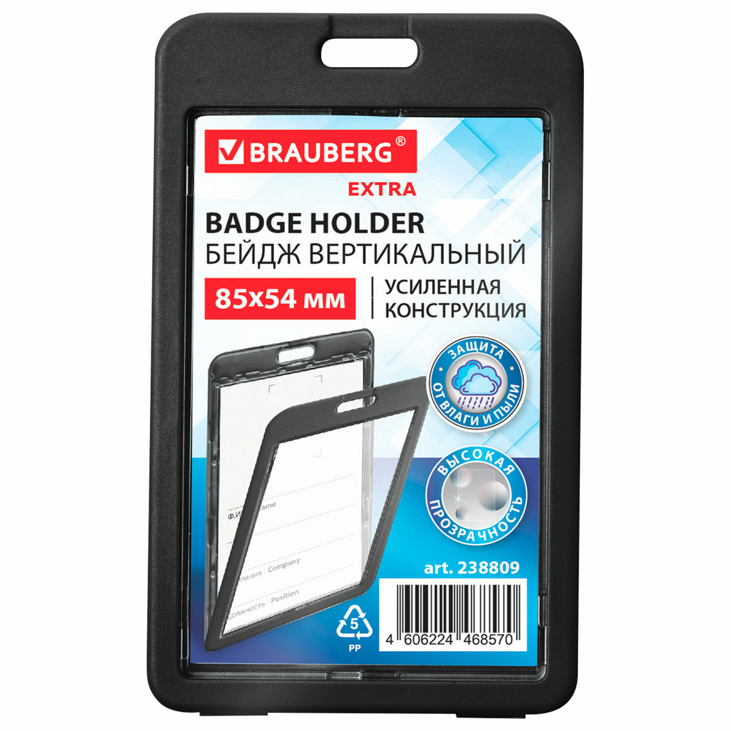 Бейдж вертикальный (85х54 мм), ДВУСТОРОННИЙ, черный, ЗАЩИТА ОТ ВЛАГИ И ПЫЛИ, BRAUBERG EXTRA Код товара: 238809 85,32 ₽ Купить Производитель:BRAUBERG Вертикальный бейдж BRAUBERG предназначен для хранения пропусков и карточек сотрудников, ID-карт, проездных и банковских карт. Бейдж подходит для крепления на ленте, держателе с рулеткой. Изготовлен из жесткого пластика, гарантирующего его долгий срок службы. Защищает от влаги и пыли Вашу карту. Идеально подойдёт для чувствительных к механическим повреждениям магнитных карт и пропусков. Прозрачное окно с обеих сторон бейджа. Размер вкладыша – 85х54 мм. Максимальная толщина пропуска – 2 мм (две стандартных банковских карты). *Вкладыш бейджа без персонализации, на изображении показан возможный пример использования изделия.Производство: КитайТип бейджа: для проездных, пропусков, картТип крепления: без держателяПоложение: вертикальноеКоличество в комплекте: 1 шт.Размер вкладыша (ДхШ): 85х54 ммРазмер бейджа (ДхШ): 110х68 ммСерия: Double-sidedЦвет крепления: нетМатериал корпуса: твердый пластикЦвет корпуса: черныйНаличие картонной вставки: даВес: 30 грРазмер упаковки: 0.6 × 11 × 6.7 смОбъём: 0.0001 м3Промежуточная упаковка: 10 штТранспортная упаковка: 400 штШтрих-код: 4606224468570 Файлы Сертификат-1.jpg Сертификат-2.jpg Сертификат-3.jpg Сертификат-4.jpg Сертификат-5.jpg Сертификат-6.jpg Сертификат-7.jpg Сертификат-8.jpg Сертификат-9.jpg Сертификат-10.jpg Сертификат-11.jpg Сертификат-12.jpg Сертификат-13.jpg Сертификат-14.jpg Сертификат-15.jpg Сертификат-16.jpg Сертификат-17.jpg Сертификат-18.jpg Сертификат-19.jpg Сертификат-20.jpg Сертификат-21.jpg Сертификат-22.jpg Сертификат-23.jpg Сертификат-24.jpg Сертификат-25.jpg Сертификат-26.jpg