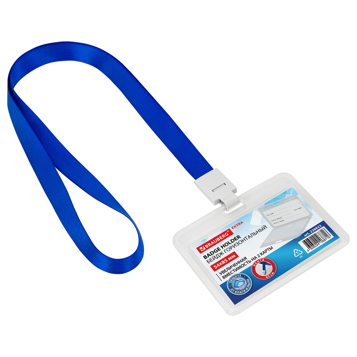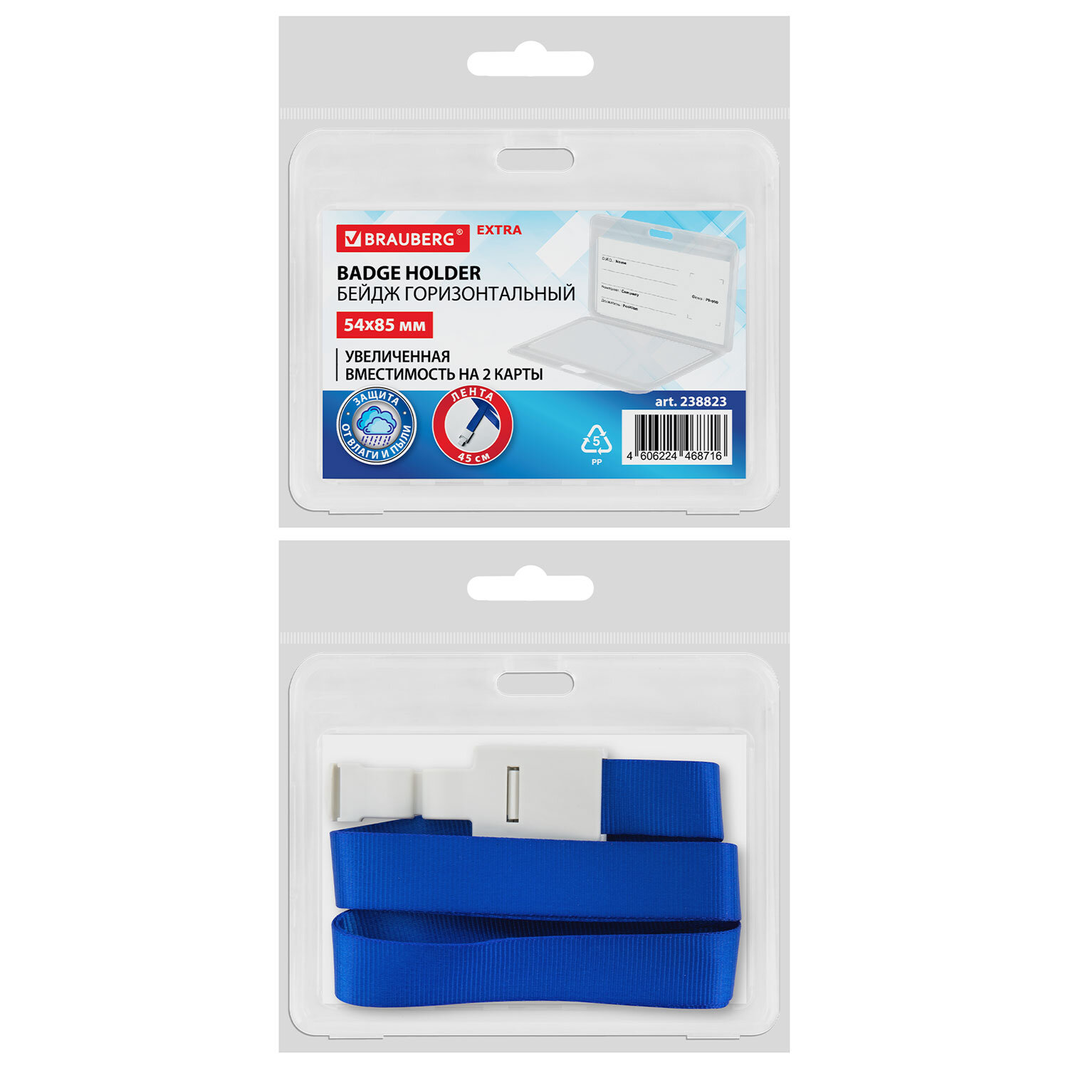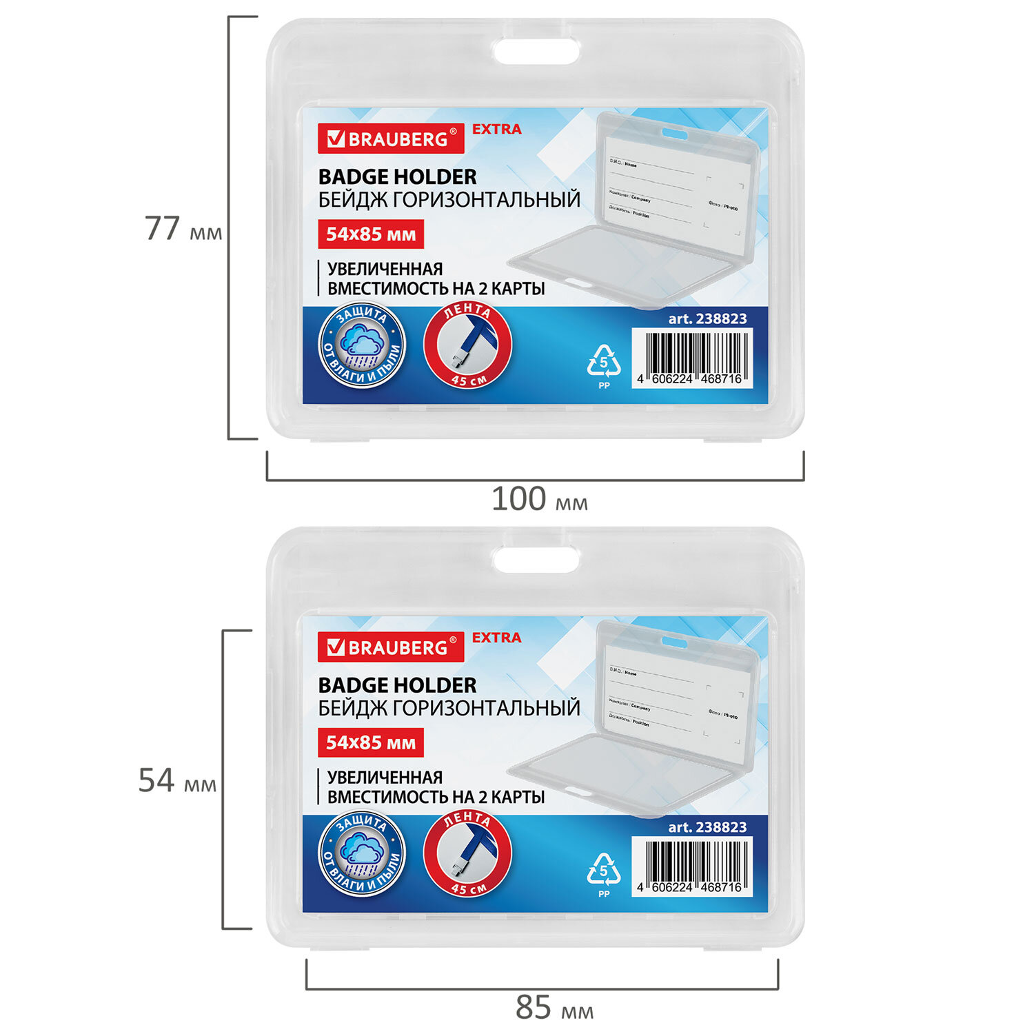Бейдж горизонтальный (54х85 мм) на 2 карты, с лентой 45 см, ЗАЩИТА ОТ ВЛАГИ И ПЫЛИ, BRAUBERG EXTRA Код товара: 238823 60,41 ₽ Купить Производитель:BRAUBERG Горизонтальный бейдж BRAUBERG EXTRA для хранения пропусков и карточек сотрудников, ID-карт, проездных и банковских карт. Бейдж с увеличенной вместимостью на 2 карты и лентой 45 см. Изготовлен из жесткого пластика, гарантирующего долгий срок службы бейджа. Защищает от влаги и пыли Вашу карту. Идеально подойдёт для чувствительных к механическим повреждениям магнитных карт и пропусков. Размер вкладыша – 54х85 мм. Максимальная толщина пропуска – 2 мм (две стандартных банковских карты). *Вкладыш бейджа без персонализации, на изображении показан возможный пример использования изделия.Производство: КитайТип бейджа: для проездных, пропусков, картТип крепления: лентаПоложение: горизонтальноеКоличество в комплекте: 1 шт.Размер вкладыша (ДхШ): 54х85 ммРазмер бейджа (ДхШ): 77х100 ммСерия: Double cardЦвет крепления: синийМатериал корпуса: твердый пластикЦвет корпуса: прозрачныйДлина ленты/шнурка: 45 смНаличие картонной вставки: даВес: 33 грРазмер упаковки: 1.4 × 10.6 × 7.8 смОбъём: 0.0002 м3Промежуточная упаковка: 10 штТранспортная упаковка: 240 штШтрих-код: 4606224468716 Файлы Сертификат-1.jpg Сертификат-2.jpg Сертификат-3.jpg Сертификат-4.jpg Сертификат-5.jpg Сертификат-6.jpg Сертификат-7.jpg Сертификат-8.jpg Сертификат-9.jpg Сертификат-10.jpg Сертификат-11.jpg Сертификат-12.jpg Сертификат-13.jpg Сертификат-14.jpg Сертификат-15.jpg Сертификат-16.jpg Сертификат-17.jpg Сертификат-18.jpg Сертификат-19.jpg Сертификат-20.jpg Сертификат-21.jpg Сертификат-22.jpg Сертификат-23.jpg Сертификат-24.jpg Сертификат-25.jpg Сертификат-26.jpg