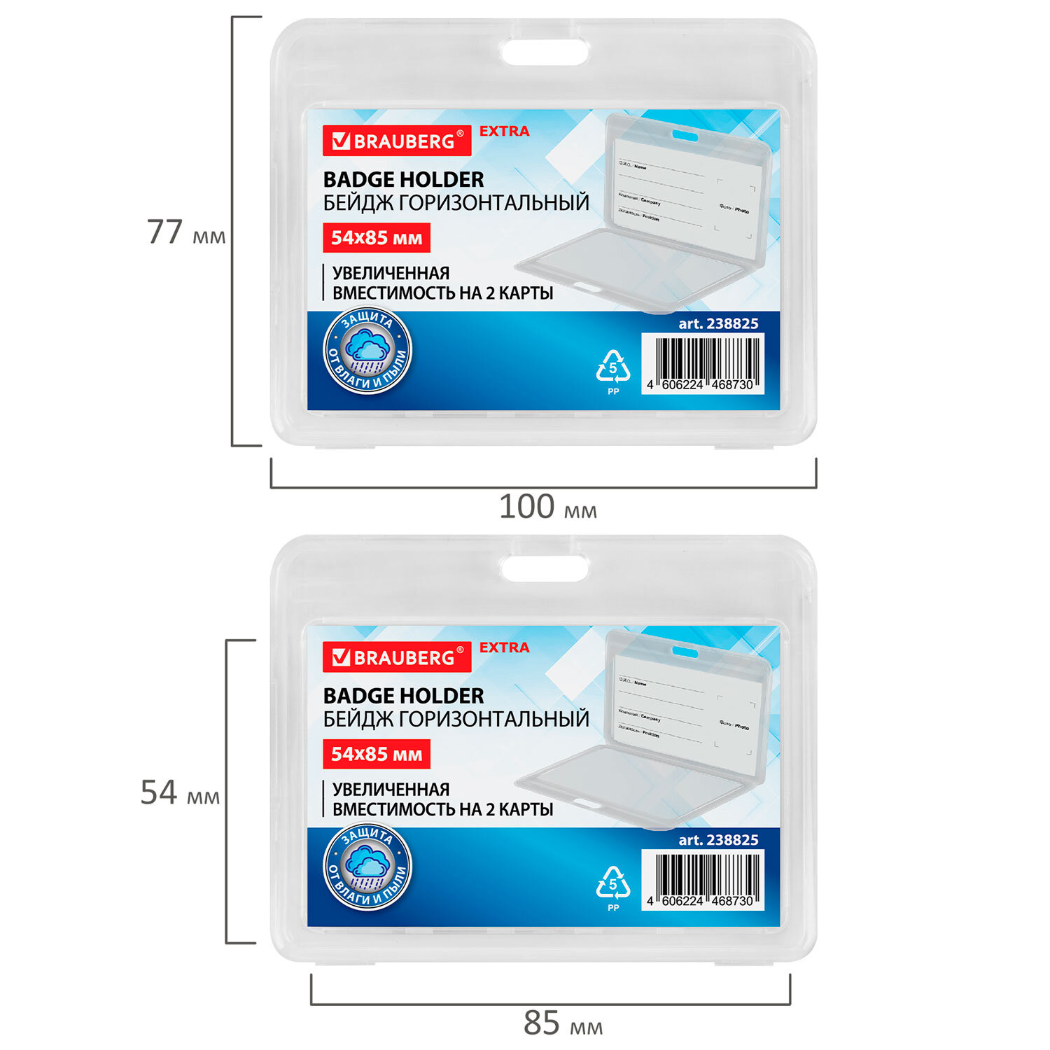 Бейдж горизонтальный (54х85 мм) на 2 карты, прозрачный, ЗАЩИТА ОТ ВЛАГИ И ПЫЛИ, BRAUBERG EXTRA Код товара: 238825 33,24 ₽ Купить Производитель:BRAUBERG Горизонтальный бейдж BRAUBERG EXTRA для хранения пропусков и карточек сотрудников, ID-карт, проездных и банковских карт. Бейдж с увеличенной вместимостью на 2 карты. Изготовлен из жесткого пластика, гарантирующего долгий срок службы бейджа. Защищает от влаги и пыли Вашу карту. Идеально подойдёт для чувствительных к механическим повреждениям магнитных карт и пропусков. Размер вкладыша – 54х85 мм. Максимальная толщина пропуска – 2 мм (две стандартных банковских карты). *Вкладыш бейджа без персонализации, на изображении показан возможный пример использования изделия.Производство: КитайТип бейджа: для проездных, пропусков, картТип крепления: без держателяПоложение: горизонтальноеКоличество в комплекте: 1 шт.Размер вкладыша (ДхШ): 54х85 ммРазмер бейджа (ДхШ): 77х100 ммСерия: Double cardЦвет крепления: нетМатериал корпуса: твердый пластикЦвет корпуса: прозрачныйНаличие картонной вставки: даВес: 21 грРазмер упаковки: 0.6 × 10 × 7.7 смОбъём: 0.0001 м3Промежуточная упаковка: 10 штТранспортная упаковка: 600 штШтрих-код: 4606224468730 Файлы Сертификат-1.jpg Сертификат-2.jpg Сертификат-3.jpg Сертификат-4.jpg Сертификат-5.jpg Сертификат-6.jpg Сертификат-7.jpg Сертификат-8.jpg Сертификат-9.jpg Сертификат-10.jpg Сертификат-11.jpg Сертификат-12.jpg Сертификат-13.jpg Сертификат-14.jpg Сертификат-15.jpg Сертификат-16.jpg Сертификат-17.jpg Сертификат-18.jpg Сертификат-19.jpg Сертификат-20.jpg Сертификат-21.jpg Сертификат-22.jpg Сертификат-23.jpg Сертификат-24.jpg Сертификат-25.jpg Сертификат-26.jpg