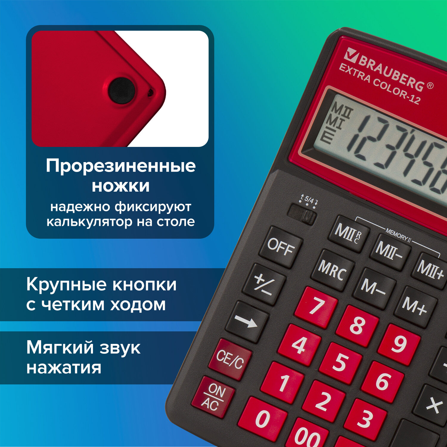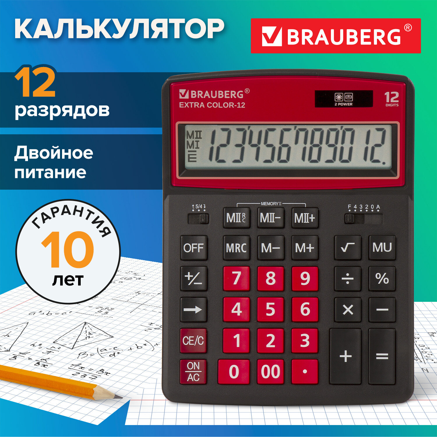 Калькулятор настольный BRAUBERG EXTRA COLOR-12-BKWR (206x155 мм), 12 разрядов, двойное питание, ЧЕРНО-МАЛИНОВЫЙ Код товара: 250479 1 206,35 ₽ Купить Производитель:BRAUBERG Настольный калькулятор BRAUBERG EXTRA COLOR-12-BKWR. Большой дисплей с увеличенным углом обзора, устойчивый корпус и клавиатура с цветной дифференциацией для эффективной работы с максимальным комфортом. Калькулятор производит все основные арифметические действия: возведение в степень, вычисления с процентами, извлечение квадратного корня. Незаменим для бухгалтеров благодаря наличию клавиш двойной памяти, «00» и MU для расчетов налогов и торговой наценки. Переключатели округления и положения десятичного знака позволяют производить нужные настройки. Большой двенадцатиразрядный дисплей отображает большие значения с высокой точностью округления. Встроенный аккумулятор и солнечная батарея позволяют калькулятору работать при любом освещении, а клавиша выключения OFF и функция автоматического отключения (через 8-10 минут бездействия) позволяют максимально продлить срок его службы без замены батареи. Размер - 206x155 мм. Гарантия 10 лет.Производство: КитайРазрядность дисплея: 12Серия: ExtraТип размера: полноразмерныйТип применения: для бухгалтеровСтиль: дизайнерскийФункционал: вычисление наценки (MU)Исполнение: настольныйЧисло строк дисплея: 1Материал кнопок: пластикТип питания: 1 батарейка LR44 (LR1154/AG13), солнечный элементЦвет панели: черно-красныйДлина корпуса: 206 ммШирина корпуса: 155 ммВысота корпуса: 40 ммВес: 349 грРазмер упаковки: 3.4 × 24.2 × 15.8 смОбъём: 0.0019 м3Промежуточная упаковка: 20 штТранспортная упаковка: 40 штШтрих-код: 4606224282480 Сертификат-1.jpg Сертификат-2.jpg Сертификат-3.jpg