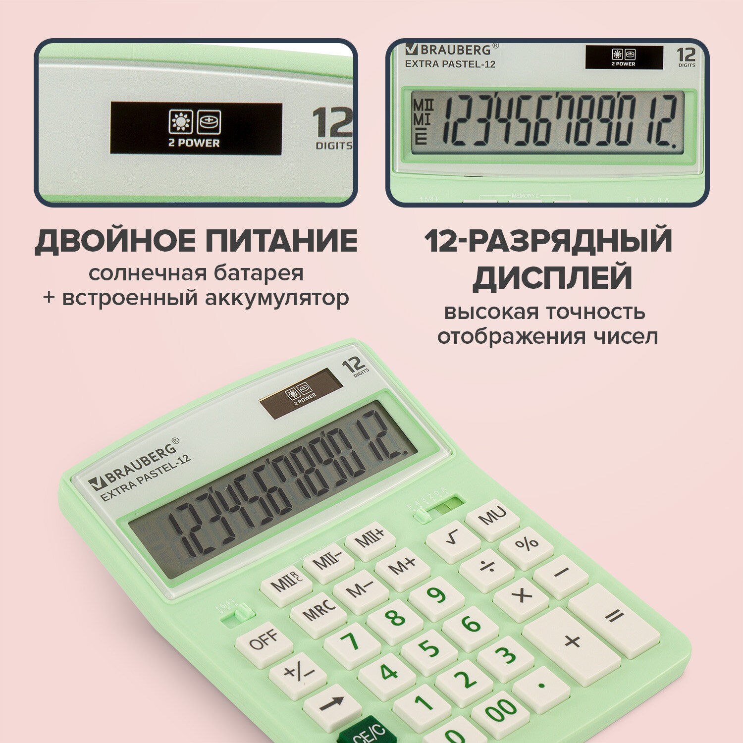 Калькулятор настольный BRAUBERG EXTRA PASTEL-12-LG (206x155 мм), 12 разрядов, двойное питание, МЯТНЫЙ Код товара: 250488 1 206,35 ₽ Купить Производитель:BRAUBERG Настольный калькулятор BRAUBERG EXTRA PASTEL-12-LG. Большой дисплей с увеличенным углом обзора, устойчивый корпус и клавиатура с цветной дифференциацией для эффективной работы с максимальным комфортом. Калькулятор производит все основные арифметические действия: возведение в степень, вычисления с процентами, извлечение квадратного корня. Незаменим для бухгалтеров благодаря наличию клавиш двойной памяти, «00» и MU для расчетов налогов и торговой наценки. Переключатели округления и положения десятичного знака позволяют производить нужные настройки. Большой двенадцатиразрядный дисплей отображает большие значения с высокой точностью округления. Встроенный аккумулятор и солнечная батарея позволяют калькулятору работать при любом освещении, а клавиша выключения OFF и функция автоматического отключения (через 8-10 минут бездействия) позволяют максимально продлить срок его службы без замены батареи. Размер - 206x155 мм. Гарантия 10 лет.Производство: КитайРазрядность дисплея: 12Серия: ExtraТип размера: полноразмерныйТип применения: для бухгалтеровСтиль: дизайнерскийФункционал: вычисление наценки (MU)Исполнение: настольныйЧисло строк дисплея: 1Материал кнопок: пластикТип питания: 1 батарейка LR44 (LR1154/AG13), солнечный элементЦвет панели: мятныйДлина корпуса: 206 ммШирина корпуса: 155 ммВысота корпуса: 40 ммВес: 351 грРазмер упаковки: 4 × 24.3 × 15.9 смОбъём: 0.0019 м3Промежуточная упаковка: 20 штТранспортная упаковка: 40 штШтрих-код: 4606224282572 Сертификат-1.jpg Сертификат-2.jpg Сертификат-3.jpg