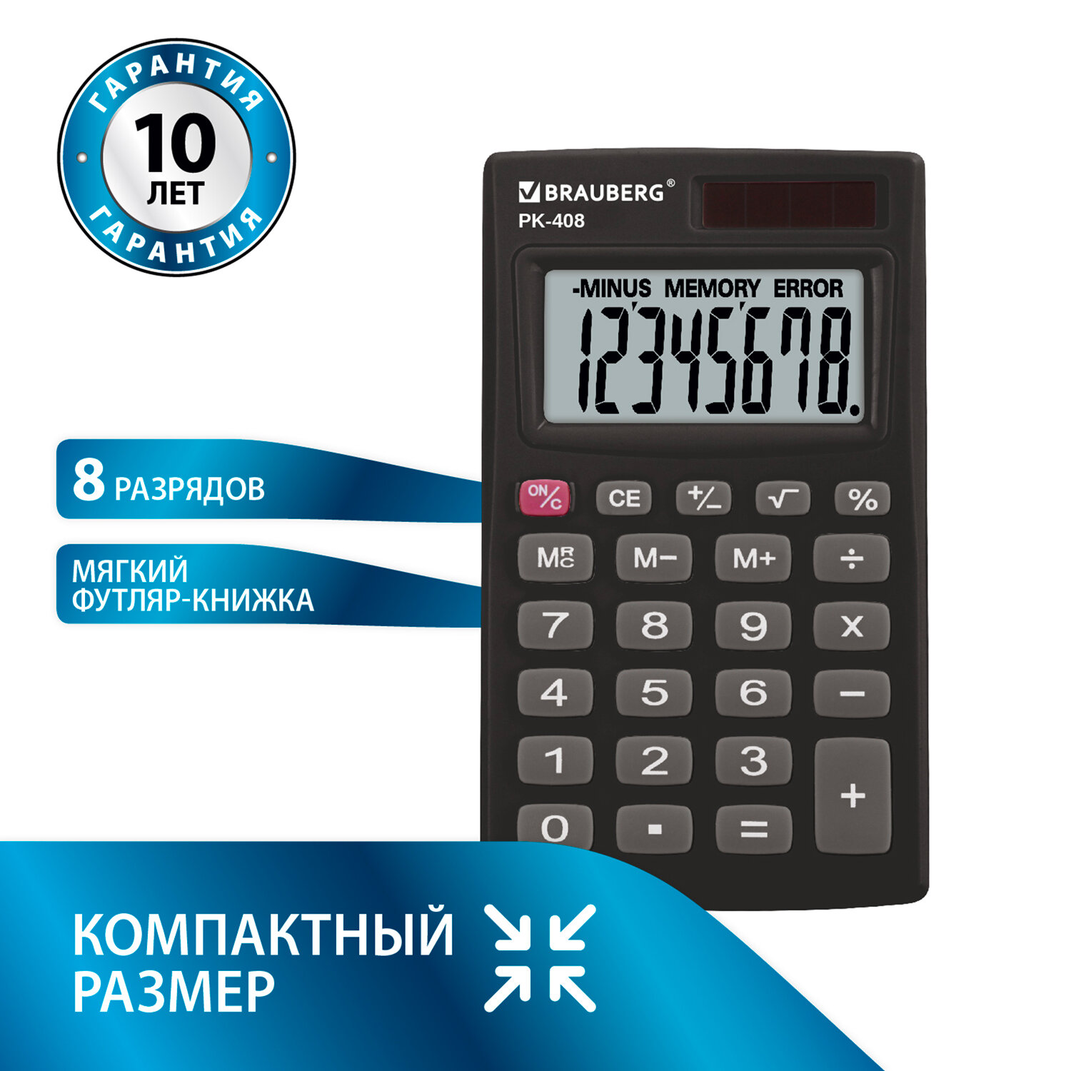 Калькулятор карманный BRAUBERG PK-408-BK (97x56 мм), 8 разрядов, двойное питание, ЧЕРНЫЙ Код товара: 250517 404,09 ₽ Купить Производитель:BRAUBERG Карманный калькулятор BRAUBERG PK-408-BK - компактный, прочный и надежный. Его удобство оценят и взрослые и дети. Калькулятор производит все основные арифметические действия, вычисление с памятью, вычисление с процентами, возведение в степень и извлечение квадратного корня. Вводимые данные и результаты вычислений хорошо видно на большом контрастном дисплее. Встроенный аккумулятор и солнечная батарея позволяют калькулятору работать при любом освещении, а функция автоматического отключения (через 8-10 минут бездействия) позволяет максимально продлить срок его службы без замены батареи. Размер - 97x56 мм. Гарантия 10 лет.Производство: КитайРазрядность дисплея: 8Серия: PK-408Тип питания: 1 батарейка LR54 (LR1130/AG10), солнечный элементКонструктивные особенности: мягкий футляр-книжкаЦвет панели: черныйИсполнение: карманныйМатериал клавиш: резинаДлина корпуса: 97 ммШирина корпуса: 56 ммТолщина корпуса: 9 ммВес: 40 гУпаковка: картонная коробка с европодвесомРазмер упаковки: 1.5 × 12.4 × 6.6 смОбъём: 0.0002 м3Промежуточная упаковка: 100 штТранспортная упаковка: 200 штШтрих-код: 4606224282862 Сертификат-1.jpg Сертификат-2.jpg Сертификат-3.jpg