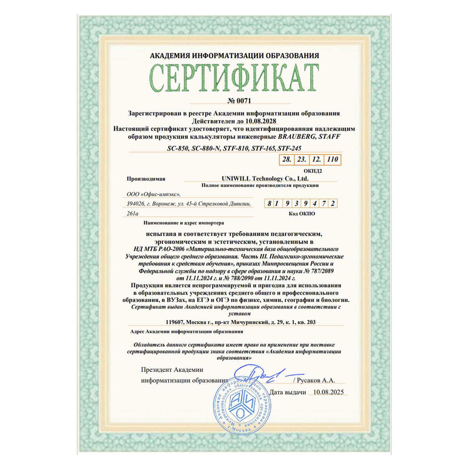 Калькулятор инженерный BRAUBERG SC-850 (163х82 мм), 240 функций, 10+2 разрядов, двойное питание, ЧЕРНЫЙ Код товара: 250525 1 172,31 ₽ Купить Производитель:BRAUBERG Непрограммируемый инженерный калькулятор BRAUBERG SC-850 выполняет все основные вычисления, которые понадобятся школьникам на экзаменах и контрольных работах. Сертифицирован для использования на ЕГЭ и ОГЭ по физике, химии, географии и ОГЭ по биологии. 240 встроенных научных и статистических функций позволяют вычислять степени и корни, площади, объемы, обратные числа, факториалы, случайные числа, логарифмы и антилогарифмы; а также производить статистические расчеты и вычисления с прямыми и обратными гиперболическими и тригонометрическими функциями (в том числе в градусах, радианах и градах). Область памяти позволяет вводить до 79 символов за одно вычисление. Встроенный аккумулятор и солнечная батарея, образующие единую схему питания, позволяют калькулятору работать при любом освещении, а кнопка выключения OFF и функция автоматического отключения (через 8-10 минут бездействия) позволяют максимально продлить срок его службы без замены батареи. Материал кнопок - пластик. Размер – 163х82 мм. Гарантия – 10 лет.Производство: КитайРазрядность дисплея: 12Тип дисплея: жидкокристаллическийКоличество функций: 240 шт.Функционал: алгебраический ввод/вывод данных (S.V.P.A.M.), генерирование случайных чисел, регрессионный анализ, редактор данных с последовательным просмотром, статистические расчеты одной переменнойСертифицирован для ЕГЭ: даЧисло строк дисплея: 2Тип калькулятора: инженерныйСерия: SCКонструктивные особенности: сдвижной пластиковый футлярТип питания: 1 батарейка CR2032, солнечный элементЦвет панели: черныйДлина корпуса: 163 ммШирина корпуса: 82 ммВес: 130 гУпаковка: картонная коробка с европодвесомРазмер упаковки: 2.9 × 19.1 × 8.5 смОбъём: 0.0007 м3Промежуточная упаковка: 20 штТранспортная упаковка: 40 штШтрих-код: 4606224282947 Файлы Приложение-1.pdf Приложение-2.pdf Сертификат-1.jpg Сертификат-2.jpg Сертификат-3.jpg