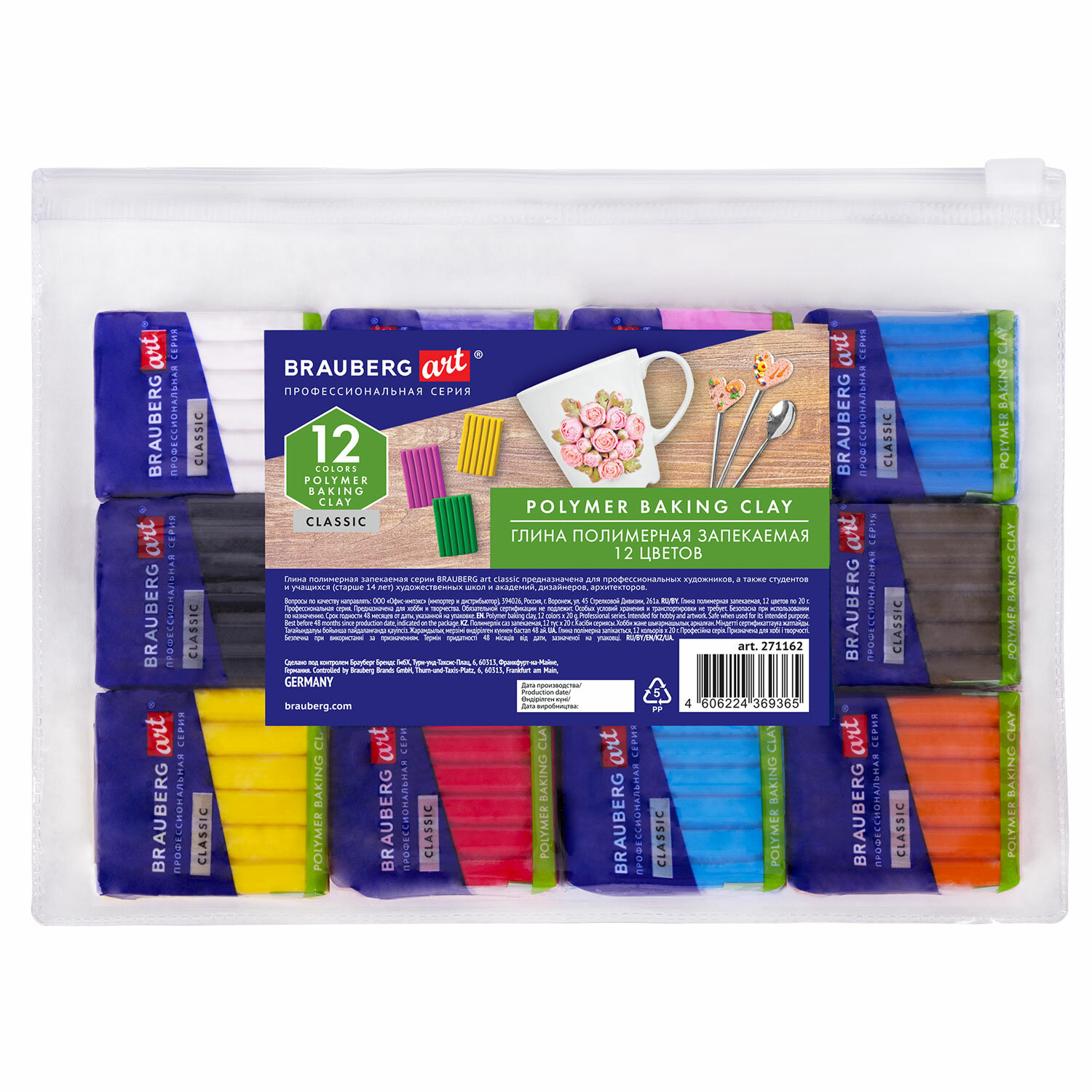 Глина полимерная запекаемая, НАБОР 12 цветов по 20 г, в пакете, BRAUBERG ART CLASSIC Код товара: 271162 305,32 ₽ Купить Производитель:BRAUBERG ART Глина полимерная запекаемая BRAUBERG ART CLASSIC - профессиональная серия. Предназначена для лепки и моделирования, создания игрушек, украшений, предметов интерьера, сувениров. В наборе 12 брусков (по 20 г) полимерной глины ярких и насыщенных цветов. Глина не пачкает и не сушит руки, легко смывается с рук и рабочей поверхности водой или влажными салфетками. Изделия из глины следует запекать в духовке при температуре 130 °С в течение 20-40 минут. Время запекания варьируется в зависимости от толщины изделия и, как правило, составляет 20 минут для толщины заготовки не более 6 мм. После запекания глина становится прочной, не трескается, цвета не тускнеют. Набор упакован в прочный пластиковый пакет с зиппером.Производство: КитайТип товара: глина полимернаяКоличество цветов в наборе: 12 шт. Для запекания: даЦвет: ассортиМасса бруска: 20 гСерия: CLASSICУпаковка: пластиковый пакет с зипперомСрок годности: 48 месВес: 293 грРазмер упаковки: 1.4 × 17.5 × 12.1 смОбъём: 0.0006 м3Промежуточная упаковка: 5 штТранспортная упаковка: 40 штШтрих-код: 4606224369365 Файлы Сертификат-1.jpg Сертификат-2.jpg Сертификат-3.jpg Сертификат-4.jpg Сертификат-5.jpg Сертификат-6.jpg Сертификат-7.jpg Сертификат-8.jpg Сертификат-9.jpg Сертификат-10.jpg Сертификат-11.jpg Сертификат-12.jpg Сертификат-13.jpg Сертификат-14.jpg Сертификат-15.jpg Сертификат-16.jpg Сертификат-17.jpg Сертификат-18.jpg Сертификат-19.jpg Сертификат-20.jpg Сертификат-21.jpg Сертификат-22.jpg Сертификат-23.jpg Сертификат-24.jpg Сертификат-25.jpg Сертификат-26.jpg
