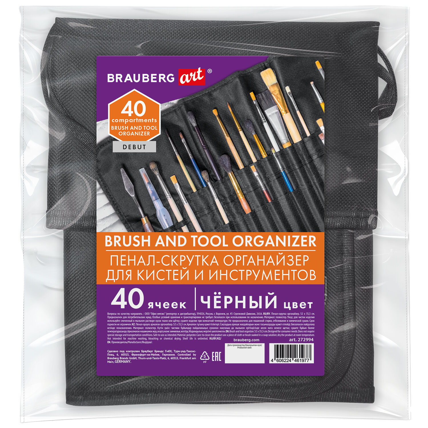 Пенал-скрутка органайзер для кистей и инструментов, 40 ячеек, черный, BRAUBERG ART DEBUT Код товара: 272994 301,4 ₽ Купить Производитель:BRAUBERG ART Пенал-скрутка BRAUBERG ART DEBUT, который можно использовать как органайзер для кистей и инструментов – это идеальное решение для художников, дизайнеров, скульпторов и всех, кто работает с мелкими инструментами. Пенал-скрутка – это компактный и удобный аксессуар, обеспечивающий безопасное хранение и транспортировку ваших любимых кистей и других художественных инструментов. Высококачественные материалы гарантируют долгий срок службы изделия. Внутри пенала предусмотрены 40 специальных отделений для хранения различных типов кистей и инструментов. Размеры пенала (52х35,5 см) позволяют вместить достаточное количество предметов, но при этом сам пенал не занимает много места в сумке или рюкзаке. Приобретая пенал-скрутку BRAUBERG ART DEBUT, вы получаете надежного помощника в организации вашего рабочего процесса. Благодаря ему ваши инструменты всегда будут под рукой и защищены от повреждений.Производство: КитайФорма корпуса: прямоугольнаяМатериал: полиэстерЗастежка: нетКоличество отделений: 40Поставляется без наполнения: даЦвет: черныйВысота: 355 ммШирина: 520 ммГлубина: 5 ммВес: 214 грРазмер упаковки: 2.3 × 19.2 × 17.8 смОбъём: 0.0007 м3Промежуточная упаковка: 12 штТранспортная упаковка: 48 штШтрих-код: 4606224461977 Сертификат-1.jpg Сертификат-2.jpg Сертификат-3.jpg