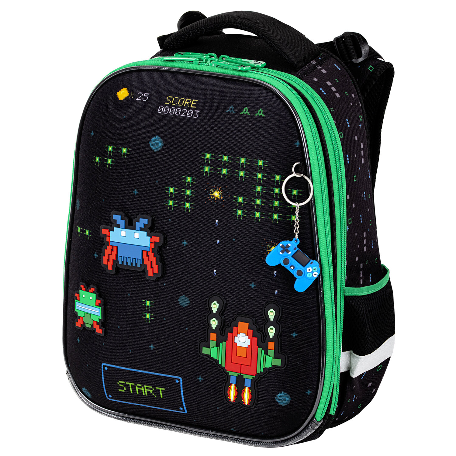 Уникальность данного ранца заключается в использовании резиновых патчей на липучках, которые легко менять местами. Оригинальный брелок в форме геймпада дополняет дизайн ранца.