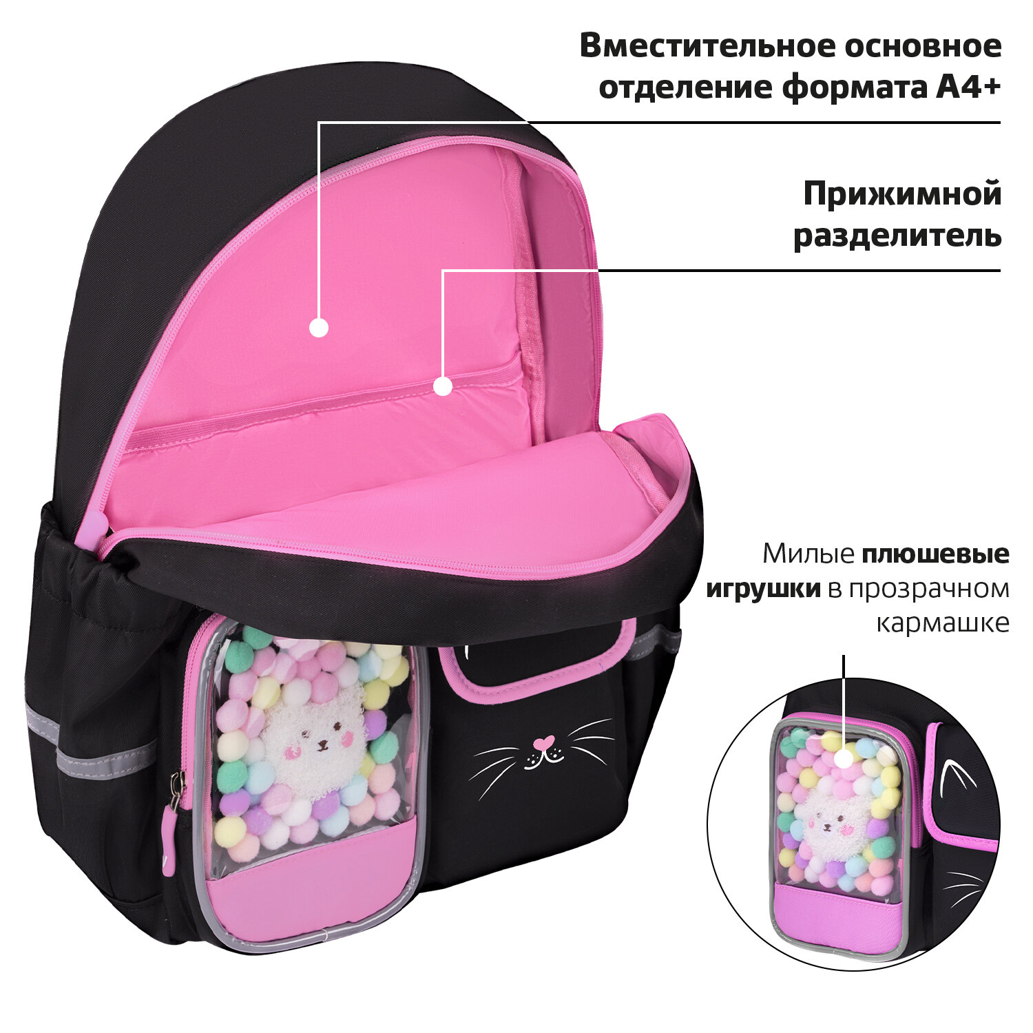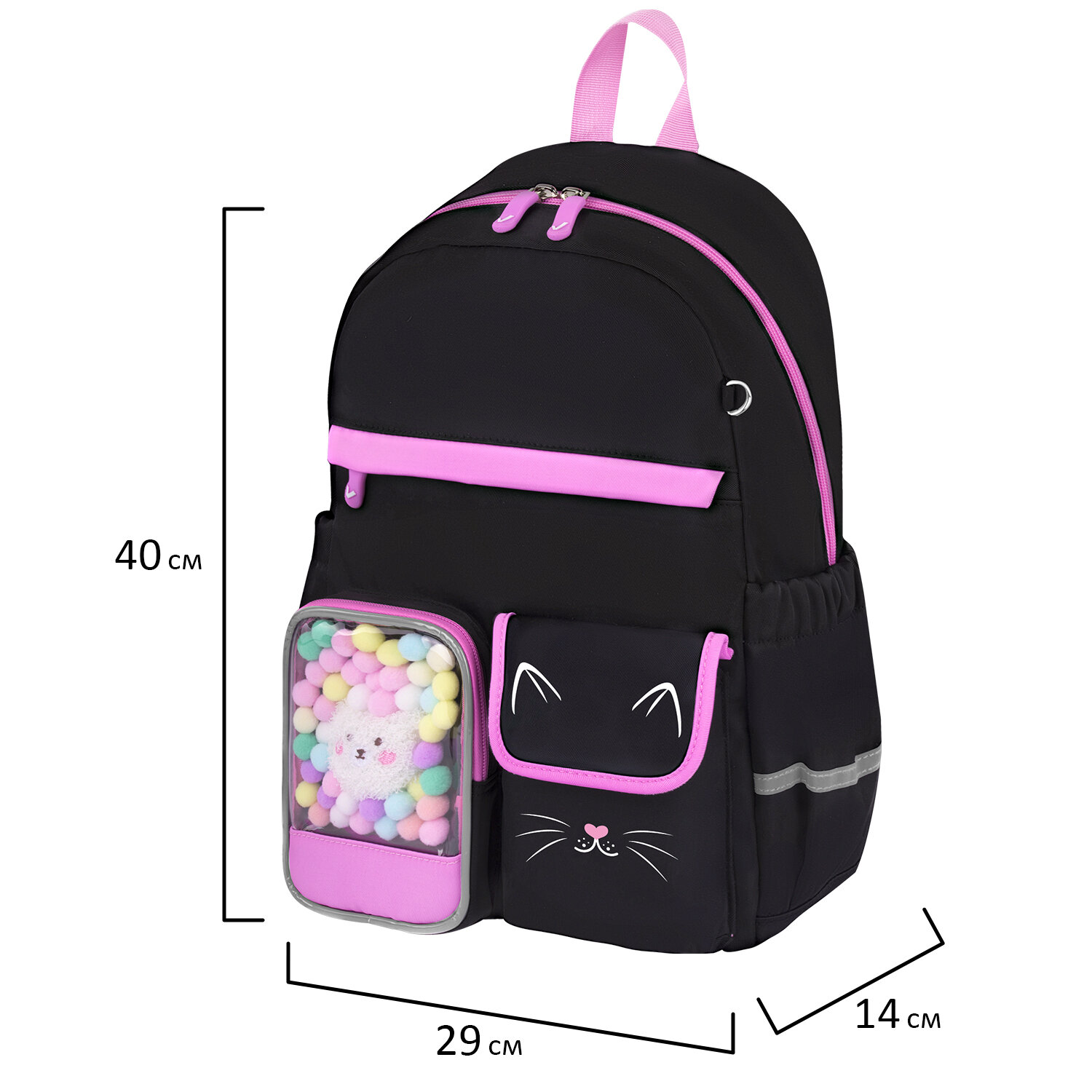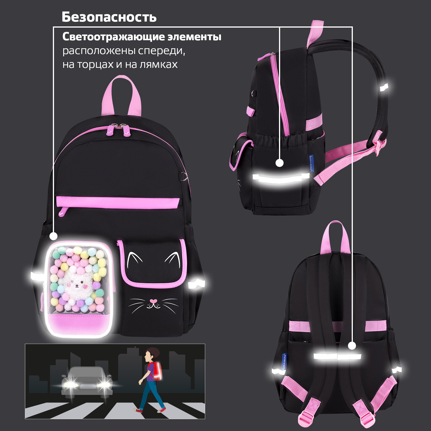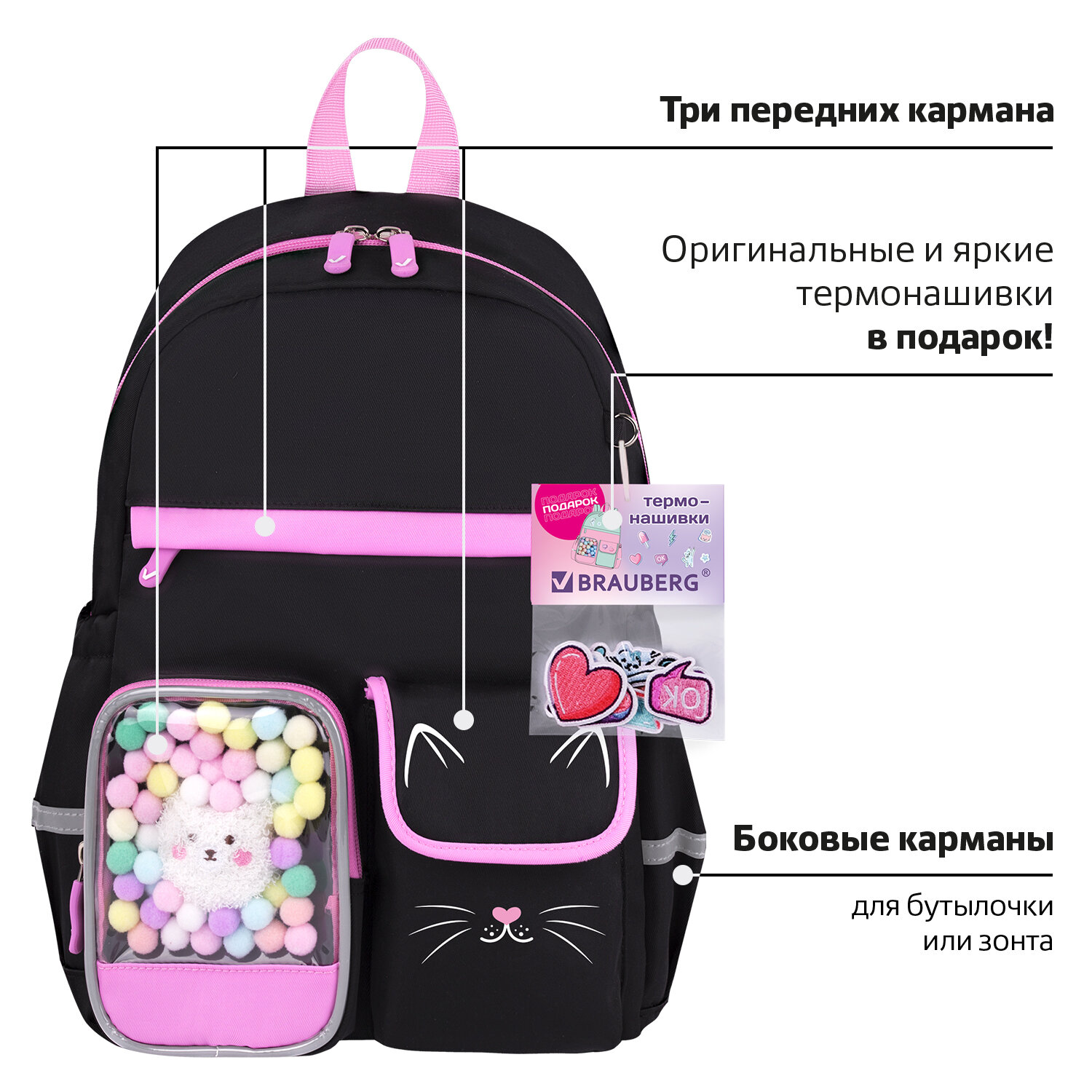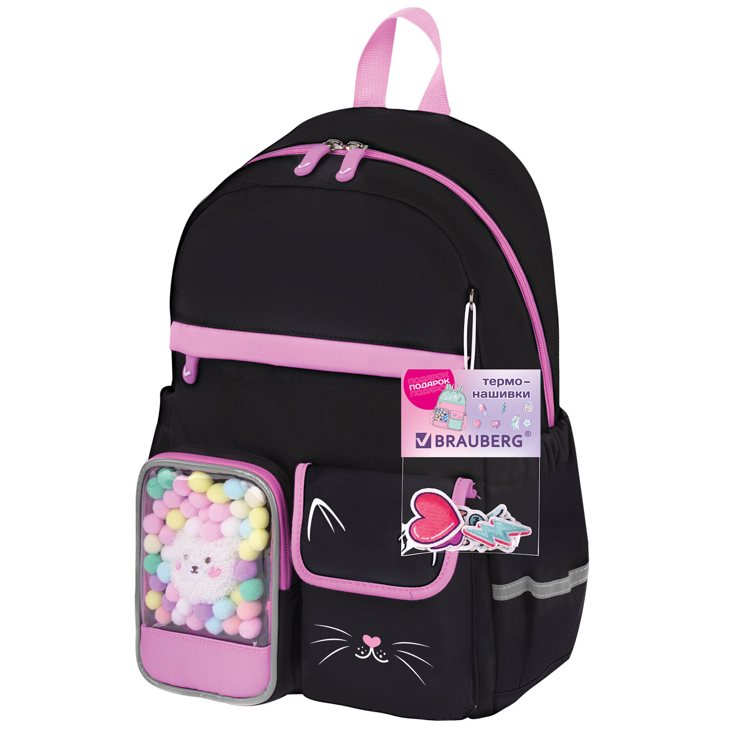Рюкзак BRAUBERG PASTEL с термонашивками в комплекте, "Black kitty", черный, 40х29х14 см Код товара: 273128 3 028,45 ₽ Купить Производитель:BRAUBERG Рюкзаки BRAUBERG серии PASTEL не оставят равнодушными ни одну юную модницу! Оригинальные и яркие термонашивки делают образ уникальным, а милые плюшевые игрушки в прозрачном кармашке понравятся всем без исключения! Термонашивки в подарок! Возможность создать свой неповторимый дизайн: просто размести термонашивки на рюкзаке и тщательно прогладь утюгом в режиме с паром. За несколько минут можно создать уникальный образ! Рюкзак изготовлен из надежного и практичного материала, который легко чистится. Благодаря специальной обработке материал обладает водоотталкивающими свойствами. Уплотненная спинка рюкзака и широкие дышащие лямки S-образной формы обеспечивают максимальный комфорт при ношении. В основном отделении рюкзака легко и удобно размещаются учебники и тетради формата А4+, а также предусмотрен прижимной разделитель. На передней части рюкзака расположены три кармана для различных мелочей: прозрачный карман с ярким декоративным наполнением, карман на липучке и большой карман на молнии. Такая организация отделений поможет ребенку грамотно распределить школьные принадлежности и личные вещи. В боковых карманах на резинке можно разместить бутылочку, термос или зонт. На спинке рюкзака находится отделение на молнии для ценных вещей. Рюкзак удобно носить не только на плечах, но и в руке благодаря прочной ручке. Рюкзак легко открывать и закрывать одной рукой с любой стороны: основное отделение оснащено долговечной реверсивной молнией с двумя стильными бегунками. Светоотражающие элементы расположены спереди, на торцах и на лямках. Они обеспечивают безопасность пользователя в темное время суток. Рюкзак имеет специальное кольцо для крепления брелока, бейджа или школьного пропуска. Яркая этикетка на передней стороне рюкзака делает его более заметным на полке магазина, а информация на ней отражает ключевые потребительские свойства, помогая покупателю принять решение о покупке. Рюкзак упакован в плотный ПЭТ-пакет с замком Zip Lock, что сохраняет его качество и товарный вид при хранении и транспортировке.Производство: КитайПол ребенка: для девочекСерия: PASTELДизайн: Black kittyВозрастная группа: 8-14 летОбъем: 16 лТип спинки: формоустойчиваяКоличество отделений: 1Количество карманов: 6 шт.Фронтальный карман: даБоковые карманы: даСветоотражающие элементы: даНаличие ручки для переноса: даРегулируемые лямки: даВентилируемые лямки: даМатериал спинки: полиэстерМатериал дна: полиэстерЦвет: черныйУзор: котикВысота: 40 смШирина: 29 смГлубина: 14 смДлина лямок: 85 смВес: 0.6 кгРазмер упаковки: 40 × 29 × 4 смОбъём: 0.0088 м3Промежуточная упаковка: 5 штТранспортная упаковка: 10 штШтрих-код: 4606224478159 Файлы Сертификат-1.jpg Сертификат-2.jpg Сертификат-3.jpg