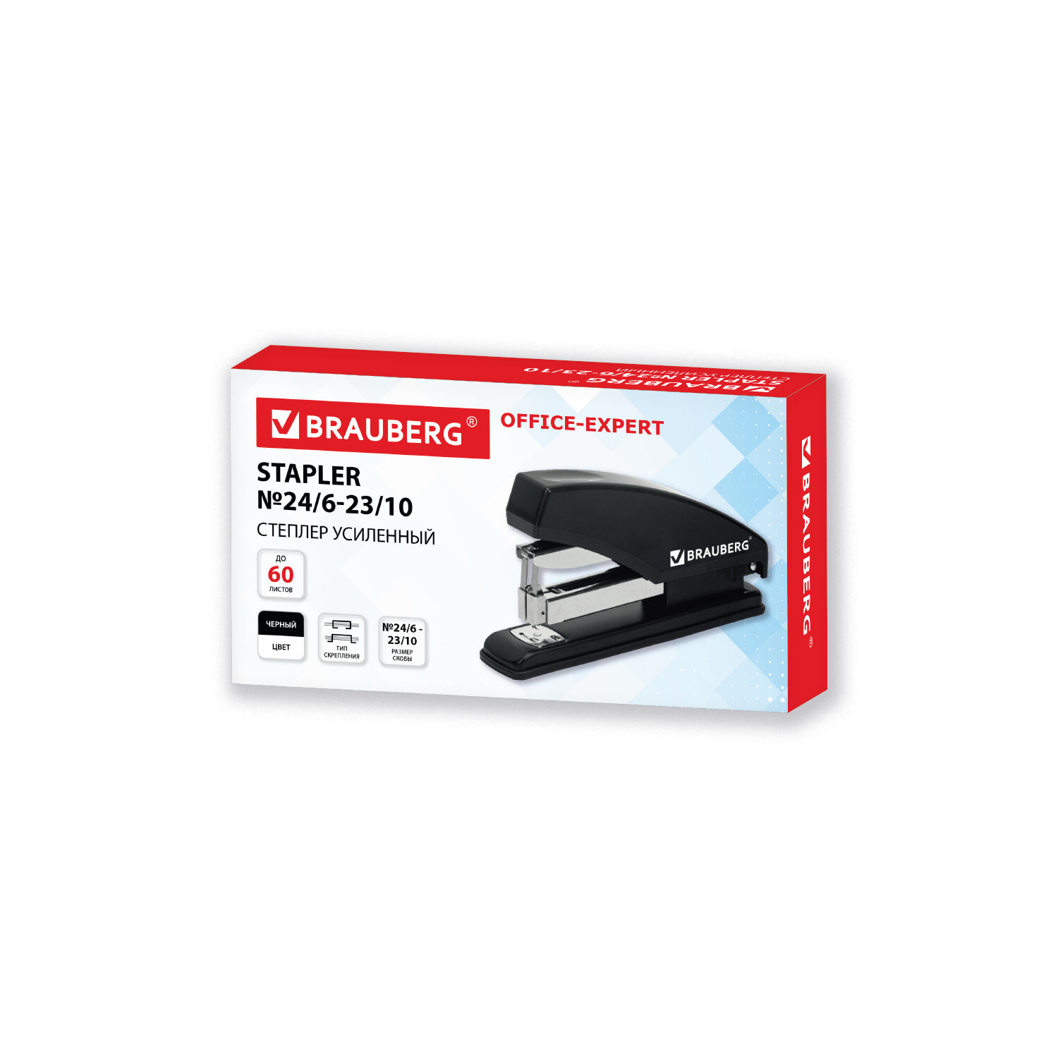 Степлер усиленный до 60 листов, №23/6-23/10 BRAUBERG "Office-Expert", фронтальная загрузка скоб Код товара: 274243 611,64 ₽ Купить Производитель:BRAUBERG Мощный степлер BRAUBERG "Office-Expert" предназначен для работы с большим объемом документов. Рабочий механизм выполнен из металла, корпус – из пластика черного цвета. Способен скрепить до 60 листов бумаги. Подходит для скоб № 24/6, 26/6, № 23/8, 24/8, № 23/10. Глубина закладки бумаги регулируется – до 82 мм. Закрытый и открытый типы сшивания. Фронтальная загрузка скоб.Производство: КитайМаксимальное количество скрепляемых листов: 60Подходящие скобы: № 23/10, № 23/8, 24/8, № 24/6, 26/6Регулируемая глубина сшивания: даВместимость скоб: 100 шт.Наличие линейки: даГлубина закладки бумаги: 82 ммСерия: Office-ExpertВиды сшивания степлером: закрытый, открытыйЗагрузка скоб: фронтальнаяЦвет корпуса: черныйМатериал корпуса: металл\пластикВысота корпуса: 92 ммДлина корпуса: 190 ммШирина корпуса: 39 ммУпаковка: картонная коробкаВес: 350 грРазмер упаковки: 9.2 × 3.9 × 16.7 смОбъём: 0.0009 м3Промежуточная упаковка: 12 штТранспортная упаковка: 48 штШтрих-код: 4606224517971 Файлы