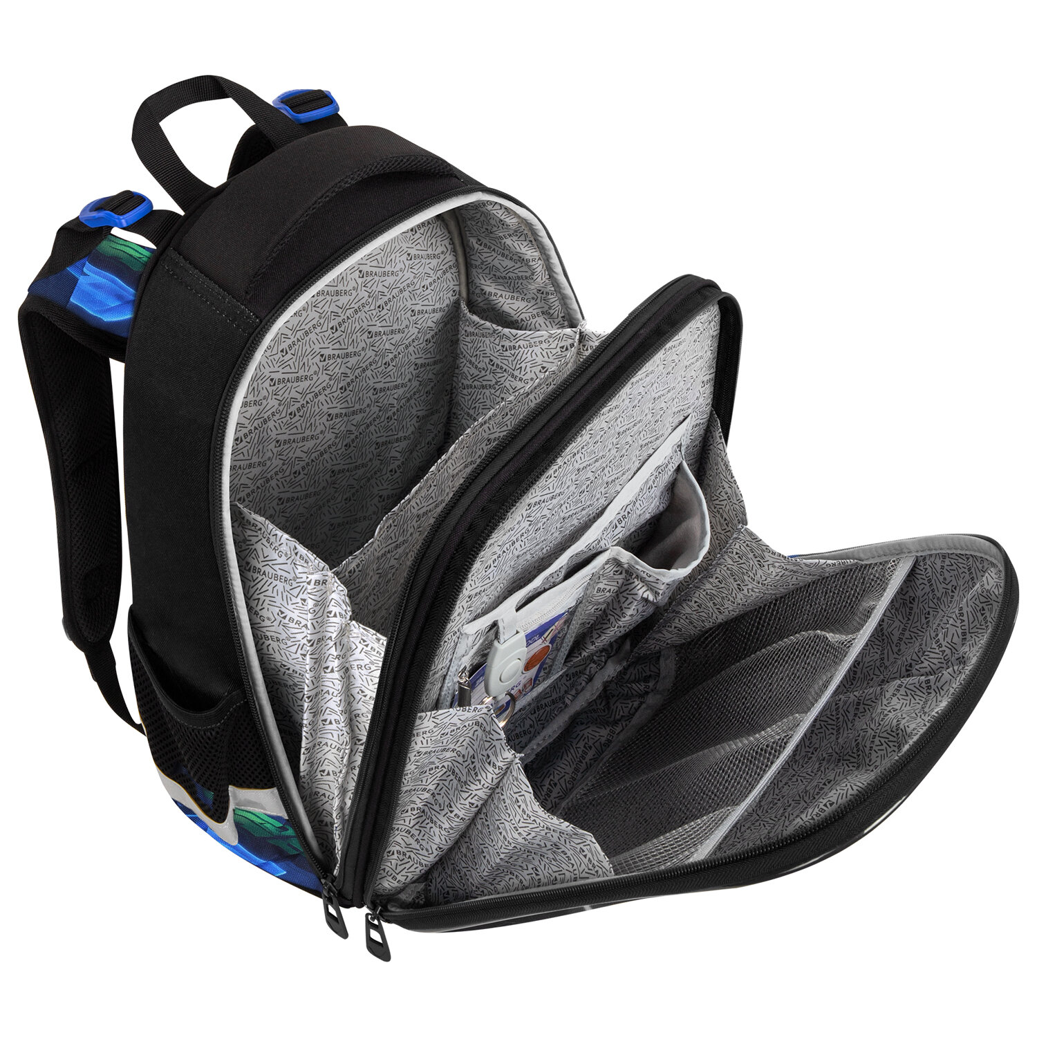 В основном отделении ранца можно легко и быстро разместить учебники и тетради. Внутри фронтального отделения находится органайзер для канцелярских принадлежностей, именная карточка, карман для телефона, съёмный карабин для ключей и большое отделение из сетки. Такая организация пространства поможет сохранить принадлежности в порядке и приучить ребенка к аккуратности. Ранец широко раскрывается, что повышает удобство использования, а за счёт боковых перегородок содержимое не выскользнет из ранца.