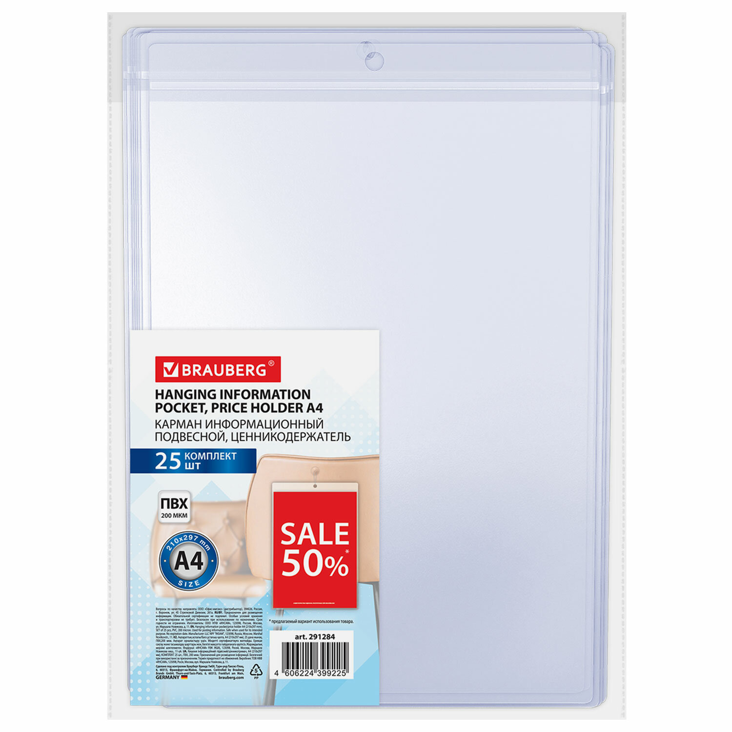 Карман информационный подвесной, ценникодержатель А4, КОМПЛЕКТ 25 шт., ПВХ, BRAUBERG Код товара: 291284 688,12 ₽ Купить Производитель:BRAUBERG Карман информационный подвесной BRAUBERG предназначен для вертикального размещения ценников, рекламных и других информационных объявлений в магазинах и торговых залах. Карман имеет круглое отверстие для подвешивания ценника при помощи нейлоновых хомутов или веревочных биркодержателей. Предусматривает двустороннее размещение с верхней стороны. Формат: А4. Материал изготовления: мягкий ПВХ. Размер одного кармана - 21,7х30,5х0,1 см. Единица продажи - 25 шт., упакованы в пакет с липким краем.Производство: РоссияТип товара: ценникодержательРасположение ценника: вертикальноеДвухсторонний: даКрепление: нетСерия: pocketКоличество в упаковке: 25 шт.Материал: ПВХЦвет: прозрачныйВысота: 300 ммШирина: 220 ммГлубина: 15 ммТолщина: 0.2 ммВес: 773 грРазмер упаковки: 1.3 × 32.9 × 22 смОбъём: 0.0012 м3Промежуточная упаковка: 12 штТранспортная упаковка: 12 штШтрих-код: 4606224399225 Файлы Сертификат-1.jpg Сертификат-2.jpg Сертификат-3.jpg Сертификат-4.jpg Сертификат-5.jpg Сертификат-6.jpg Сертификат-7.jpg Сертификат-8.jpg Сертификат-9.jpg Сертификат-10.jpg Сертификат-11.jpg Сертификат-12.jpg Сертификат-13.jpg Сертификат-14.jpg Сертификат-15.jpg Сертификат-16.jpg Сертификат-17.jpg Сертификат-18.jpg Сертификат-19.jpg Сертификат-20.jpg Сертификат-21.jpg Сертификат-22.jpg Сертификат-23.jpg Сертификат-24.jpg Сертификат-25.jpg Сертификат-26.jpg