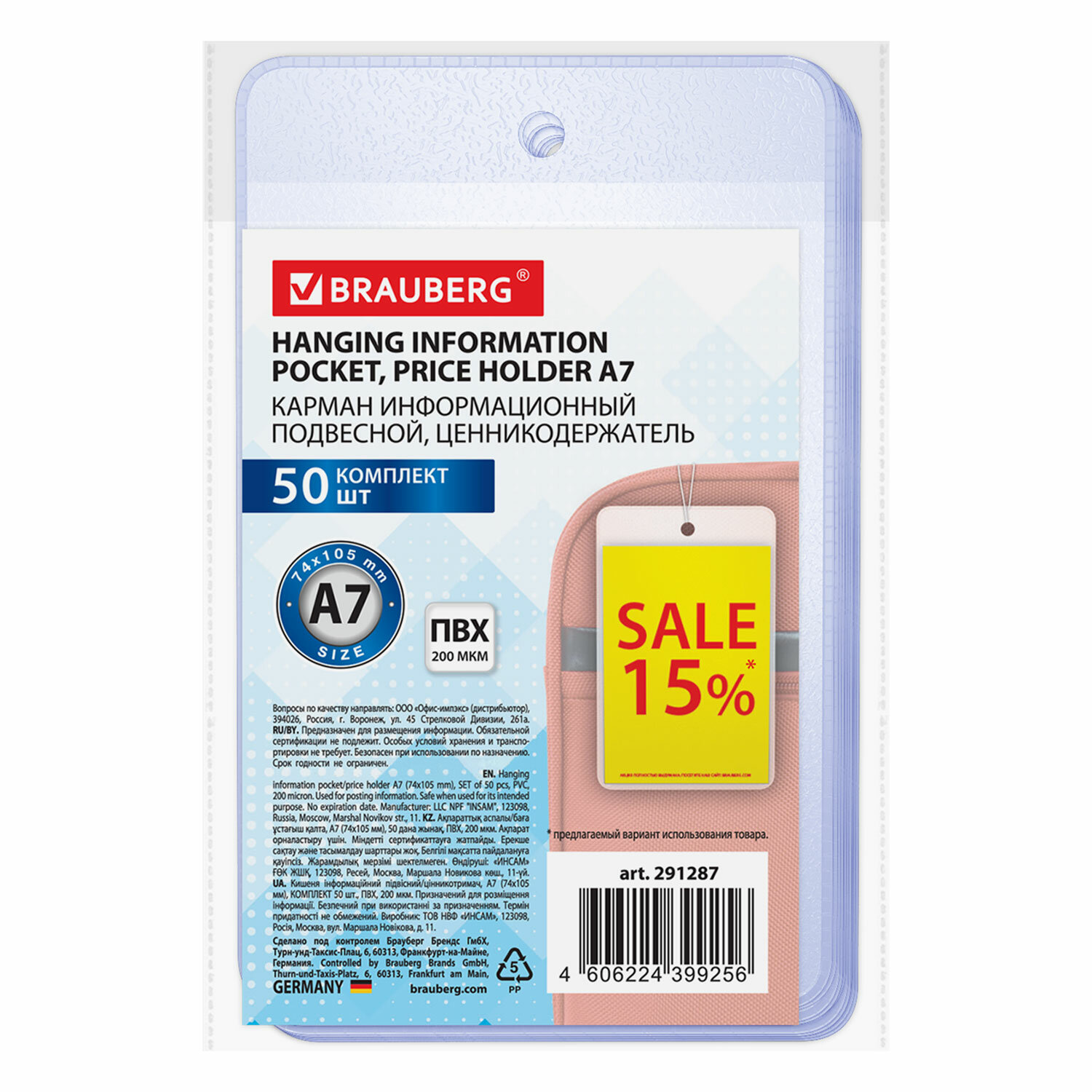 Карман информационный подвесной, ценникодержатель А7, КОМПЛЕКТ 50 шт., ПВХ, BRAUBERG Код товара: 291287 376 ₽ Купить Производитель:BRAUBERG Карман информационный подвесной BRAUBERG предназначен для вертикального размещения ценников, рекламных и других информационных объявлений в магазинах и торговых залах. Карман имеет круглое отверстие для подвешивания ценника при помощи нейлоновых хомутов или веревочных биркодержателей. Предусматривает двустороннее размещение с верхней стороны. Формат: А7. Материал изготовления: мягкий ПВХ. Размер одного кармана: 8,1х11,4х0,1 см. Единица продажи: 50 шт., упакованные в пакет с липким краем.Производство: РоссияТип товара: ценникодержательРасположение ценника: вертикальноеДвухсторонний: даКрепление: нетСерия: pocketКоличество в упаковке: 50 шт.Материал: ПВХЦвет: прозрачныйВысота: 120 ммШирина: 90 ммГлубина: 25 ммТолщина: 0.2 ммВес: 225 грРазмер упаковки: 2.8 × 13 × 9.2 смОбъём: 0.0005 м3Промежуточная упаковка: 30 штТранспортная упаковка: 30 штШтрих-код: 4606224399256 Файлы Сертификат-1.jpg Сертификат-2.jpg Сертификат-3.jpg Сертификат-4.jpg Сертификат-5.jpg Сертификат-6.jpg Сертификат-7.jpg Сертификат-8.jpg Сертификат-9.jpg Сертификат-10.jpg Сертификат-11.jpg Сертификат-12.jpg Сертификат-13.jpg Сертификат-14.jpg Сертификат-15.jpg Сертификат-16.jpg Сертификат-17.jpg Сертификат-18.jpg Сертификат-19.jpg Сертификат-20.jpg Сертификат-21.jpg Сертификат-22.jpg Сертификат-23.jpg Сертификат-24.jpg Сертификат-25.jpg Сертификат-26.jpg